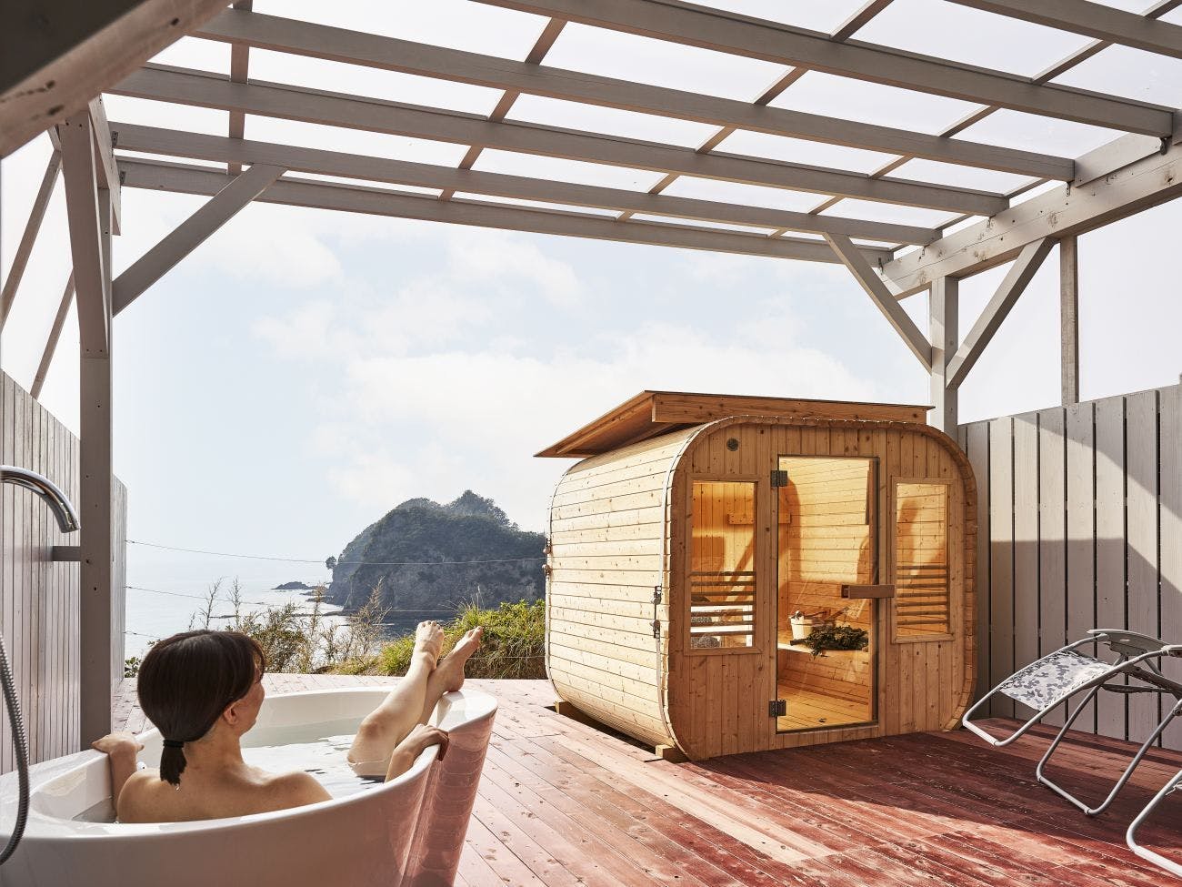 ウッドデッキテラスの温泉露天風呂とバレルサウナからは西伊豆の海と三四郎島、海に沈む夕陽を望む事ができます。客室の露天風呂では、より開放感を味わっていただくために専用の湯浴み着をご用意しております。(1Fロビーにて湯浴み着貸出)