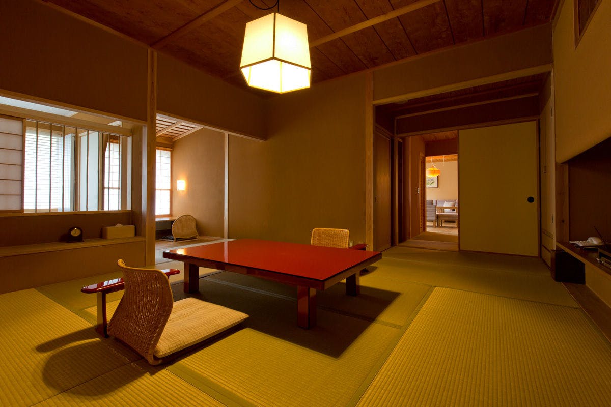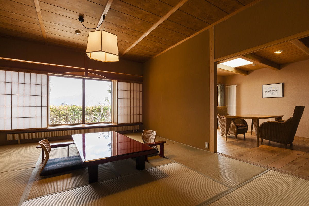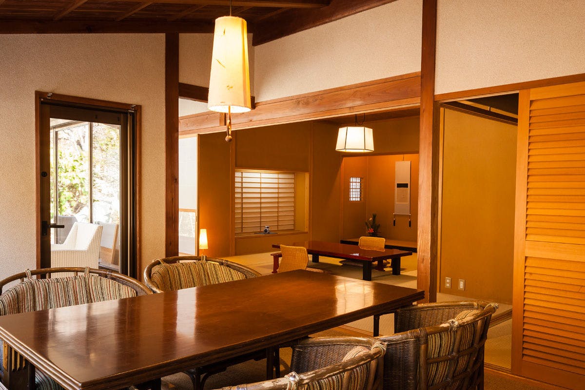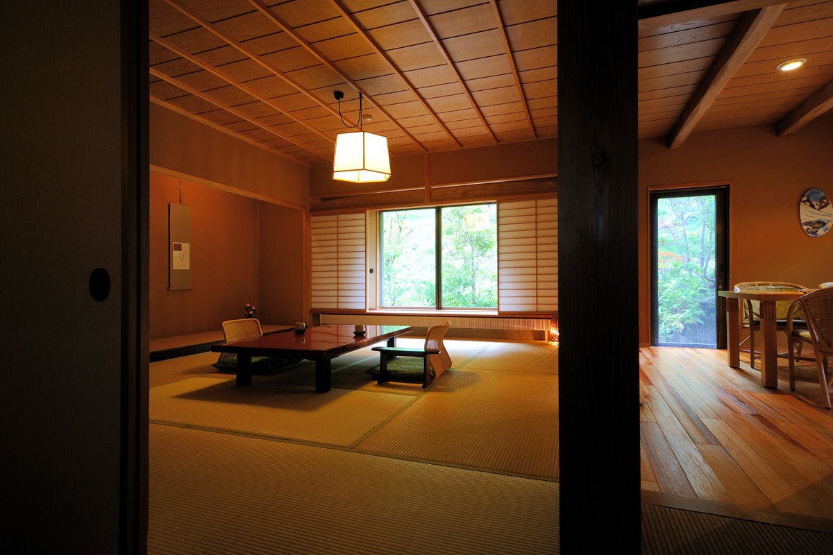モダンな雰囲気漂うベッドルームと、広々とした和室。 お部屋からは、四季折々の美しいお庭をご覧いただけます。 周りを気にすることなく、完全なプライベート空間をお楽しみ下さい。