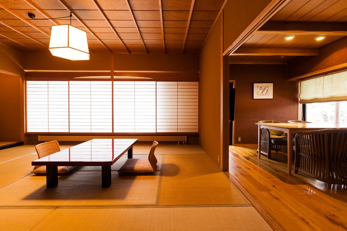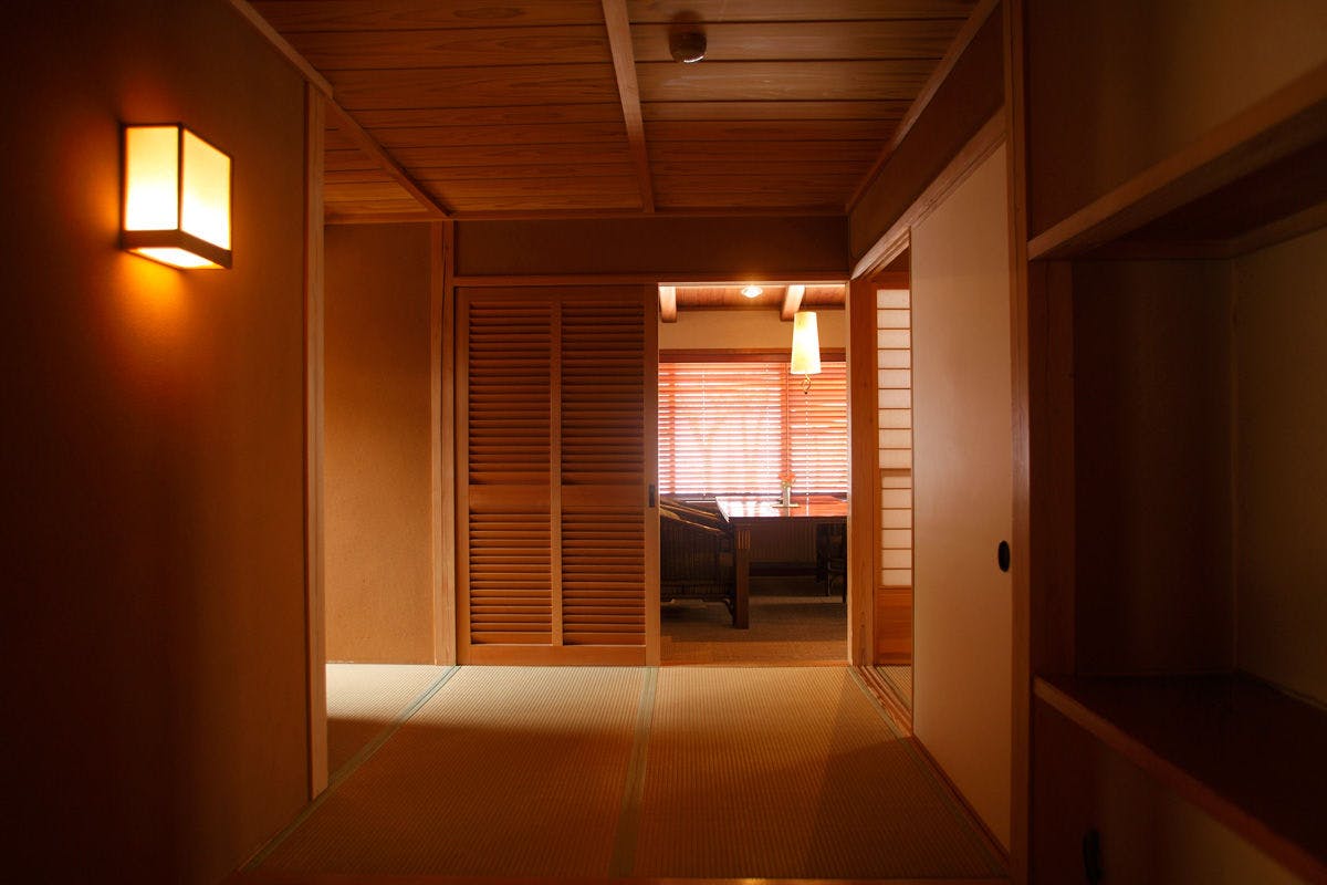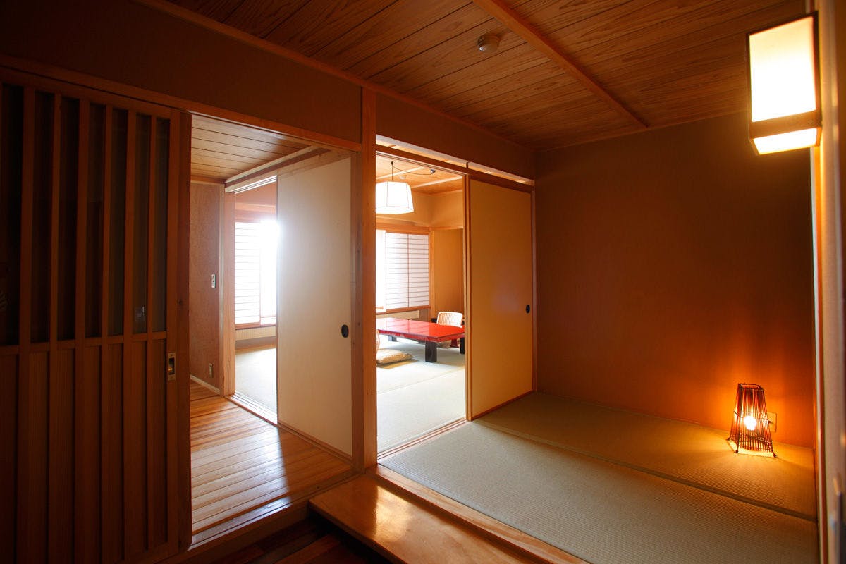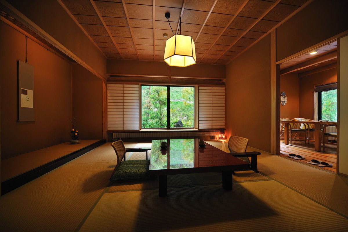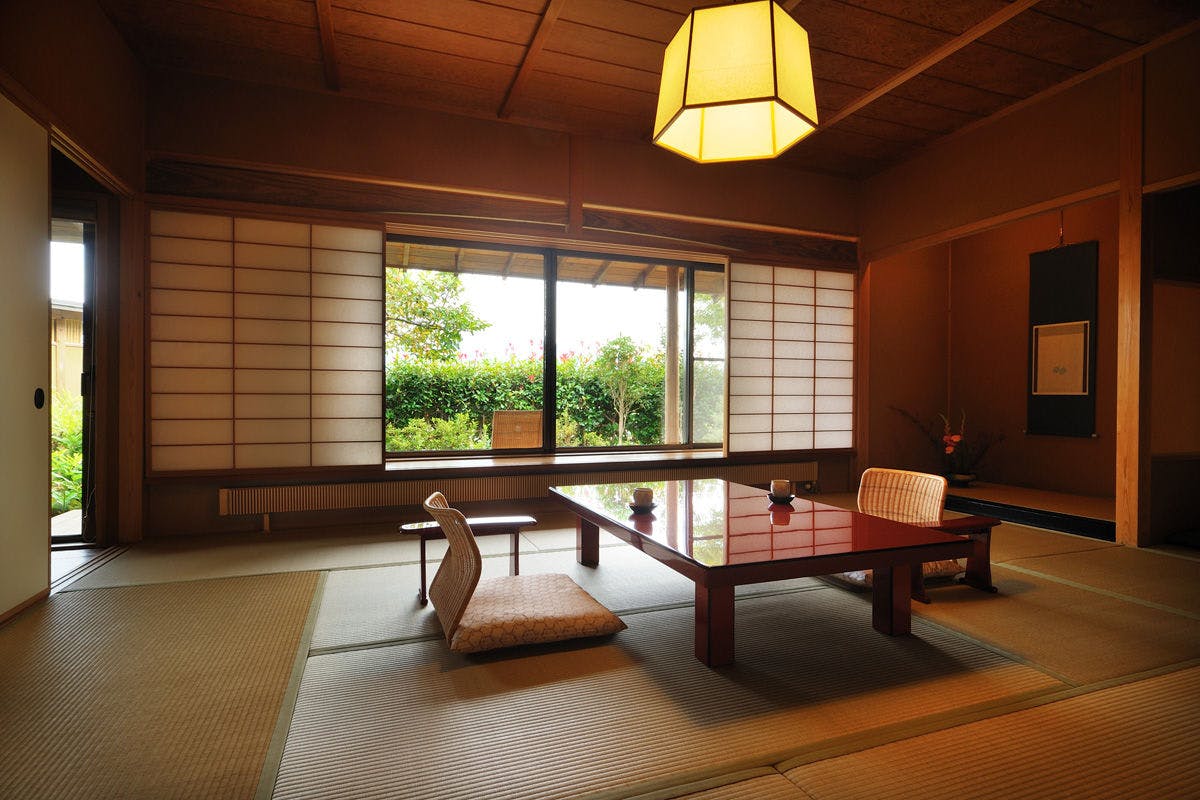 モダンな雰囲気漂うベッドルームと、広々とした和室。 お部屋からは、四季折々の美しいお庭をご覧いただけます。 周りを気にすることなく、完全なプライベート空間をお楽しみ下さい。