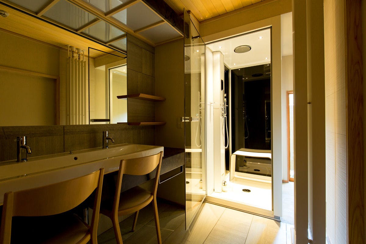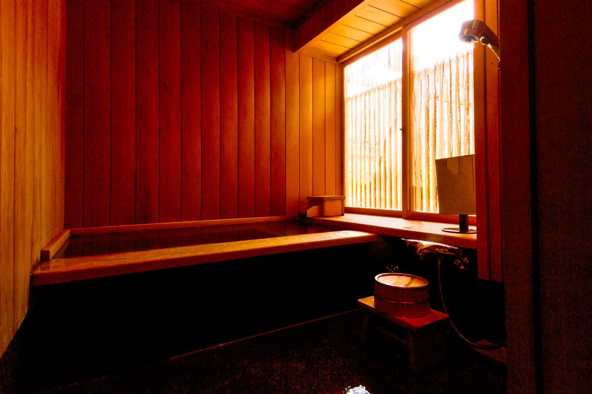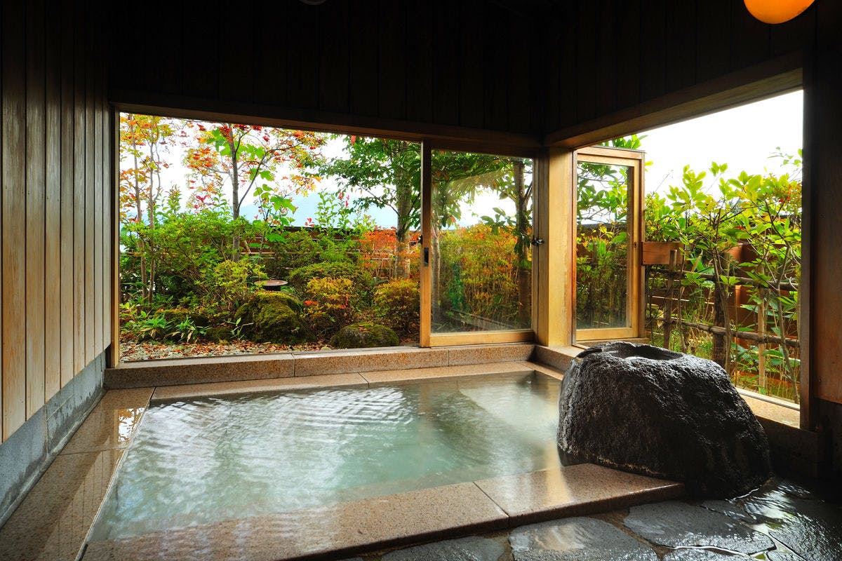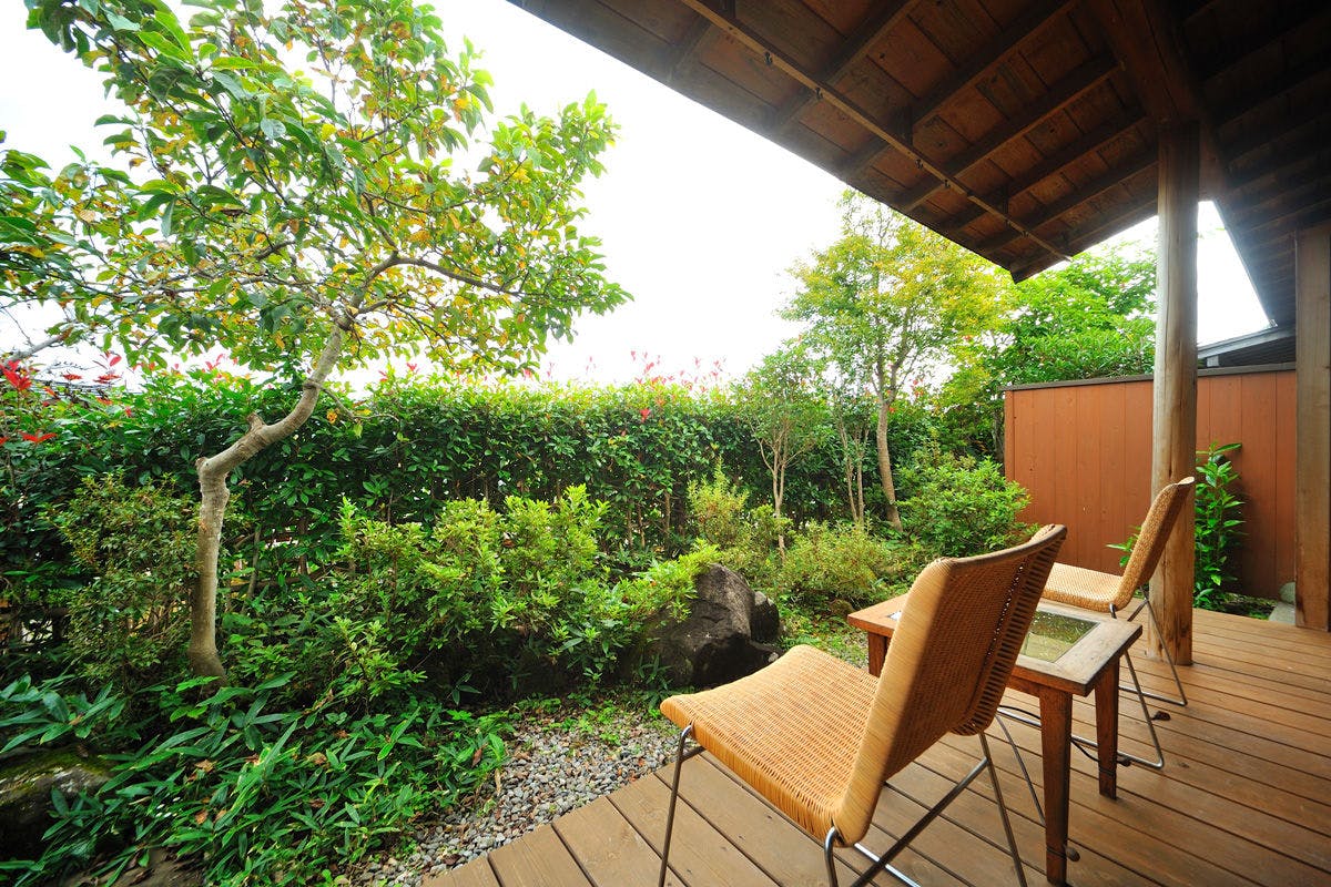 専用の露天(半露天)風呂が付いたこのお部屋は、自然の風を肌に感じながらのんびり湯浴みが楽しめます。ゆったりと滞在し、好きなときにいつでも気兼ねなく入浴できます。