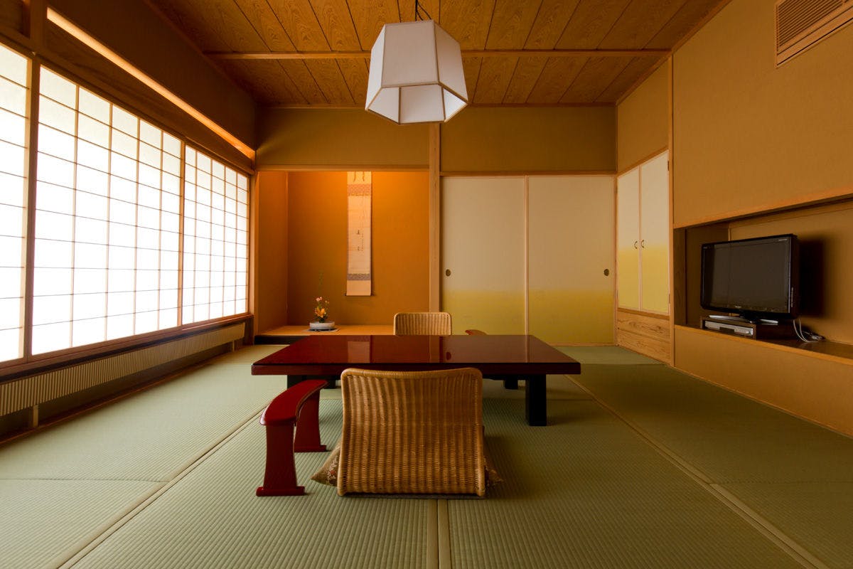 心和む和室と過ごしやすいリビングを備えた名月荘スタンダードのお部屋です。 ゆったりとした広さと、部屋からの風景はもちろん、機能性や居心地の良さにも配慮しました。 リビングは純和風の雰囲気を楽しみながらも、食事はテーブルでという声に応えてくれるもので、家族連れや年配の方たちに好評です。