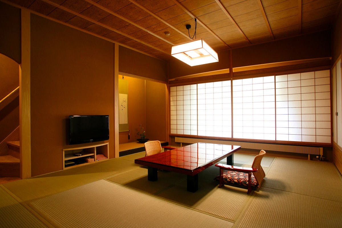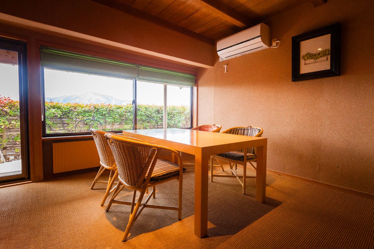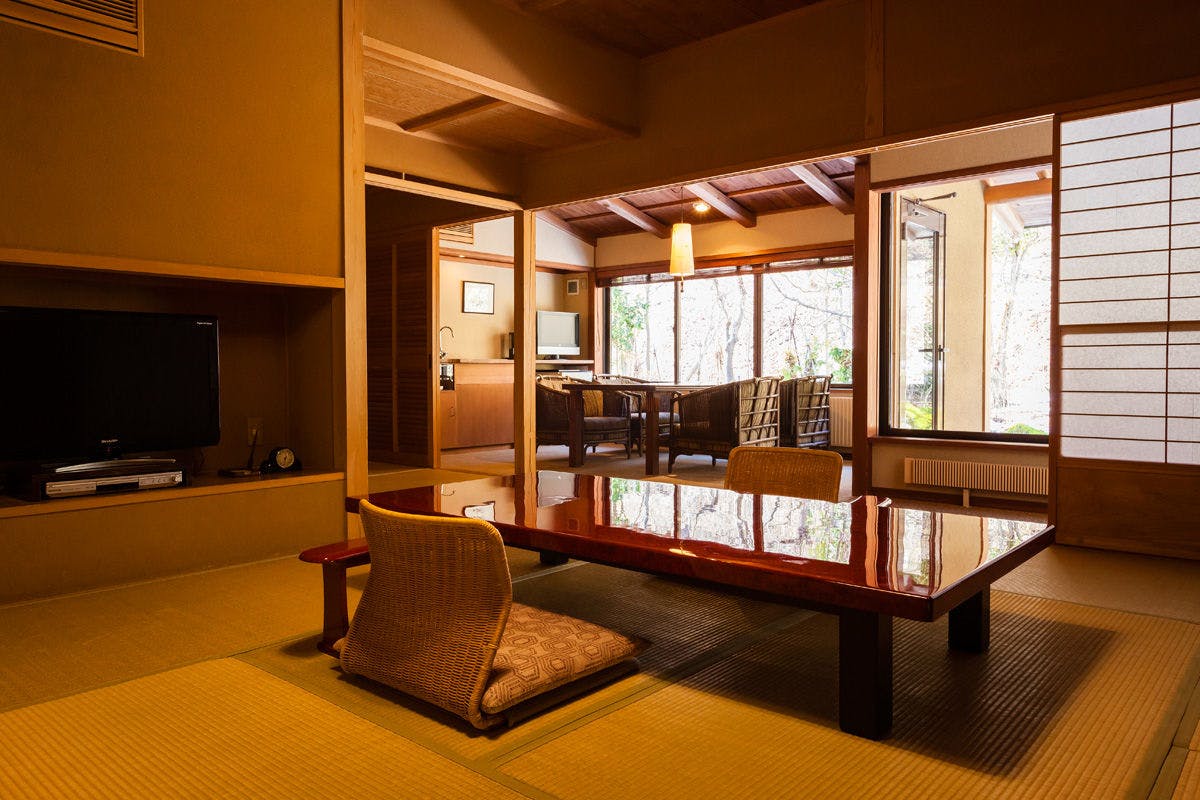 テラスから蔵王の山麓を一望できるお部屋。 四季折々の自然を感じられるのが魅力です。 月夜には、さらに旅情を添えてくれることでしょう。