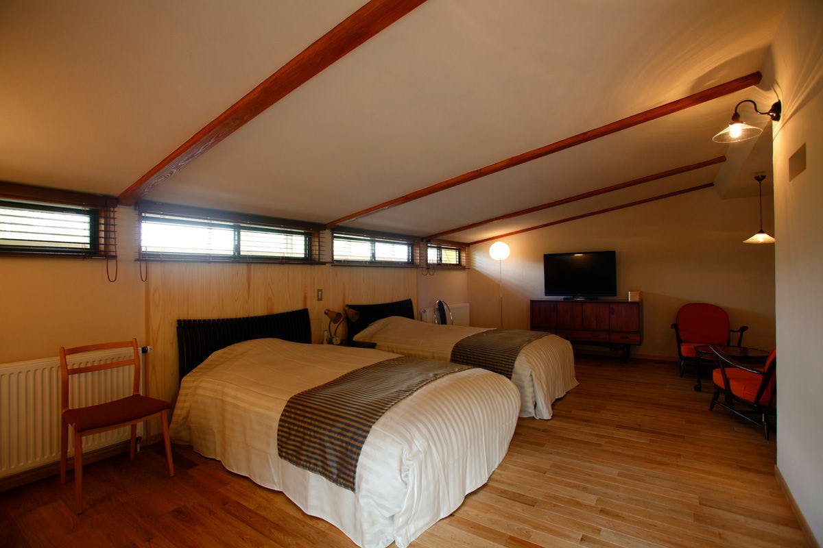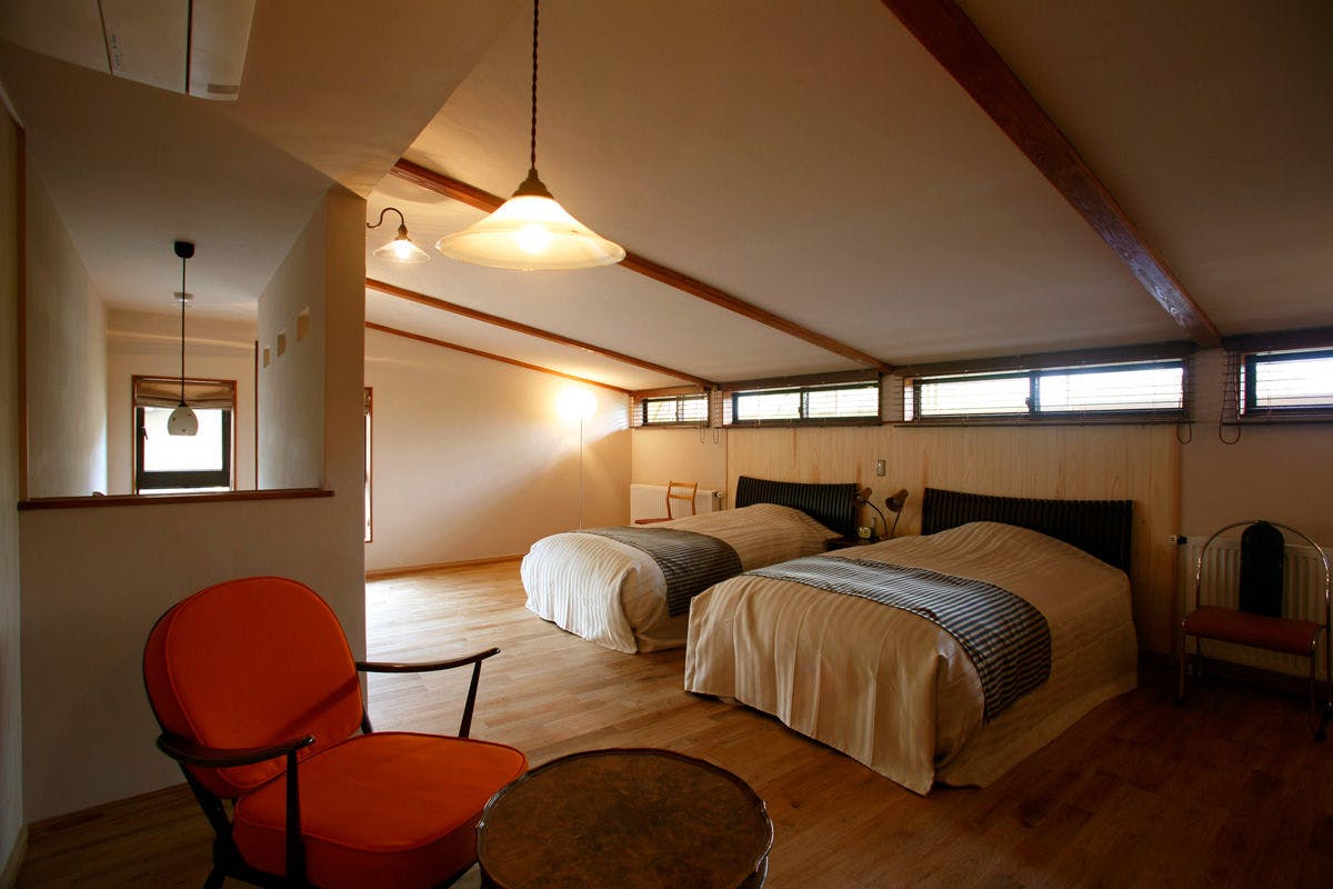 広々とした2階ロフトルームに寝心地の良いツインベッド、そして1階テラスには足湯とユニークな露天風呂。