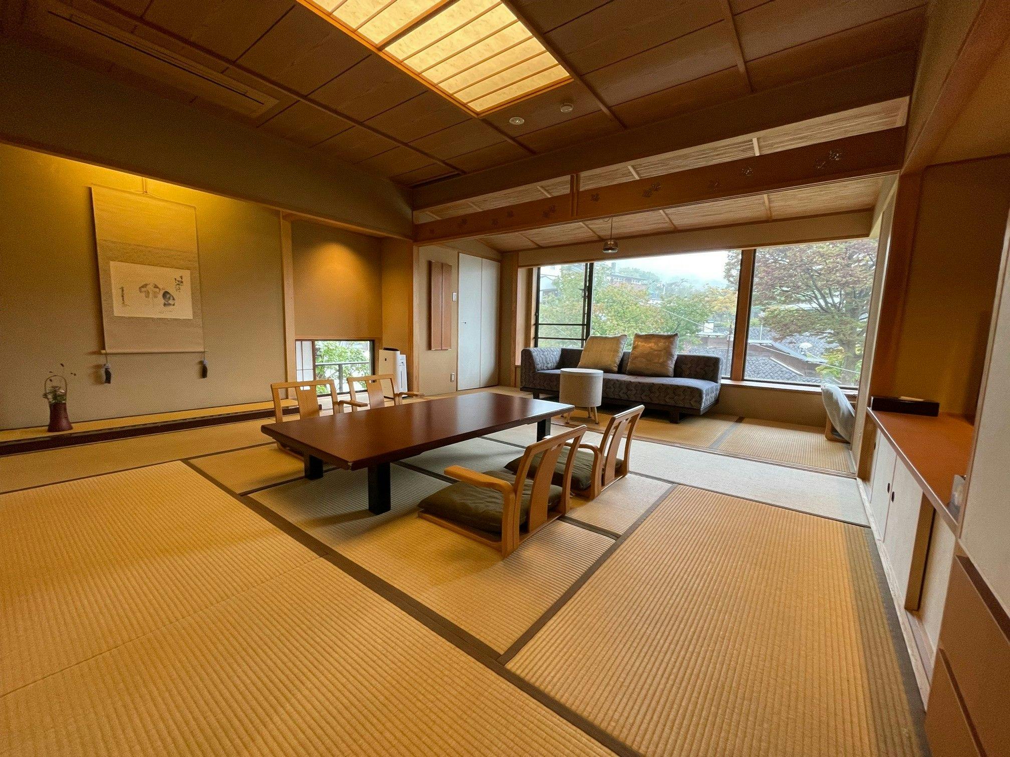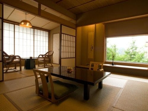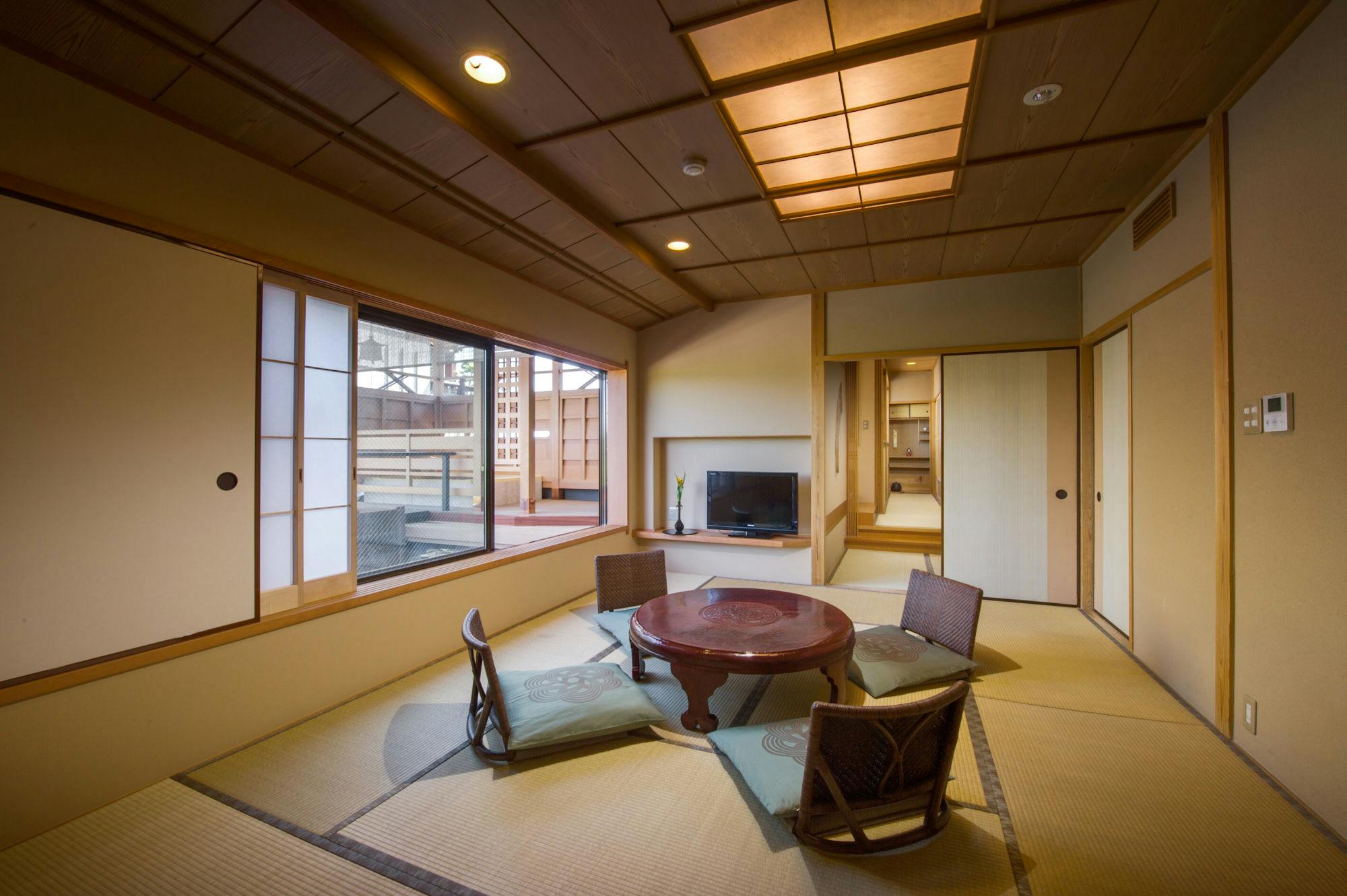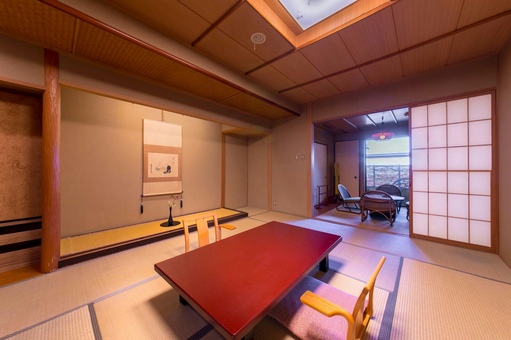 お部屋の広さは、12帖+広縁3帖・7.5帖+広縁3帖と2間あり、ウォシュレットや地デジテレビも完備しておりますので、湯ったりとおくつろぎいただけます。