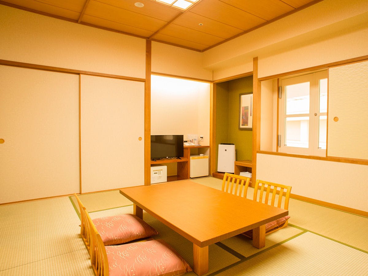 ホテル5Fの椿フロア定員2名のゲストルーム落ち着いた配色で障子や畳の「和」テイストが見事に調和したデザイン、心地良い眠りの為に抗菌畳敷き和室に高さを抑えたローベッドを備え、椿フロア限定の和風部屋着や高級日本茶セットもご用意しております。