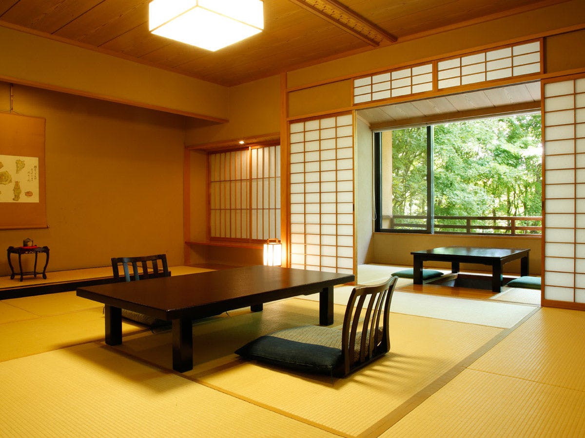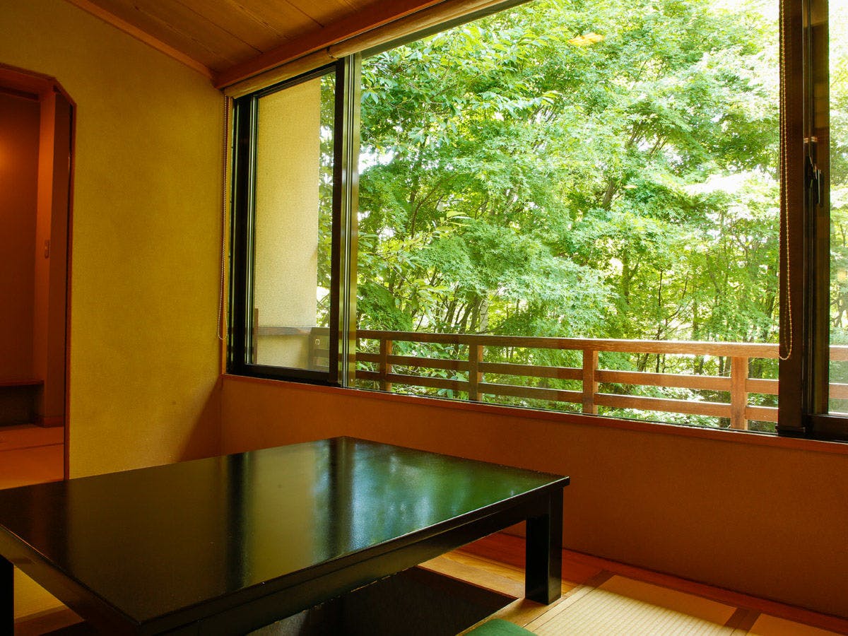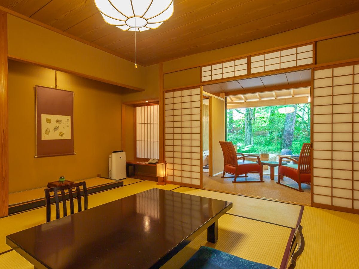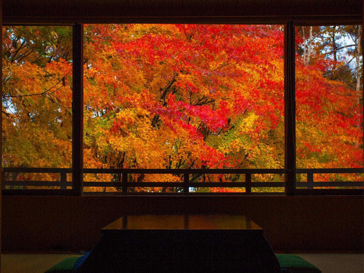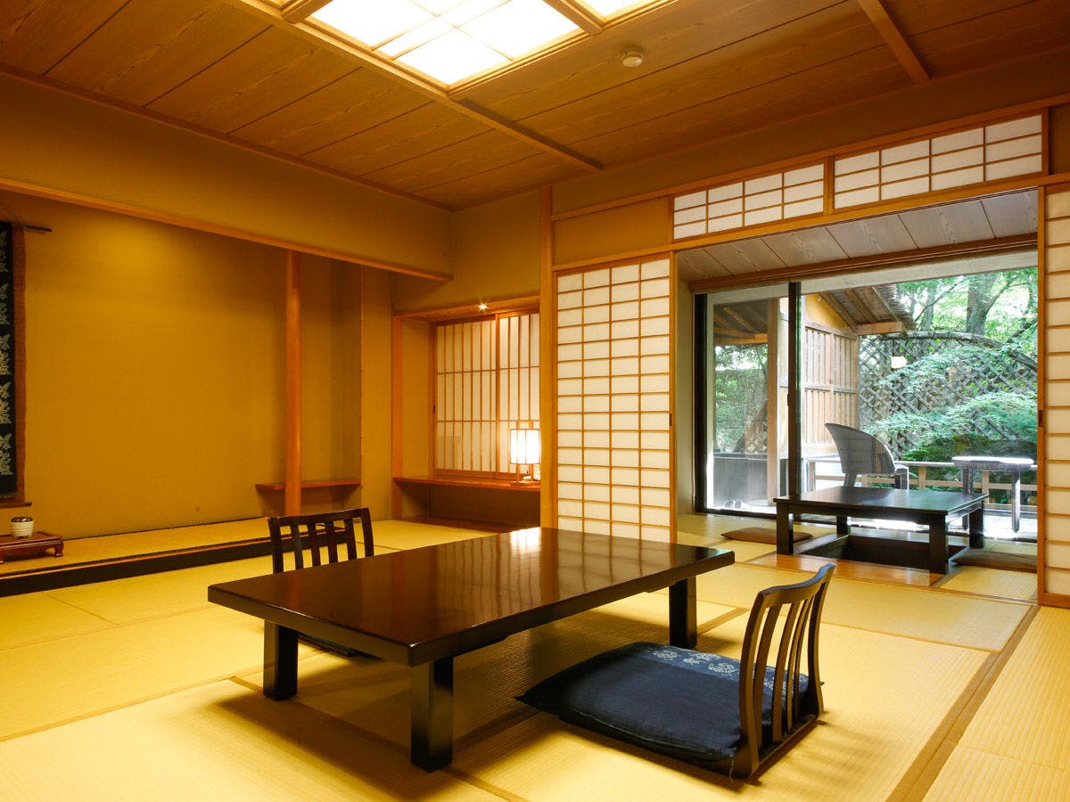 和の情緒あふれる落ち着きのある和室客室。窓からは庭園を見下ろし、季節のの移ろいを感じられることでしょう。客室は和室12.5畳に次の間4畳(掘り炬燵)付きのゆったりとした角部屋。