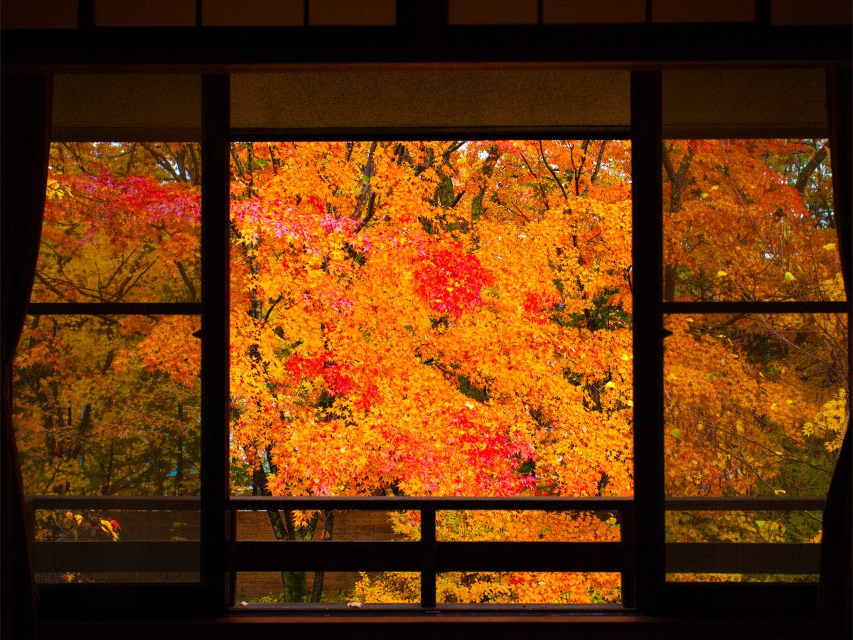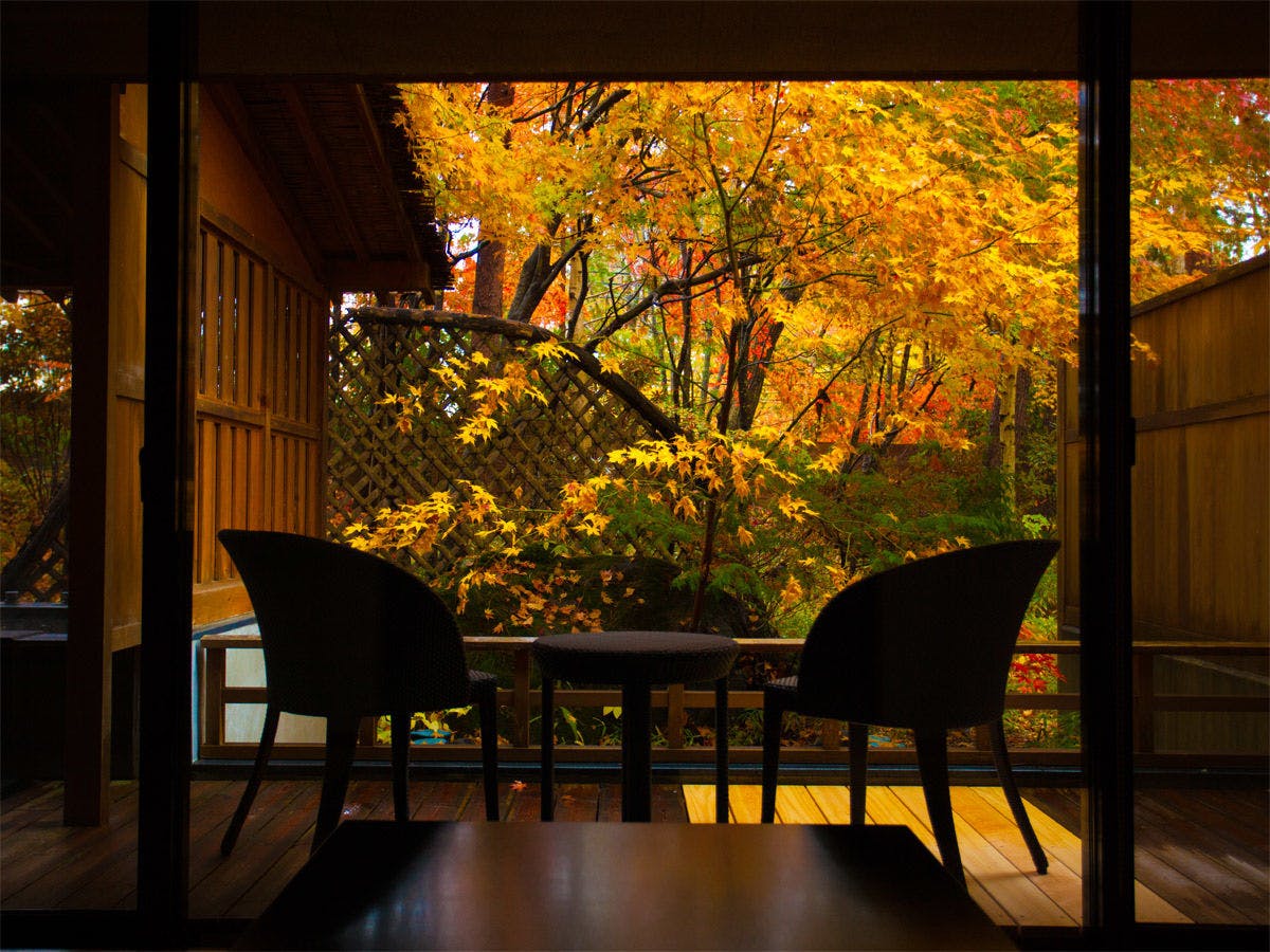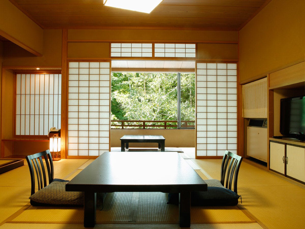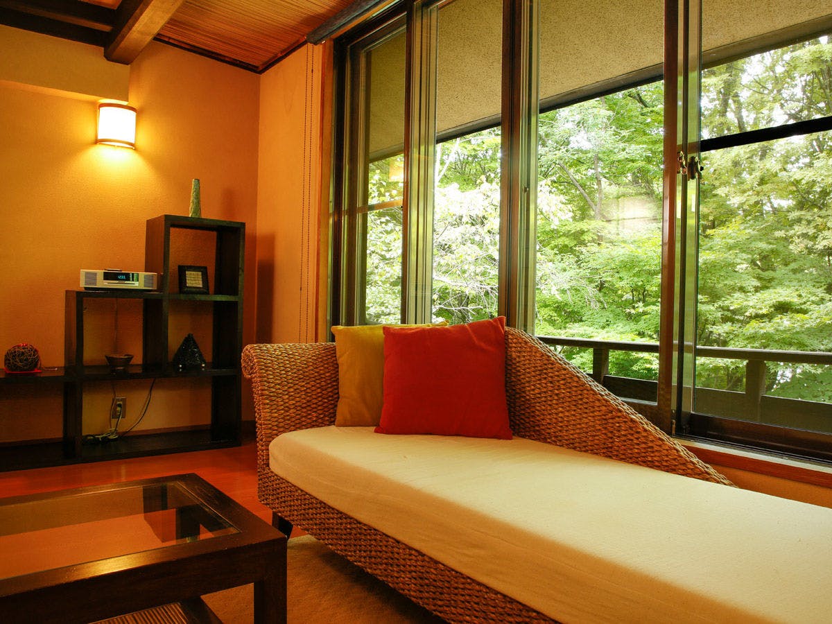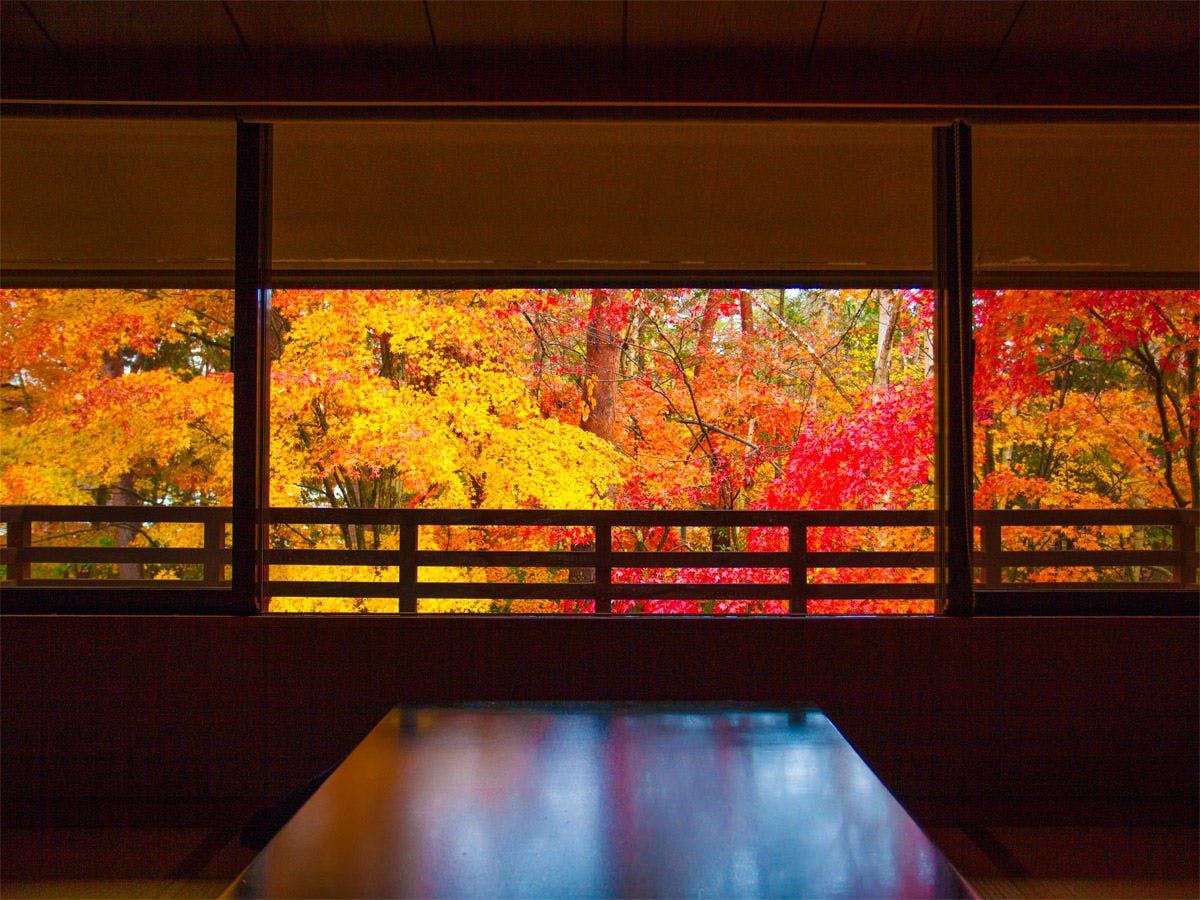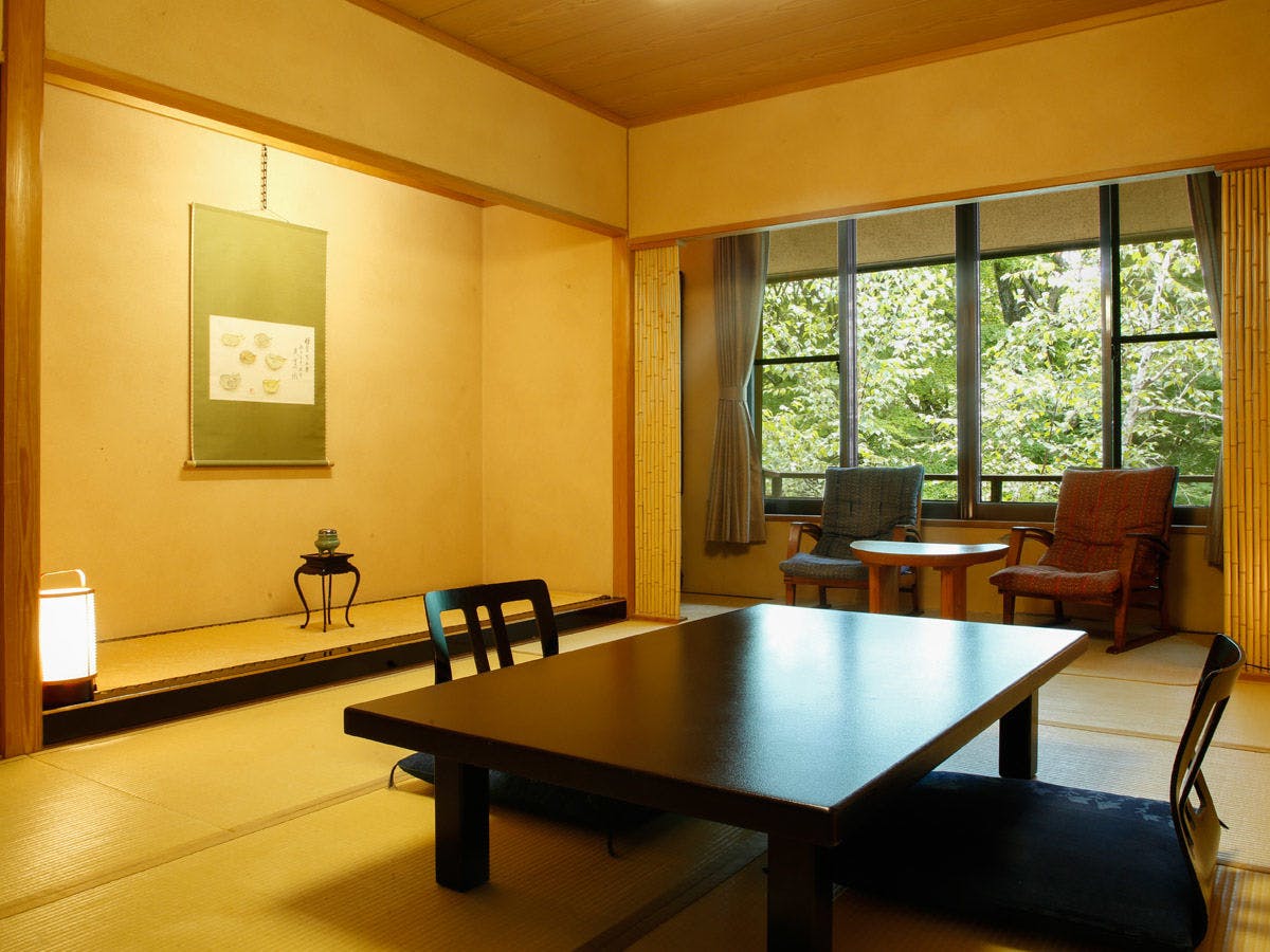 和の情緒あふれる落ち着きのある和室客室。窓からは庭園を見下ろし、季節のの移ろいを感じられることでしょう。客室は和室12.5畳に次の間4畳(掘り炬燵)付きのゆったりとした角部屋。