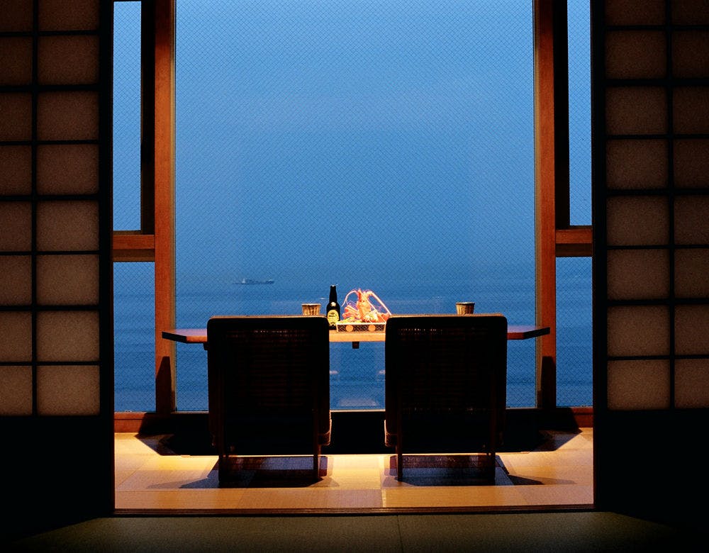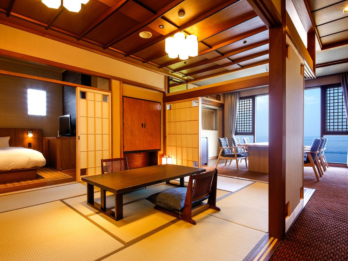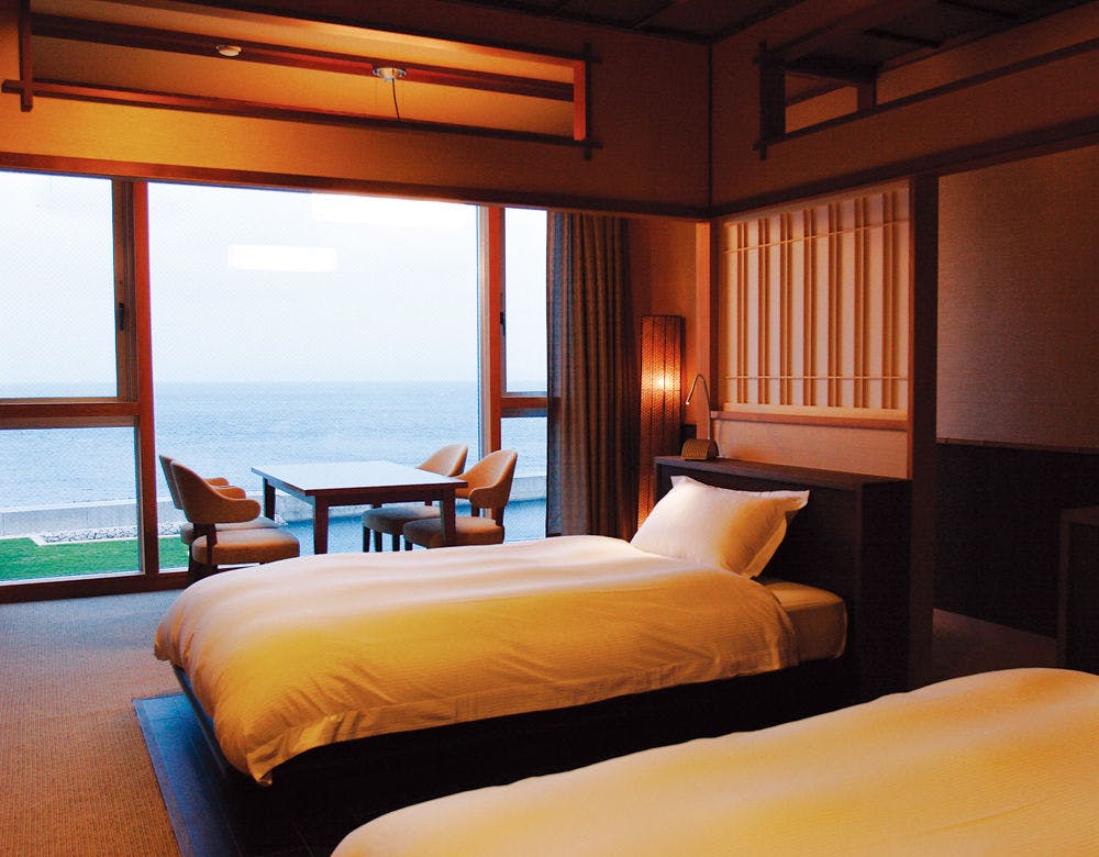 大きな窓の外に海が広がる抜群の眺望を誇ります。和室・広縁・踏込の造りとなっており、和室は12帖と充分な居室空間を確保。広縁のチェアなど家具や調度品もこだわりの物をご用意。