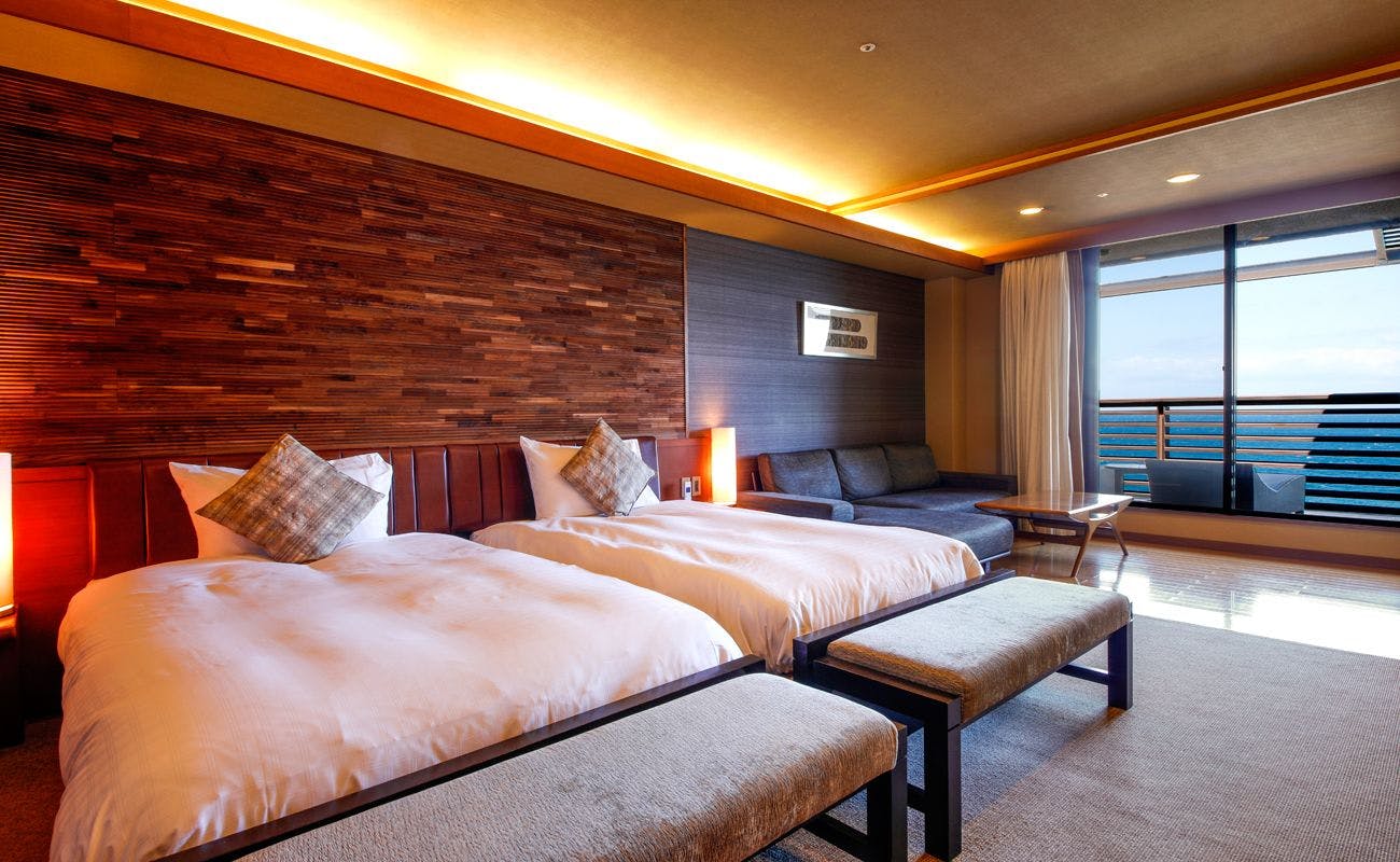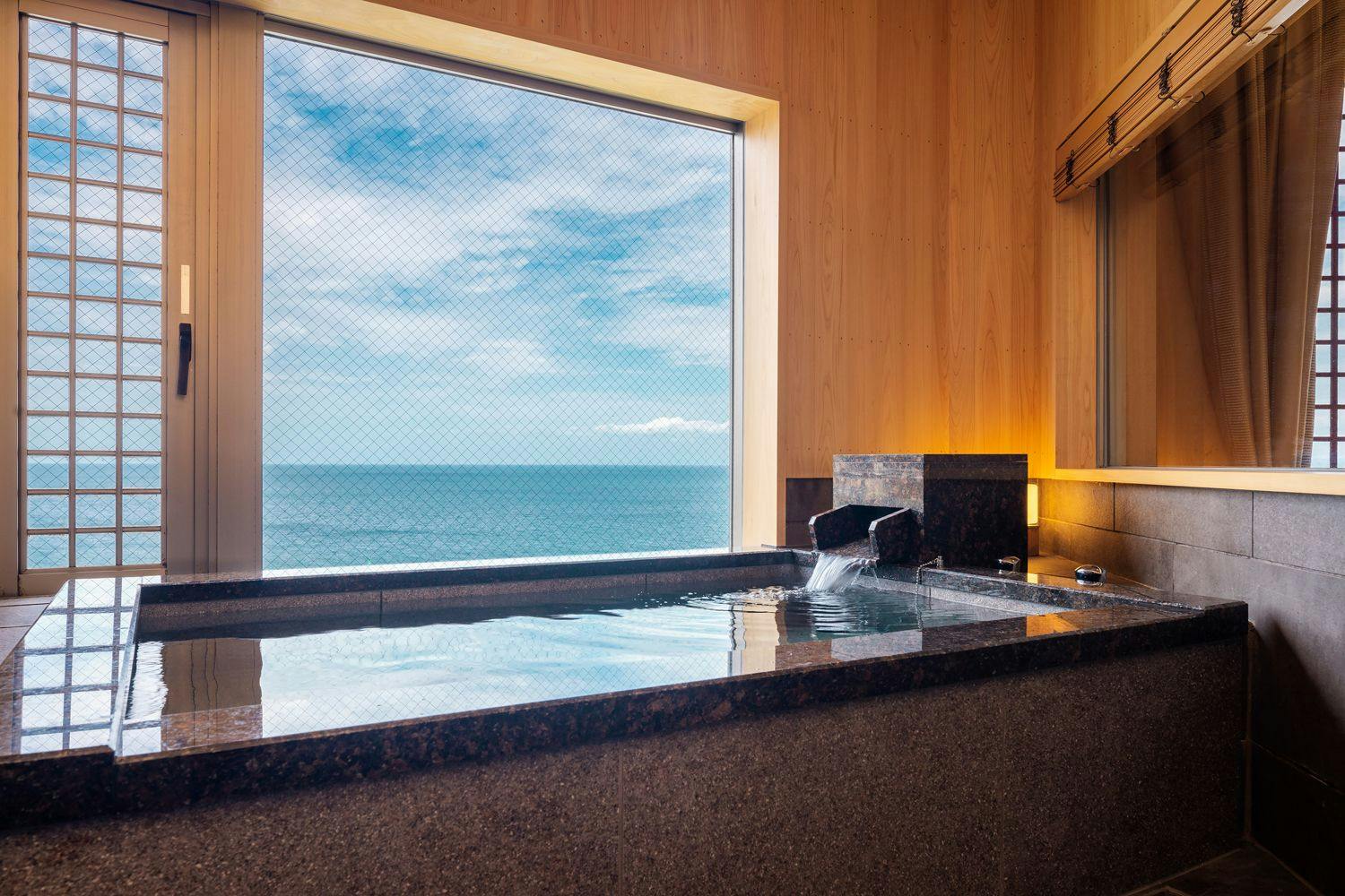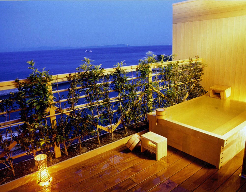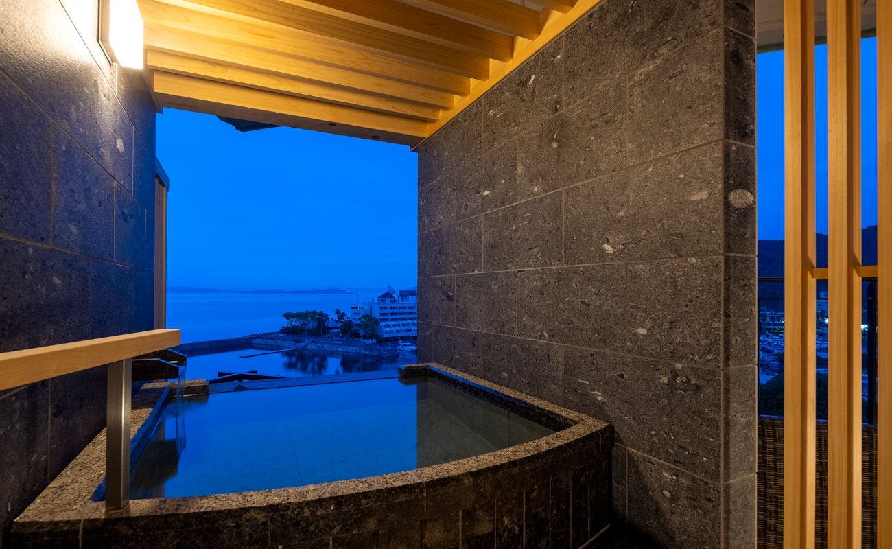 海・空・湯に包まれるメゾネットの湯賓閣・天宮の雫で趣きの異なる2つの源泉を愉しみ、自然木を活かした温かみのある和モダンな特別フロア・里楽で過ごす寛ぎの時。プライベートな湯浴みを愉しむ2つの貸切風呂。