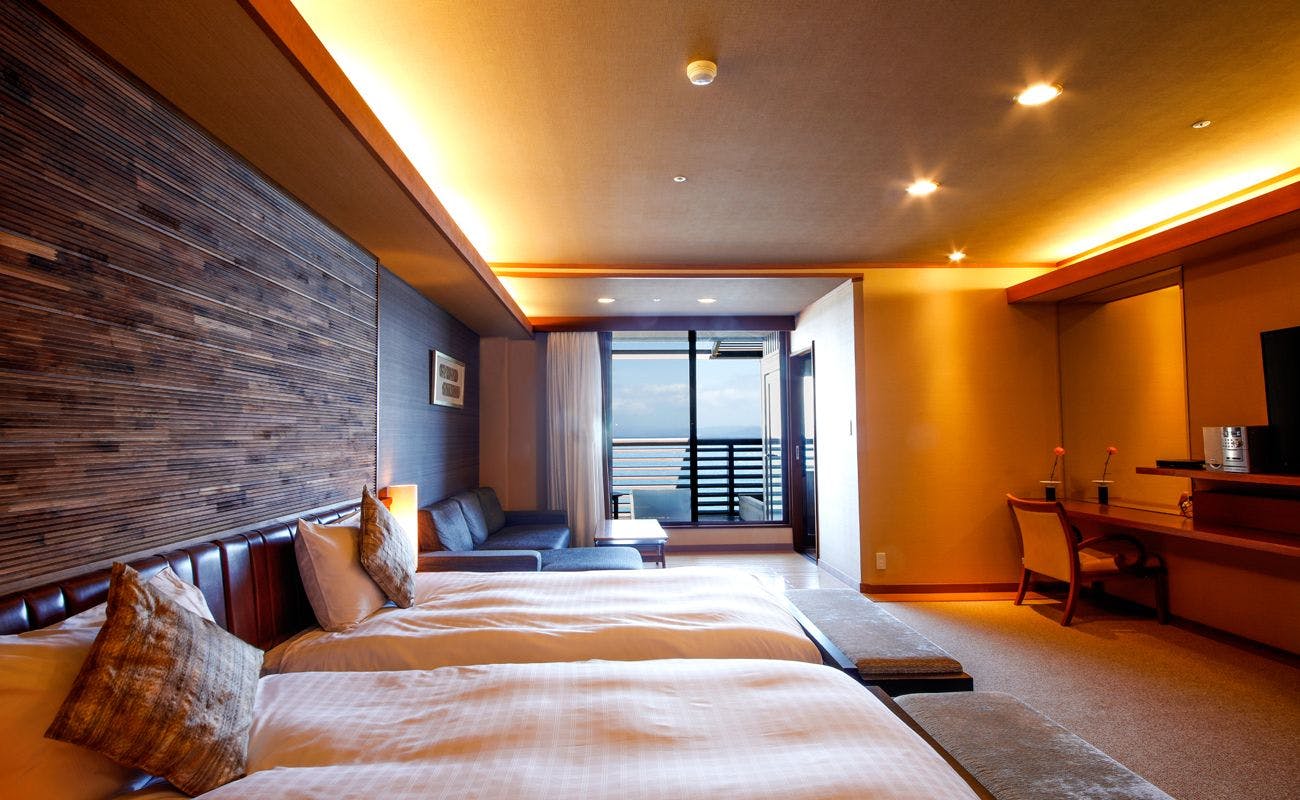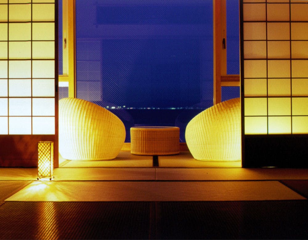 ゆったりとしたツインの洋室についた広々としたオーシャンビューのテラスに温泉露天風呂を御用意。そしてその空間をさらに演出するのがアメリカを代表する屋外家具デザイナー「リチャード・フリニアー」とドイツ「デドン社」のコラボレーションで生まれたバルセロナビーチチェア。ナチュラルな感覚の新素材「Hulalo」を手編みで仕上げ、トラディショナルなテクチャーとモダンなデザインが融合された最新コレクションです。