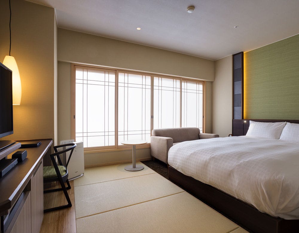 23平米のコンパクトな洋室ながらも、靴を脱いで寛げる琉球畳を配した落ち着きのある和の装いを演出。オーバーヘッドシャワーや、ピロートップを備えた寝心地の良いクイーンサイズのダブルベッド(幅160cm)、そして充実の映像・音響設備など、居心地の良さを追求したこだわりの空間は、大切な人とずっとお部屋で過ごしたくなるような充足感をお約束します。