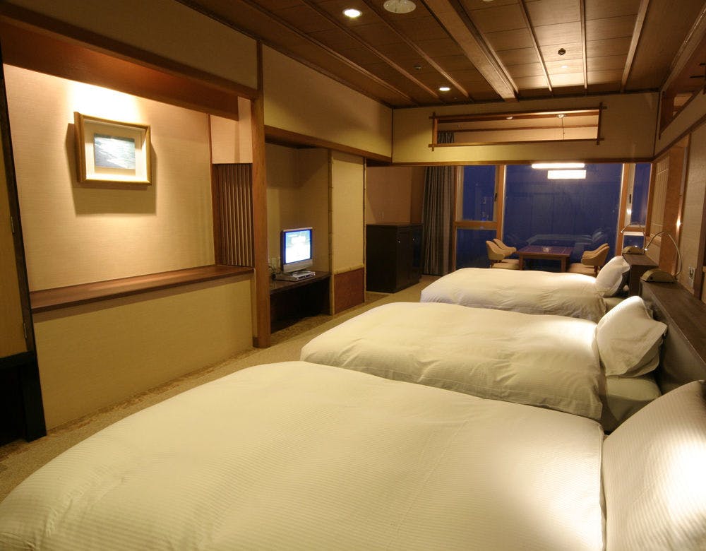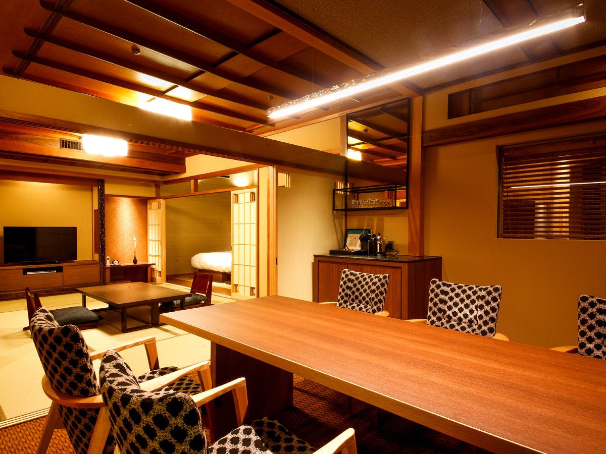 特別フロア【里楽】の中でも最上級クラスの客室。紀淡の海を見ながら湯浴みを愉しめる展望風呂と大きな一枚ガラスの窓を備えたリビングダイニングが特徴的な特別客室です。なみなみと湯を湛える展望風呂で滞在中お好きなだけ洲本温泉を満喫でき、ゆったりした和室や液晶テレビ付ベッドルームを備えロマンチックな空間をリザーブいたします。