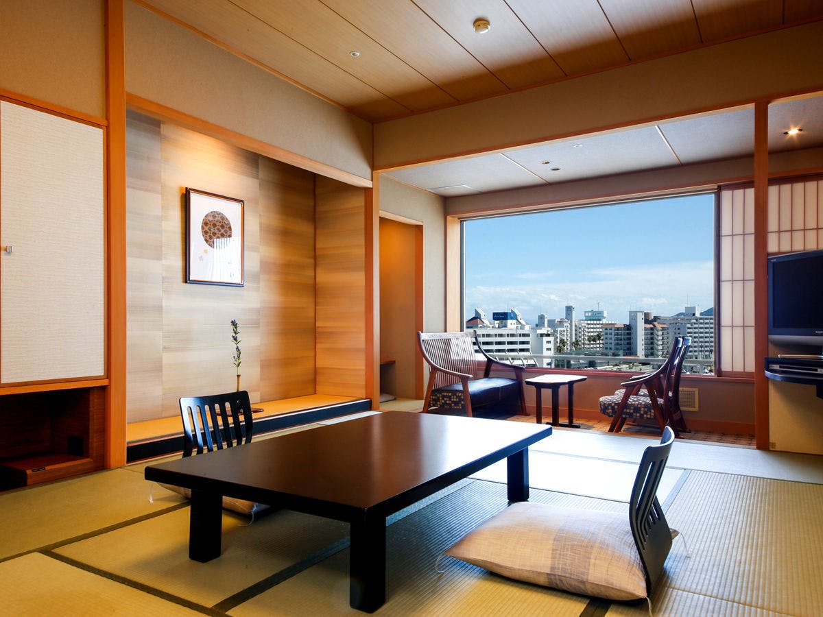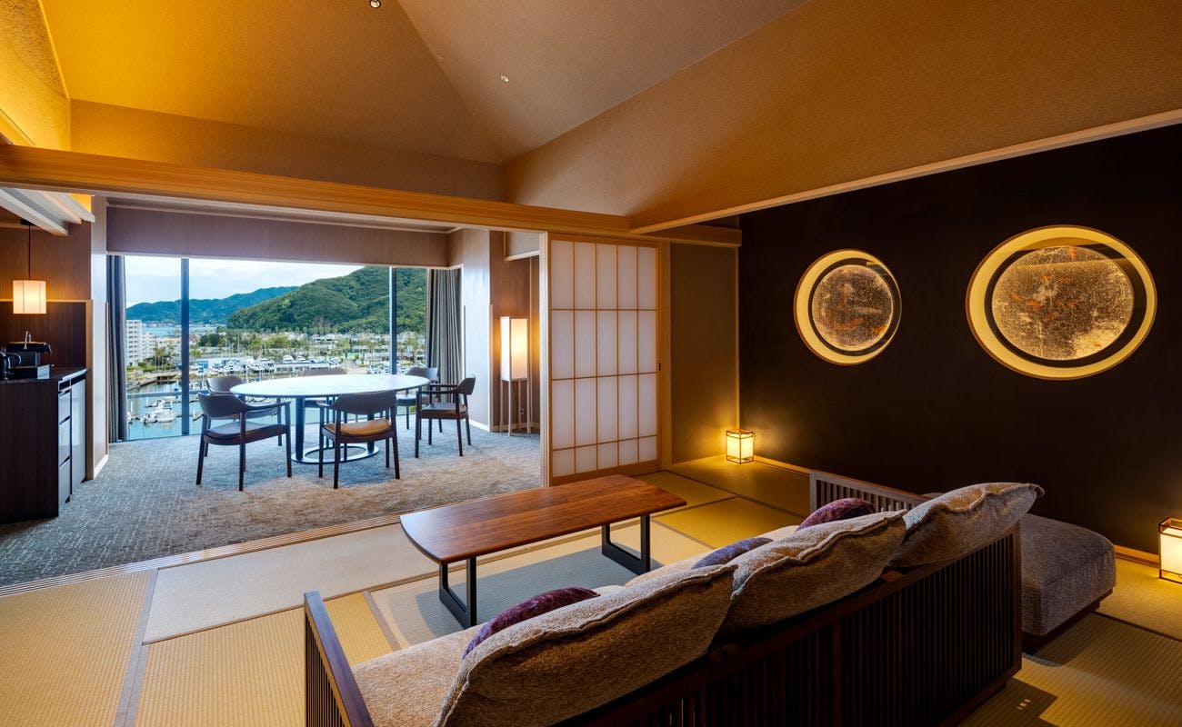 和室12帖のゆったりとした造りに、一枚板の開放感溢れる窓からは、砂浜と異国情緒溢れるヨットハーバーの美しい景色をご覧いただけます。