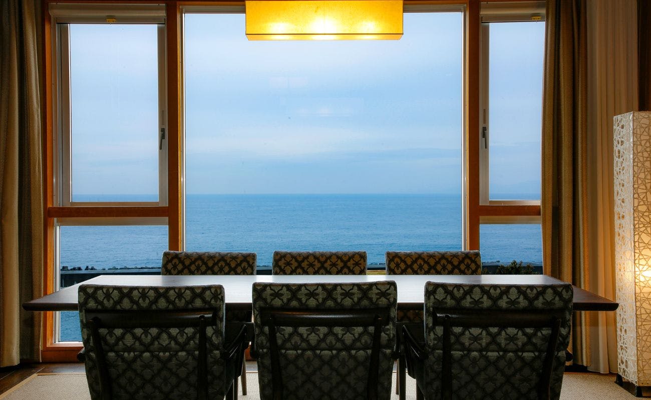 美しい海景が広がるリビングダイニングの大きなテーブルで椅子に座りゆったり足を伸ばして、地元漁港から届く海の幸をちりばめた和会席を愉しめます。(多人数の場合はお泊りの客室の和室部分または別個室でご用意する場合がございます。)