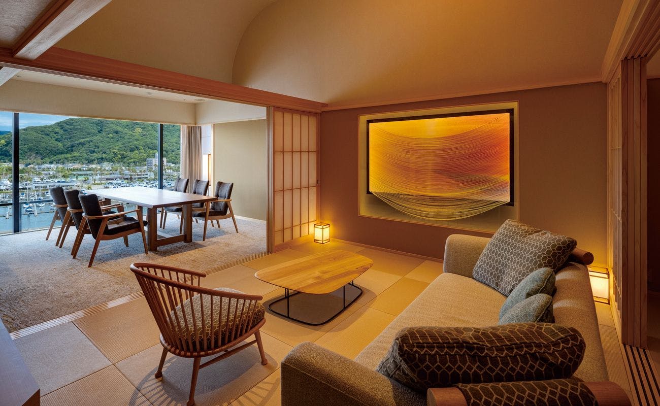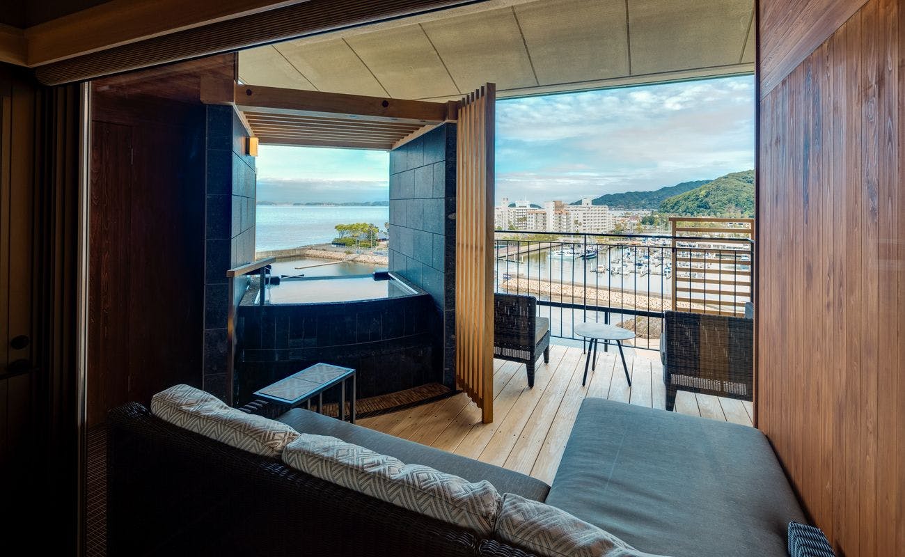 淡路夢泉景で最大級の平米数を誇る贅沢な特別客室は、開放感のある高い天井が印象的。海を見ながら温泉に浸かる専有露天風呂だけでなく、テラスや室内の大きな窓からヨットハーバーの向こうに海が広がる景色をご覧いただけます。