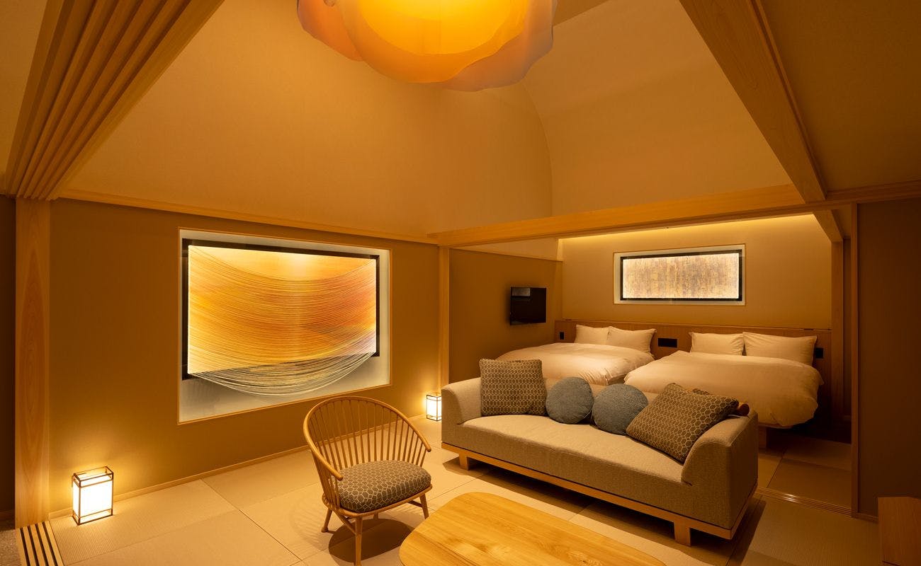 客室内のアートプロデュースは、国内外で活躍するアーティスト「清川 あさみ」氏が手掛けました。国生みの島をコンセプトに、積もり重なり島となる様子と、瑠璃色に光る朝日から茜色に染まる夕日へと移ろう空の暖かさをイメージした灯りの作品「konn」を始めとする3つの作品を設えています。過ごす人の心身を美しい生命力や彩りで包みこむ空間をお愉しみください。