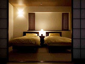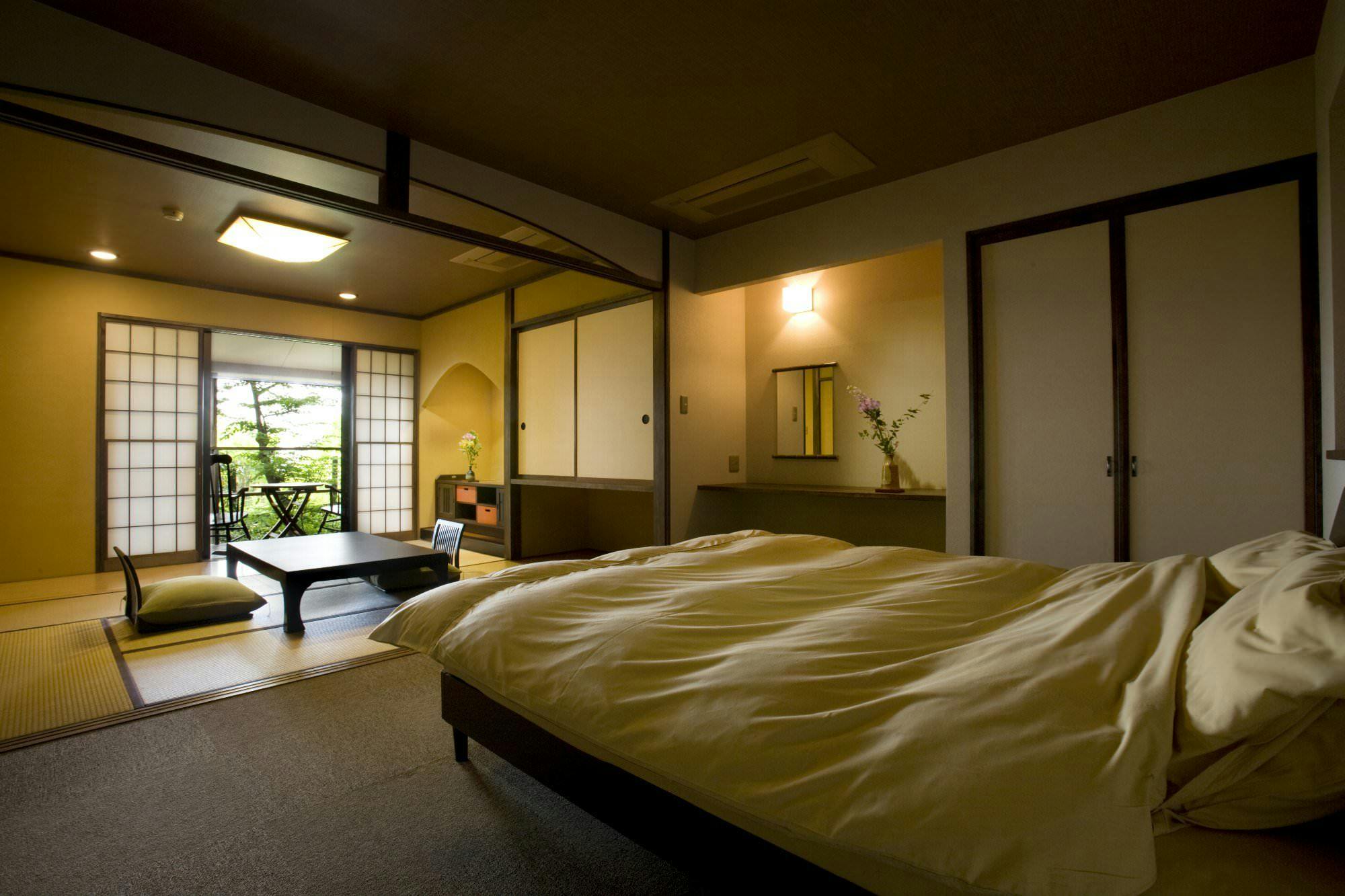 和洋室二間 和室8帖+洋室の寝室6帖 ツインベッドテラスの客室専用半露天風呂 岩風呂または檜風呂 全室に寒さや虫から守る開閉式扉の大きな窓が付いています。 開けると露天風呂同様の解放感が楽しめます。お部屋の冷蔵庫のお飲み物は全て無料となっておりますので、ご自由にお飲み頂けます。落ち着いた空間に和やかな一日 ・・・ やすらぎと静寂のおもてなし