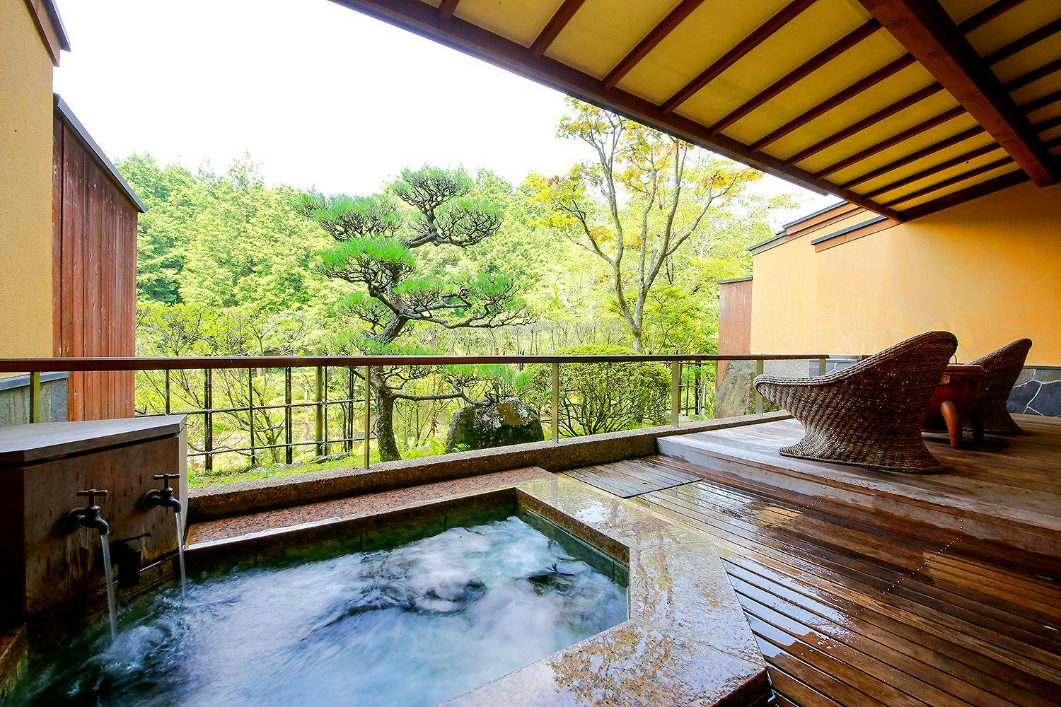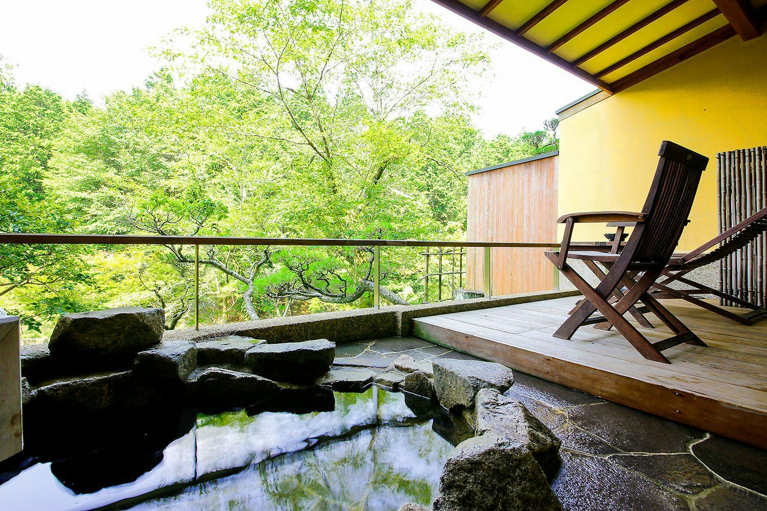 和室とベッドルームが独立したゆったりとしたお部屋からデッキへと繋がる空間は、夕やけこやけ屈指の人気のお部屋。その理由はデッキの横に設えた岩の露天風呂。