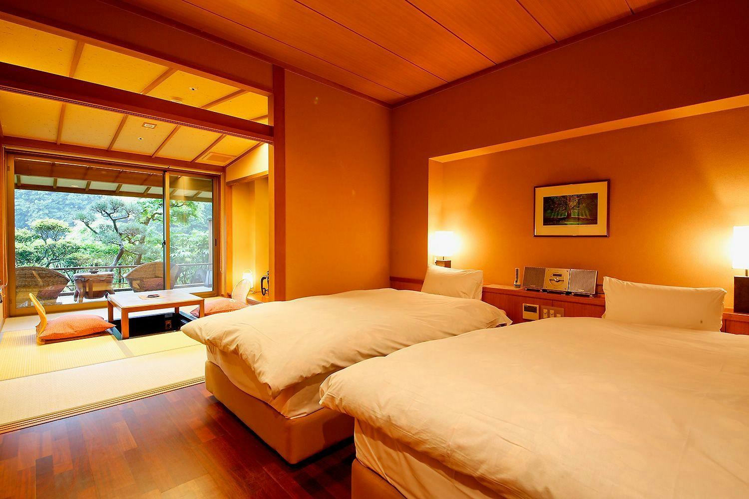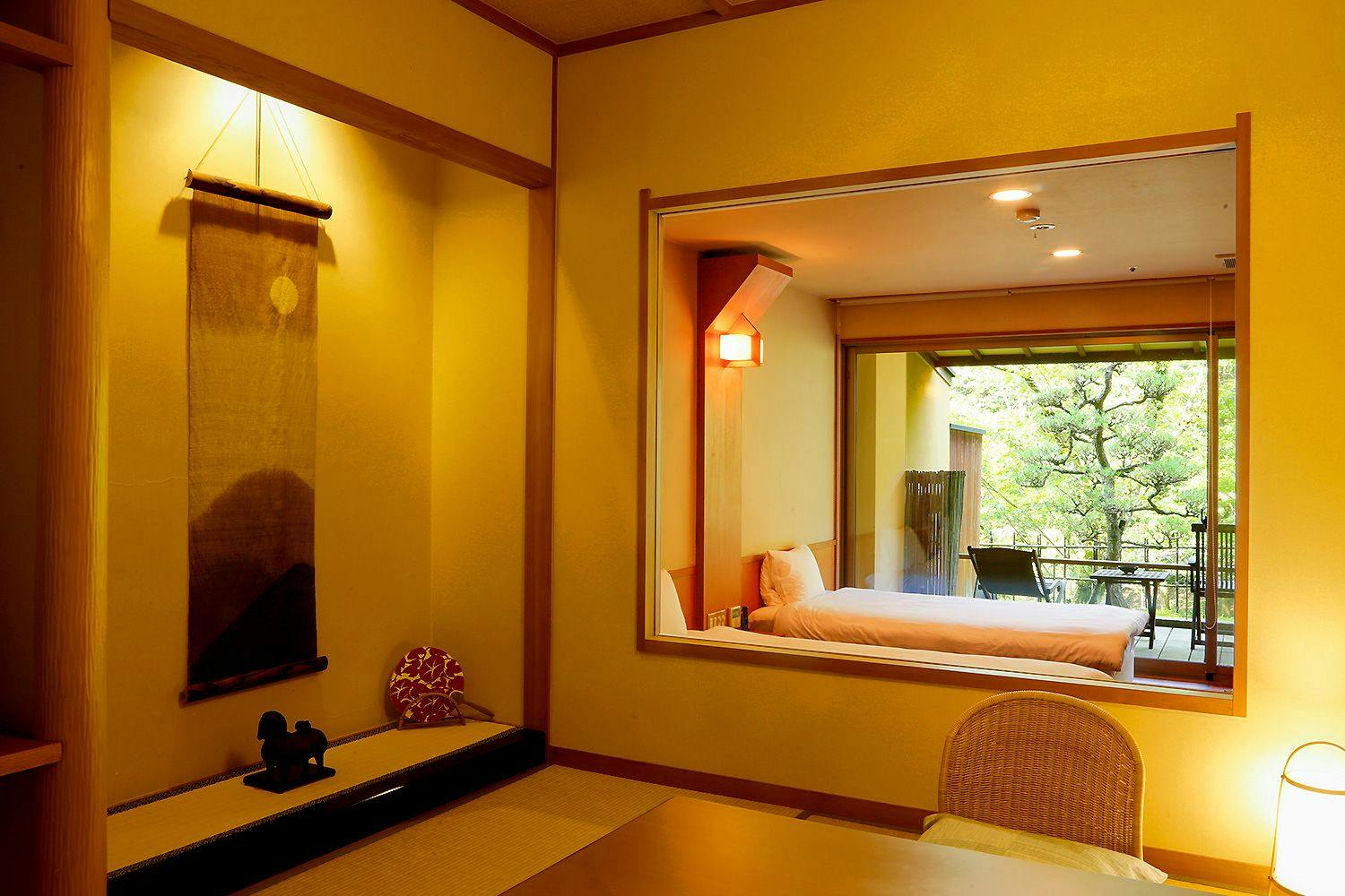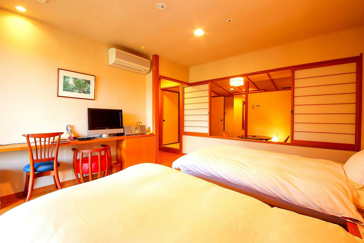 姫路や播磨の伝統工芸品を設え、地域色を強く意識したお部屋でございます。お部屋タイプは、手前に和室と窓際にベッドルームをセパレートしツインベッドをご用意しております。