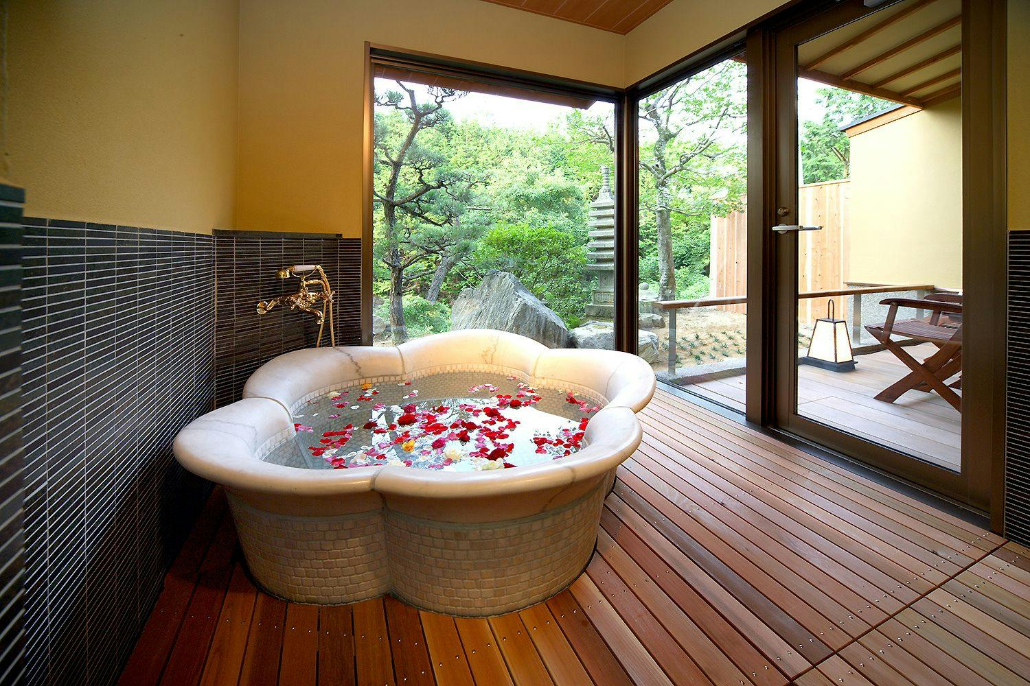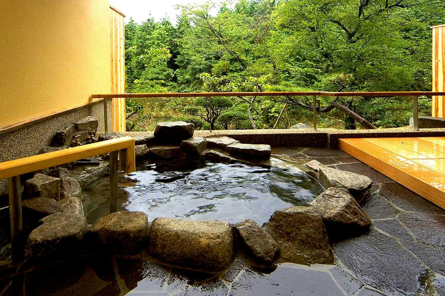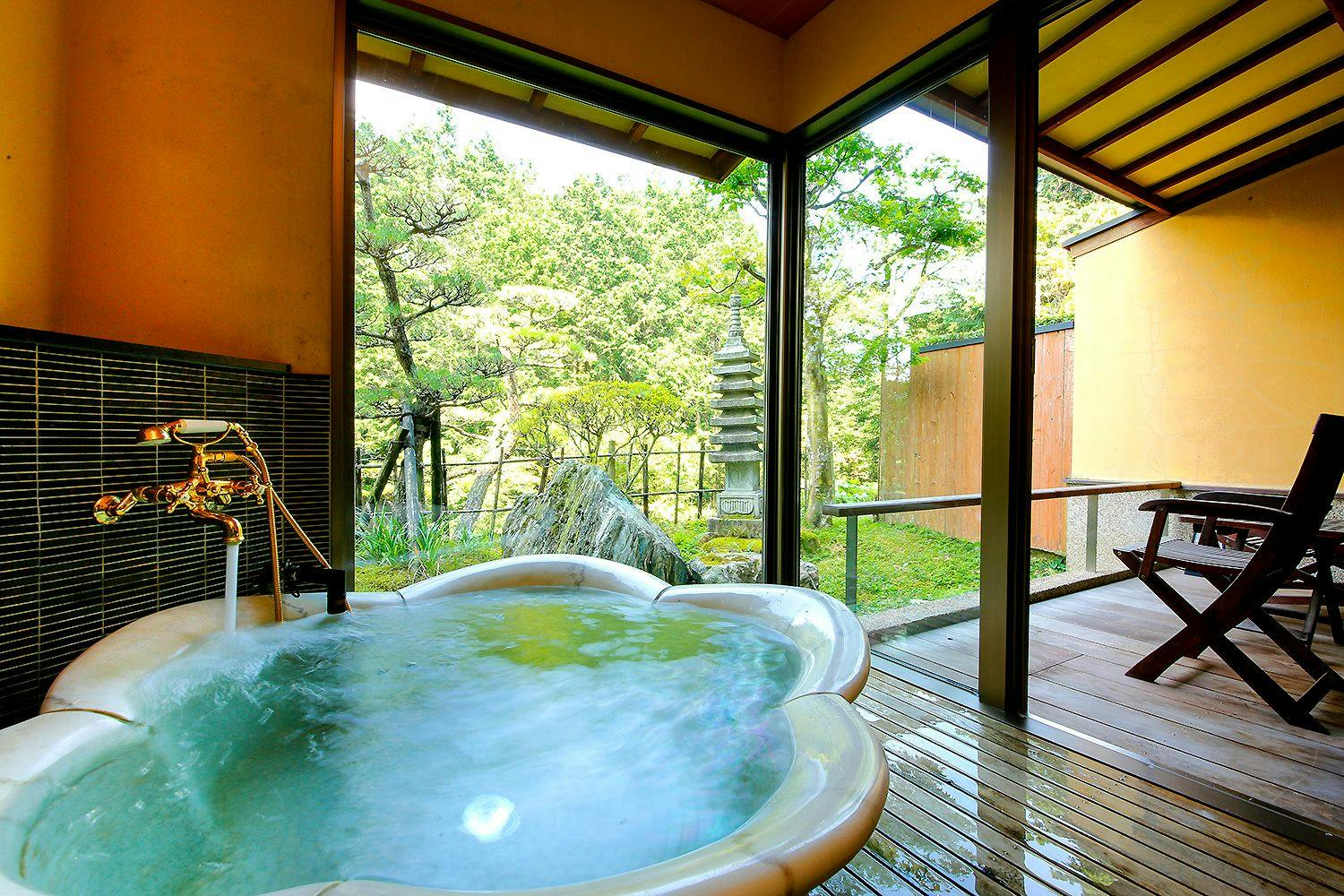こちらのお部屋からは、まずテラスにお出まし下さい。里山の緑と山の空気に気持ちが落ち着きます。テラス横に設えたお風呂は御影石。お庭を眺めながら湯船に身を預けてお楽しみ下さい。