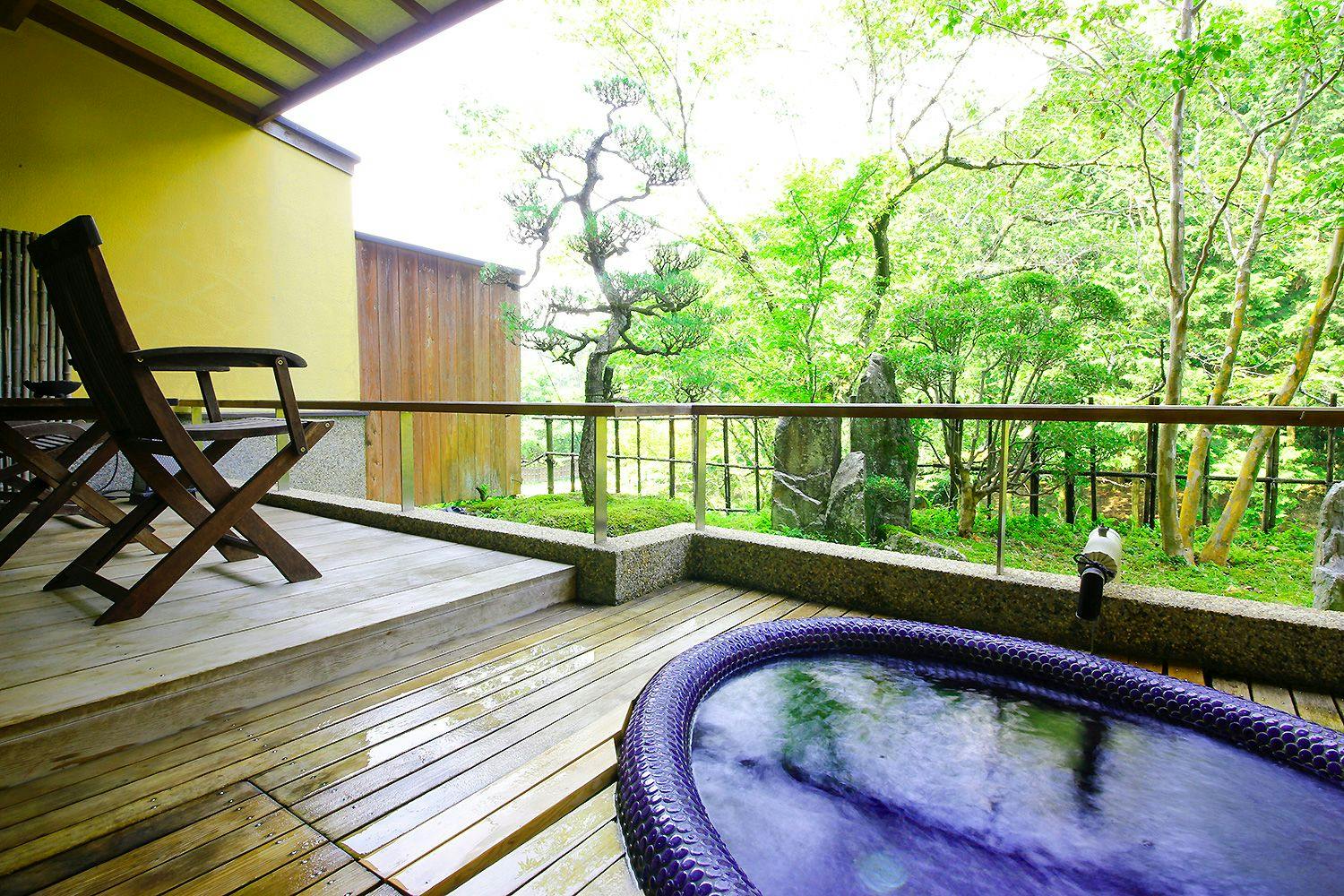 デッキ、露天風呂、坪庭へと連続していく空間は、このお部屋の空気を特別なものへと作り変えているようです。長湯からデッキにあるチェアへの行き来も楽しいひと時ではないでしょうか。