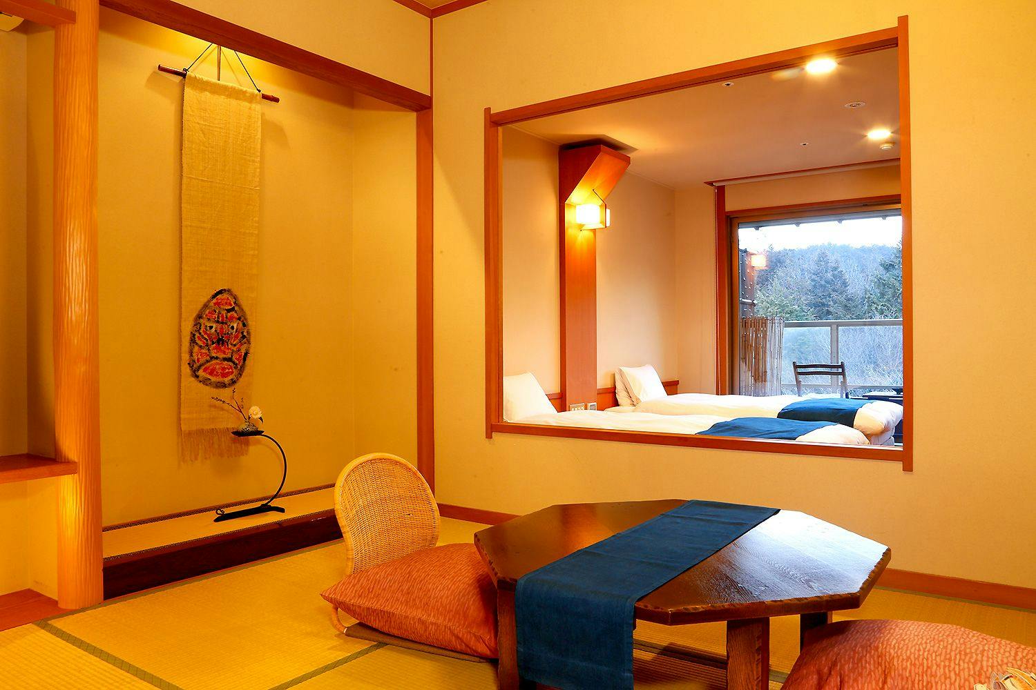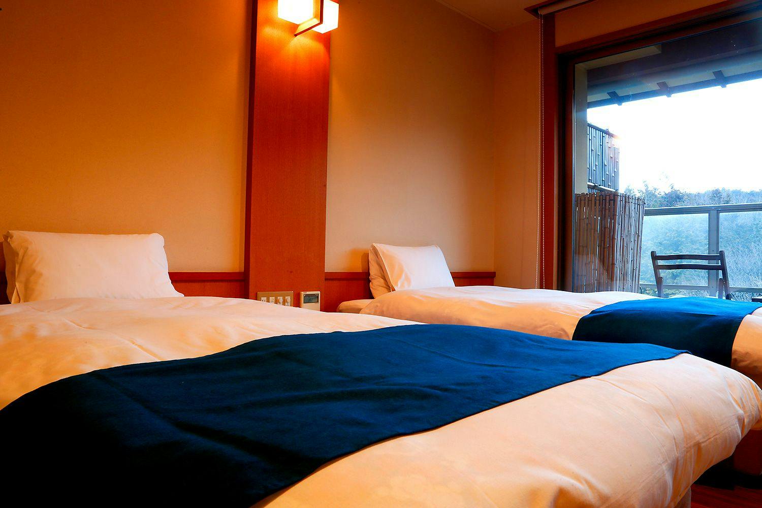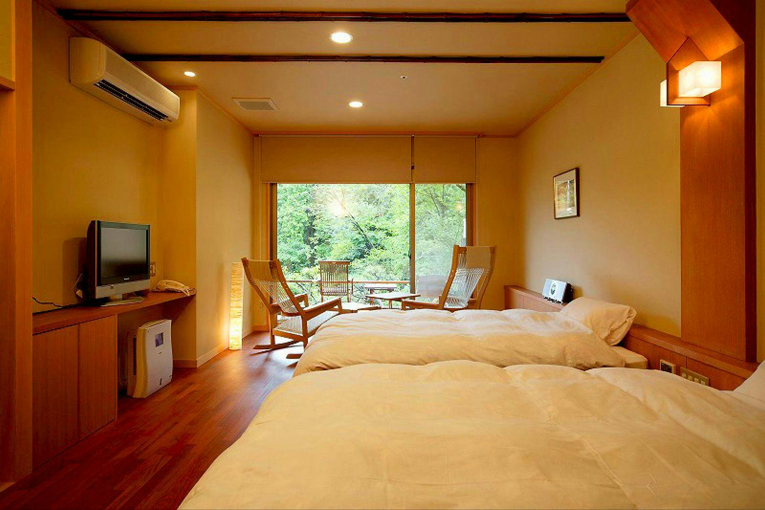 こちらのお部屋は、手前に和室と窓際にベッドルームをセパレートしツインベッドをご用意しております。一段高く設えた和室からの眺めは、一枚の絵画を思わせる里山を四季でお楽しみ頂けます。テラスにご用意しております檜露天風呂に浸かりながら、季節の風と薫りをお楽しみ下さい。