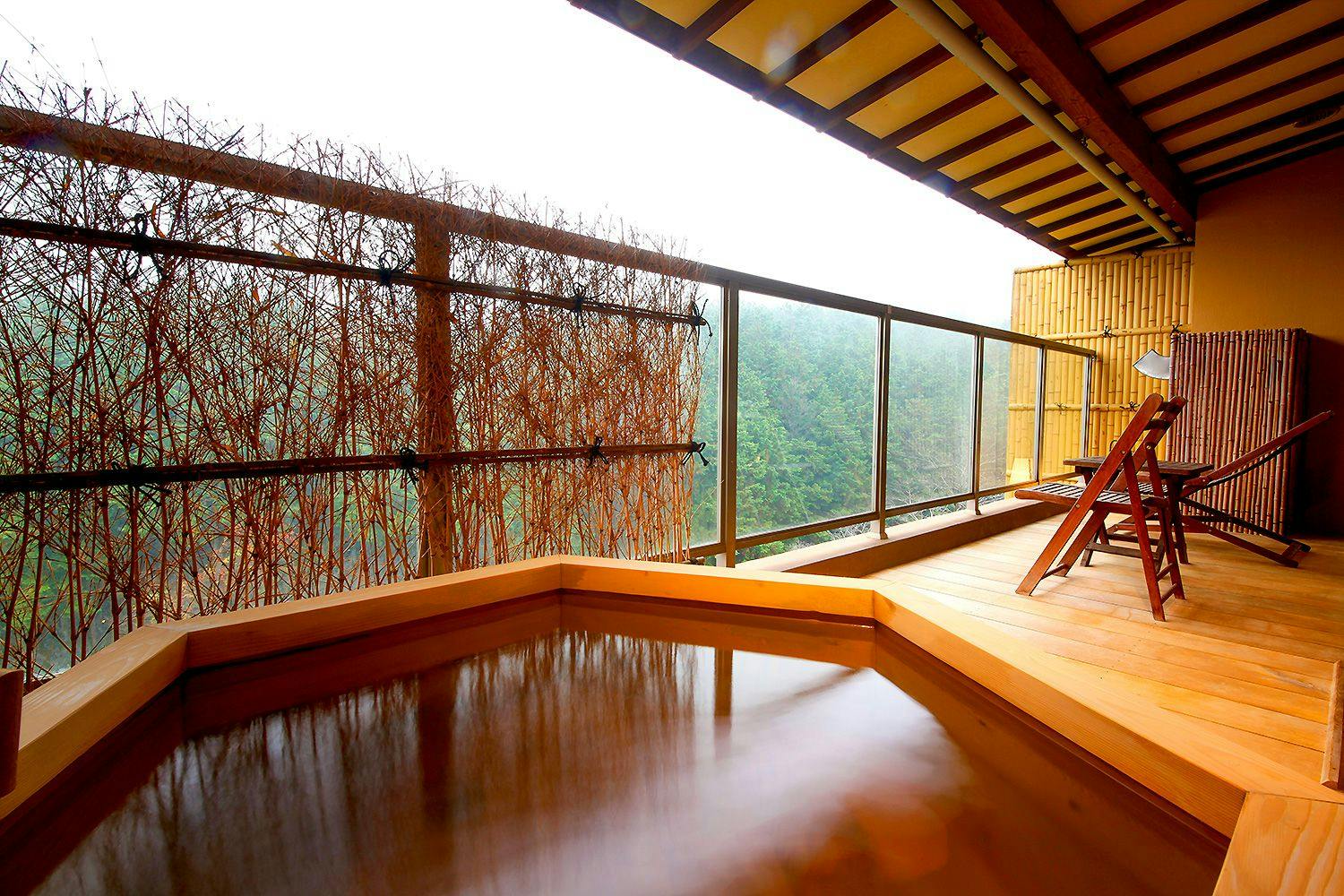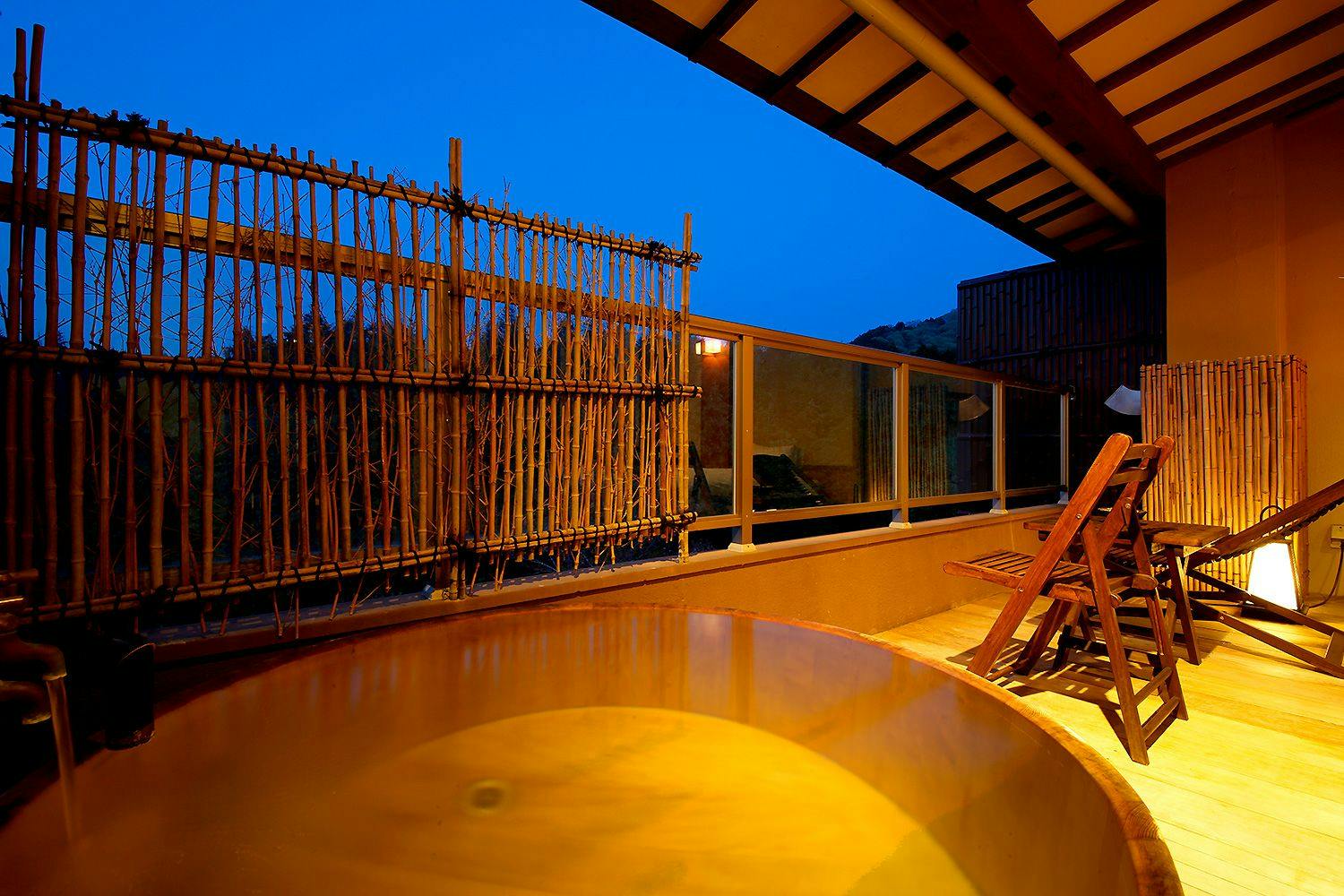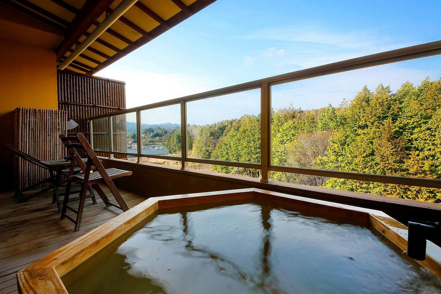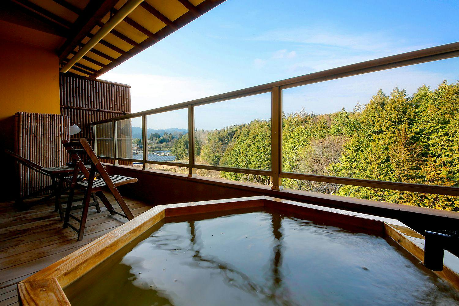 一段高く設えた和室からの眺めは、一枚の絵画を思わせる里山を四季でお楽しみ頂けます。テラスにご用意しております檜露天風呂に浸かりながら、季節の風と薫りをお楽しみ下さい。