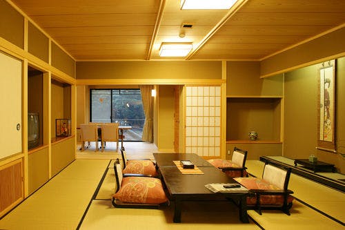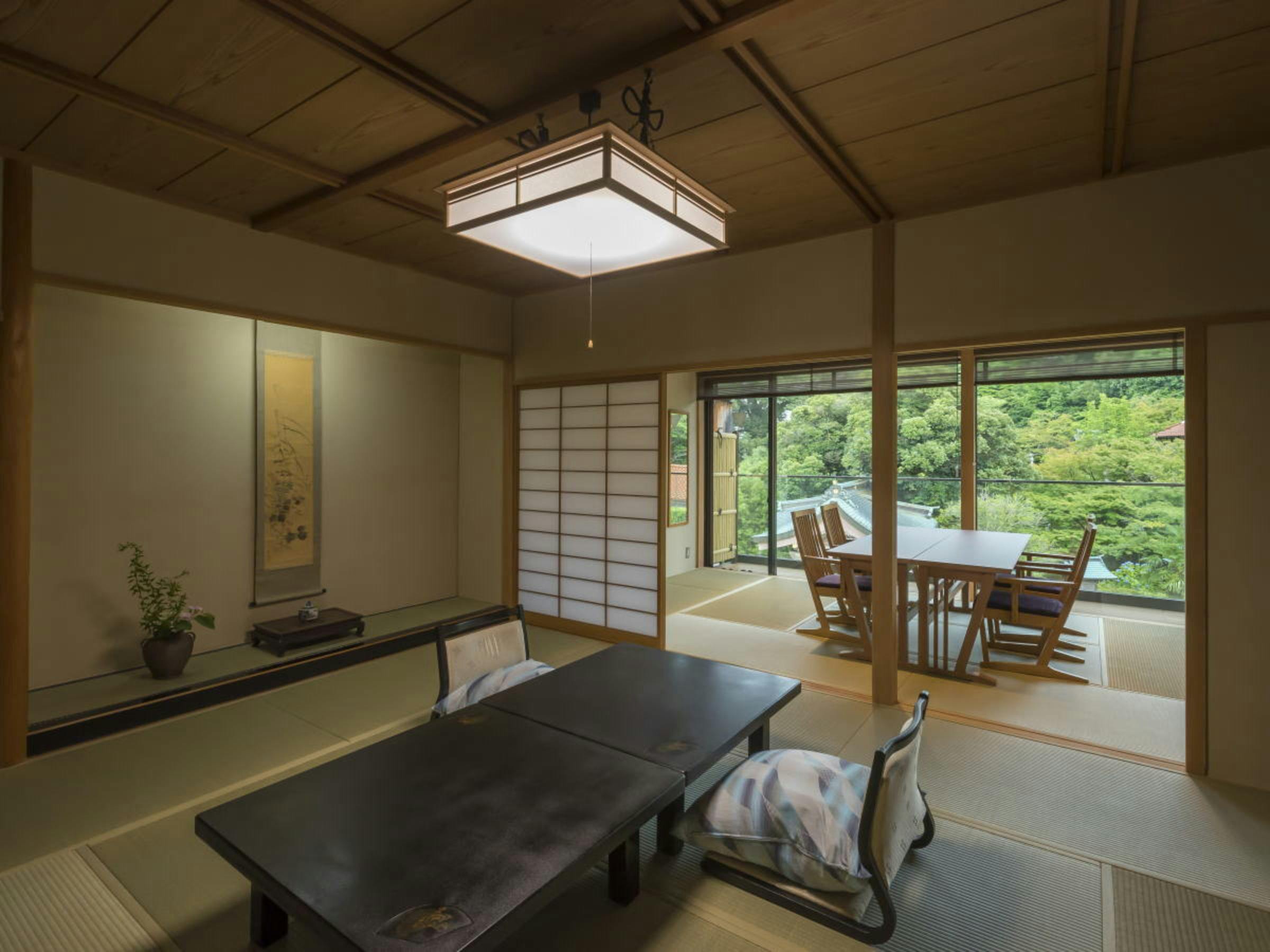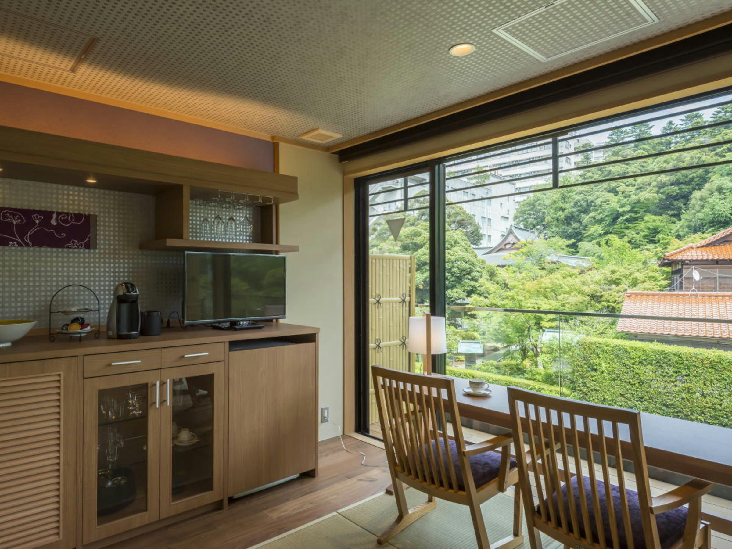 新ひのき露天風呂付客室のダイニングタイプ。12.5畳の客室に広々としたダイニングルームがございます。山代の景色を眺めながら、ごゆっくり出来立てのお食事をお楽しみいただけます。