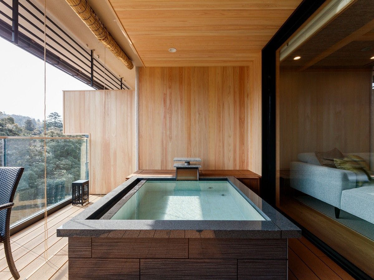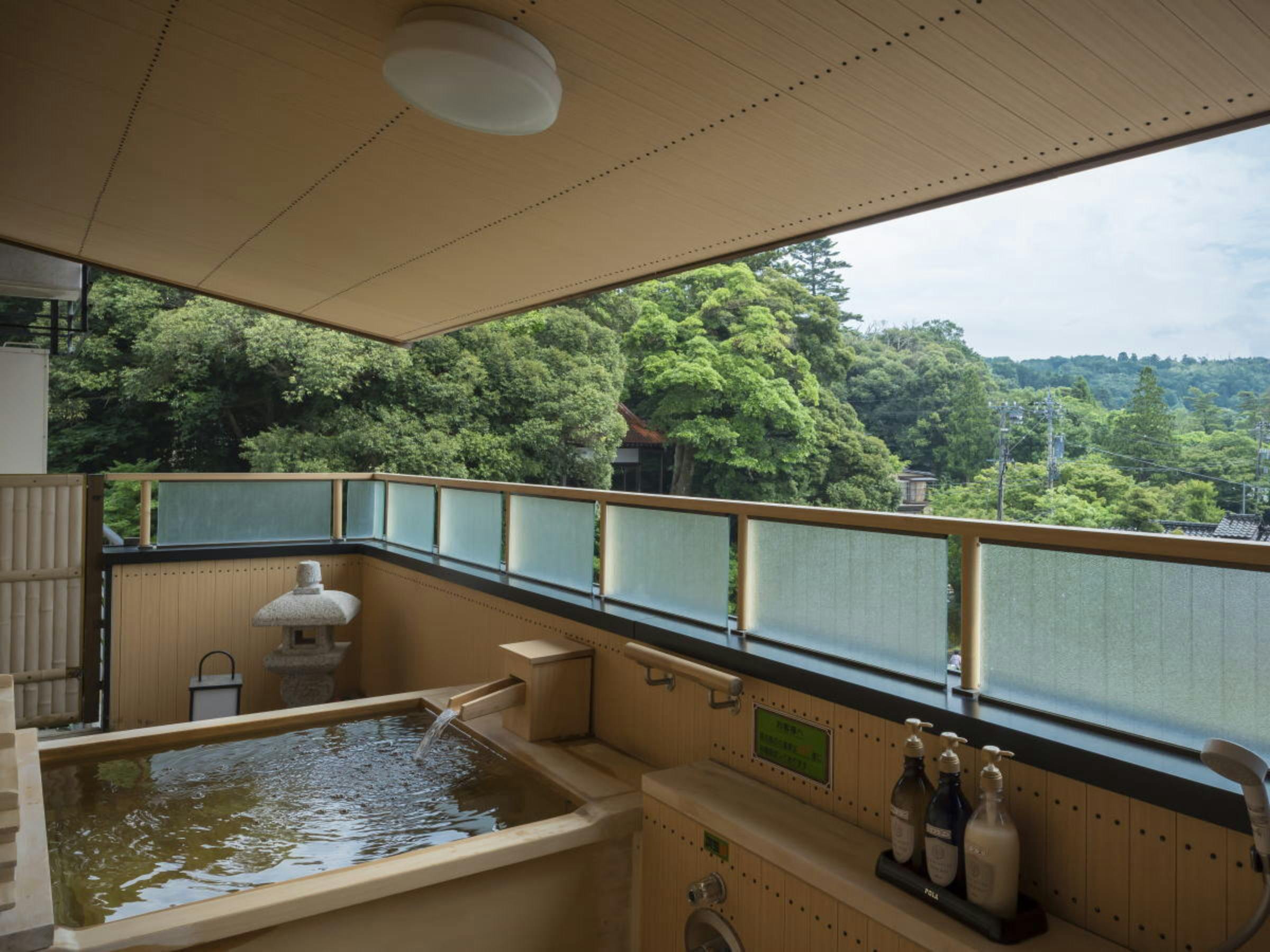 お部屋の露天風呂には山代1号泉の源泉のお湯を引き入れ、24時間お好きな時にご利用いただけるようご用意いたしました。