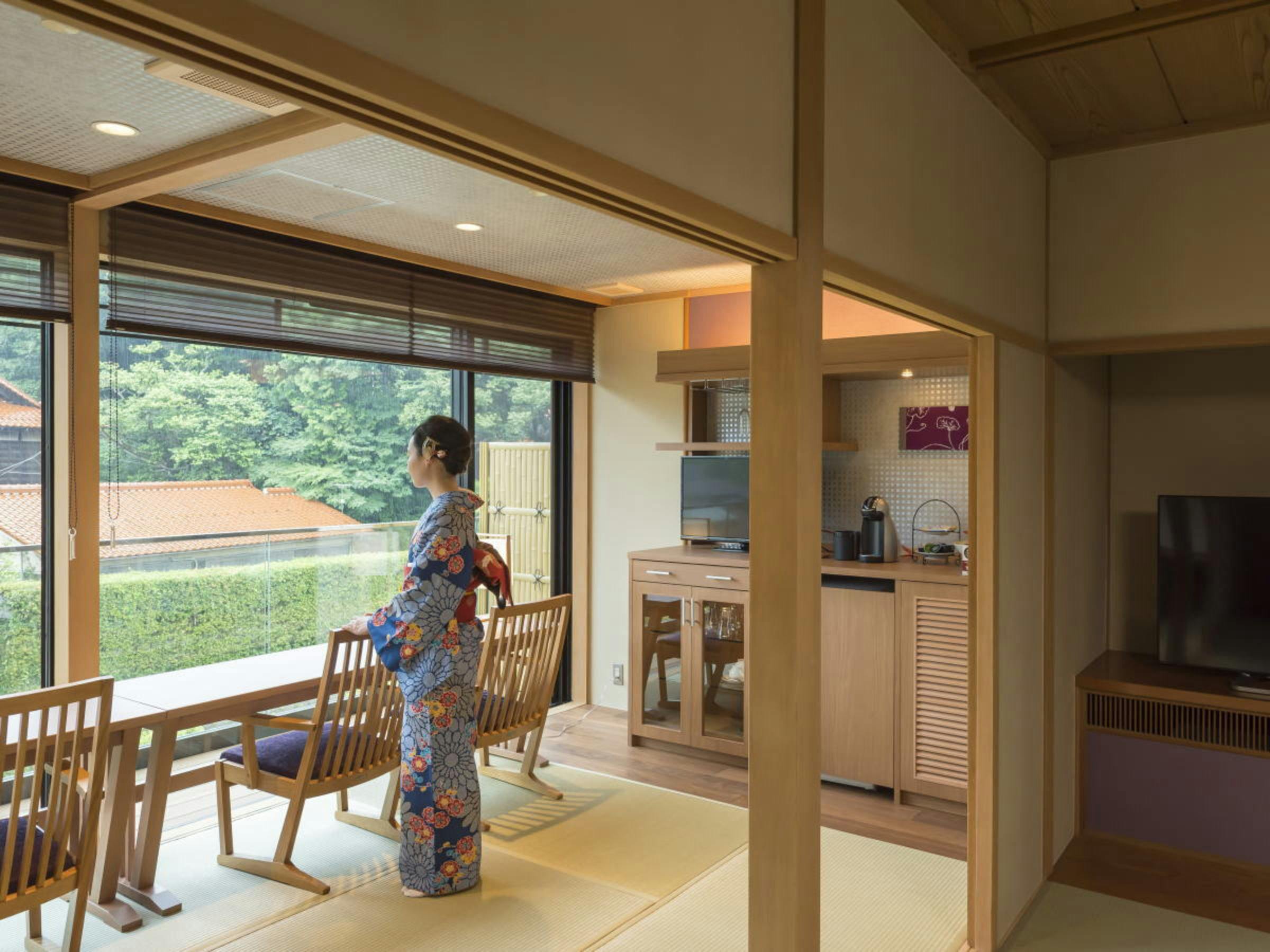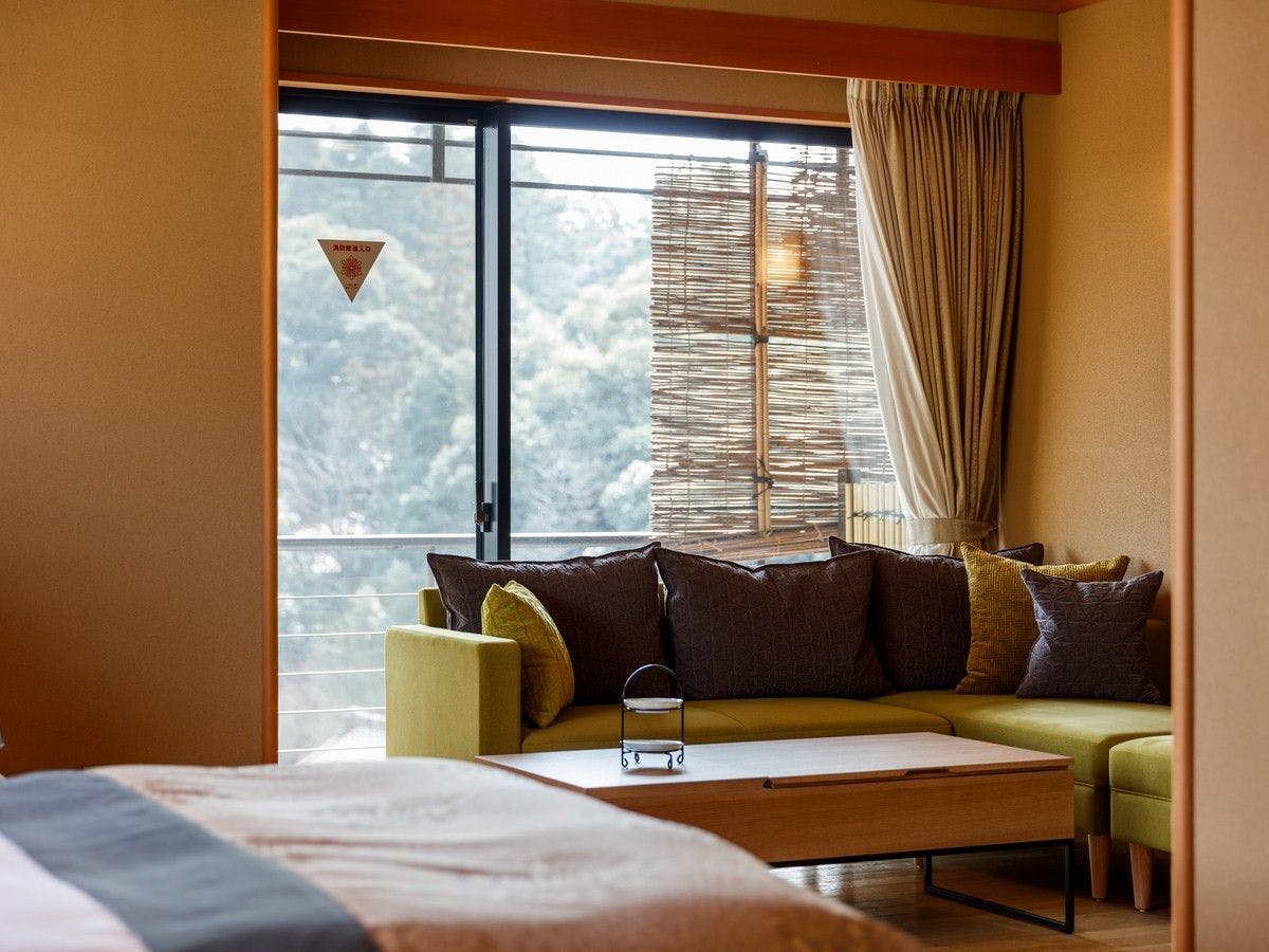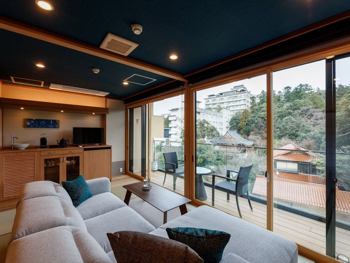 室内はコーナールームで目の前に山代の温泉街と薬王院、服部神社など四季折々の風情と温泉街の情緒をお愉しみ頂けます。