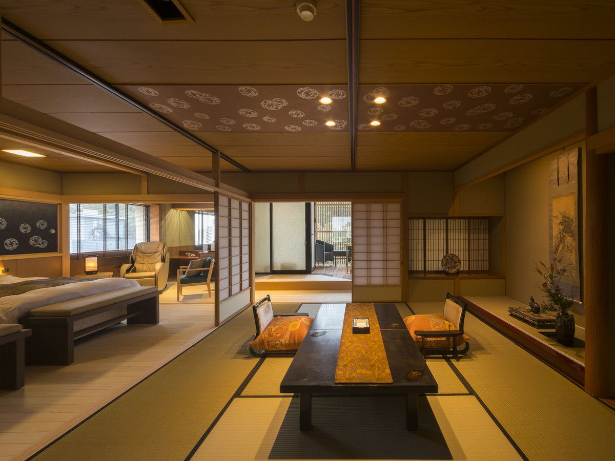 10畳の和室に、広々としたツインベッドルーム+くつろぎスペース。お食事は和室でごゆるりと、お休みはベッドで心地よくおやすみくださいませ。バリアフリーのお部屋となります。