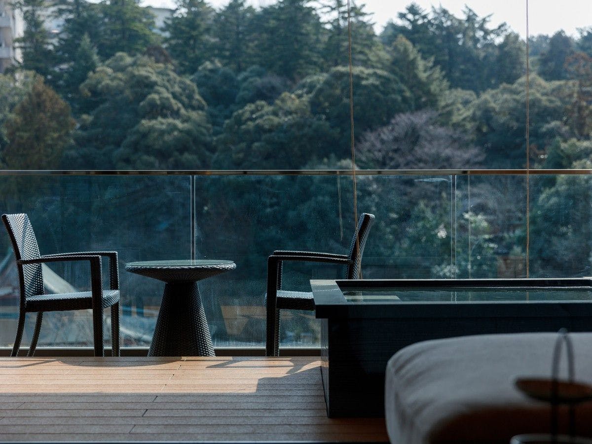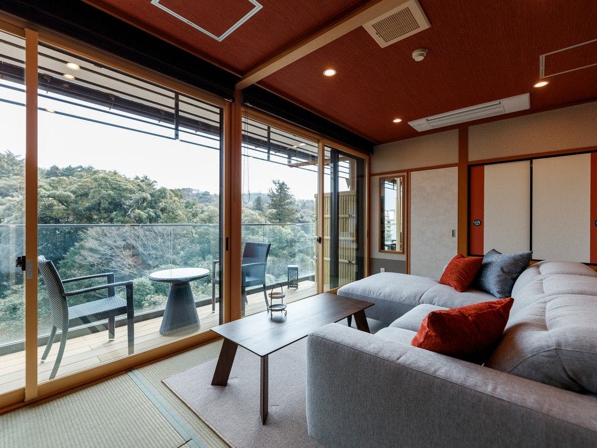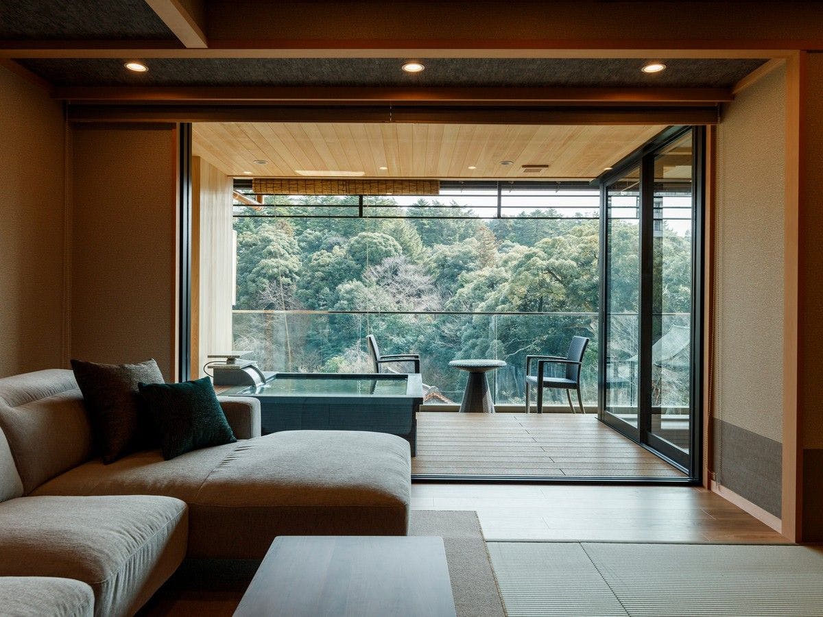 全6室あるお部屋は、それぞれに加賀五彩の色合いをモチーフに、伝統と革新が融合する新感覚のしつらえでお客様をお迎えいたします。ツインベッドやくつろぎのスペースを配した15畳の和室のほか、お部屋の露天風呂には山代温泉の1号源泉を引き入れ、24時間お好きなときにいつでも温泉をお楽しみいただけるようご用意しております。