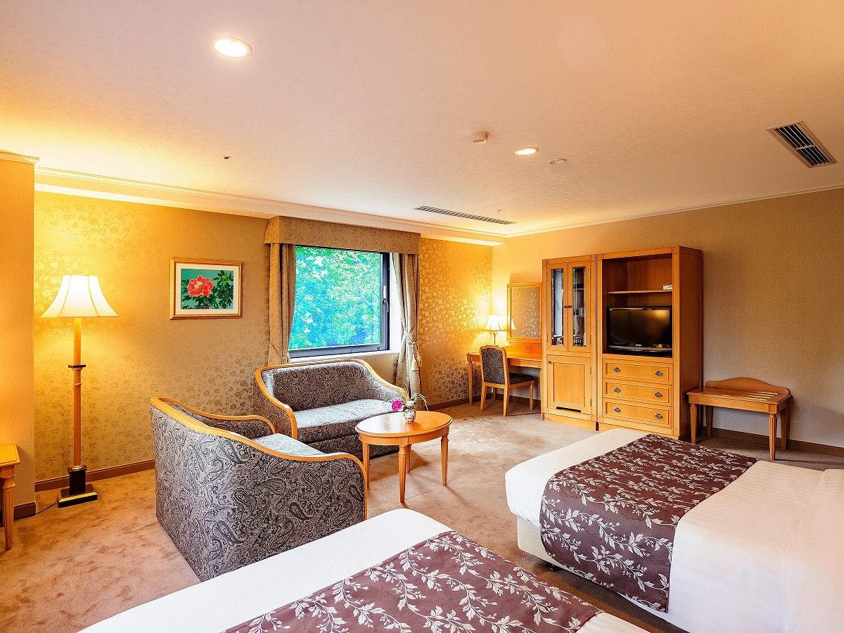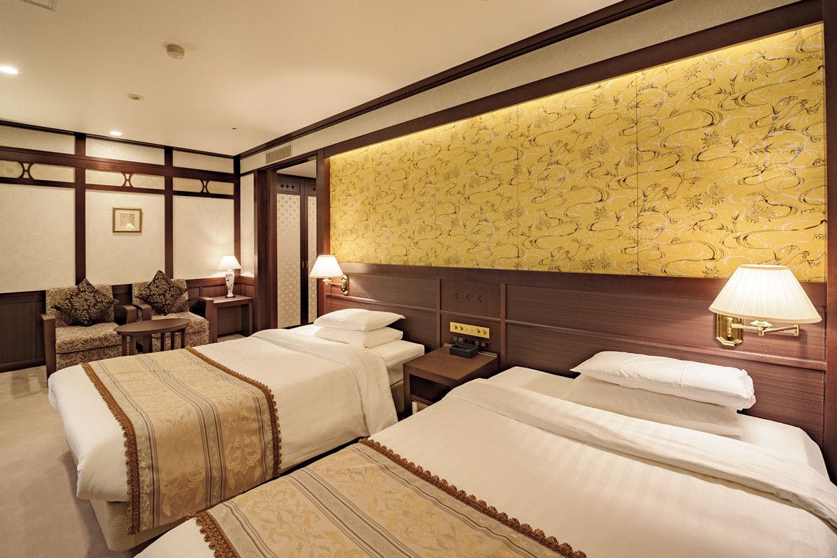 大正ロマンの雰囲気漂うお部屋にクイーンベッドを2台ご用意しております。添い寝のお子様と一緒でもゆったりとお休みいただけます。広々としたベッドでお休みいただけますのでお子様連れのご家族はもちろん、カップルやご友人同士の方にもおすすめです。心も体も満たされる贅沢なひとときをお楽しみください。