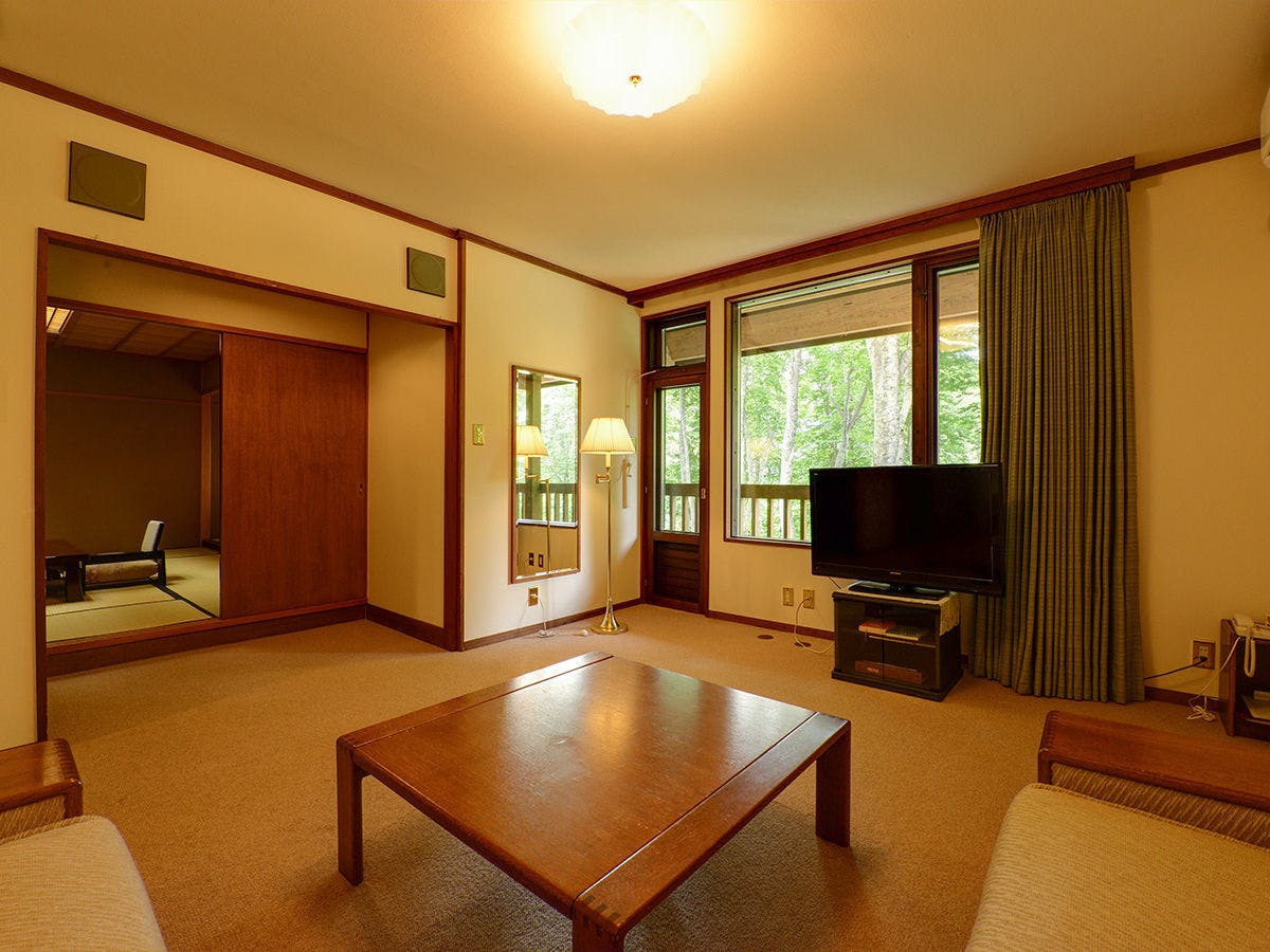 広い窓一面にブナの原生林が見渡せる30平米の空間。