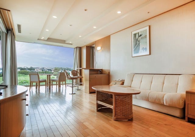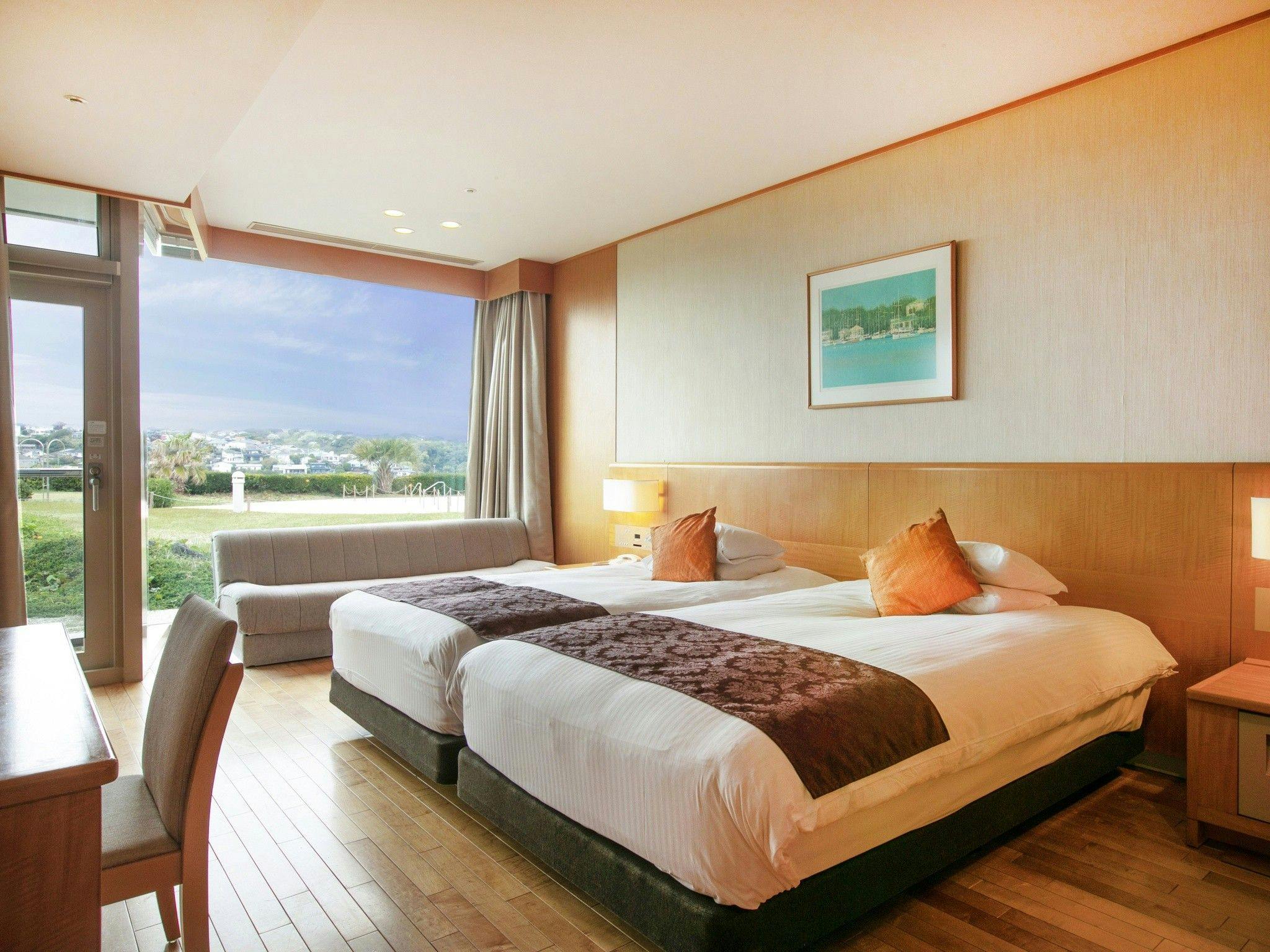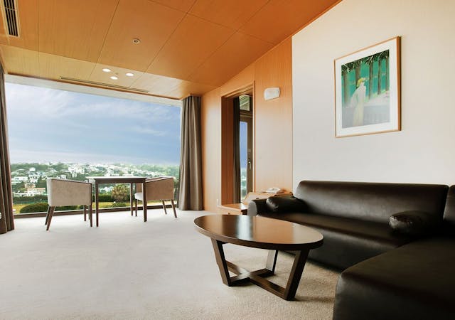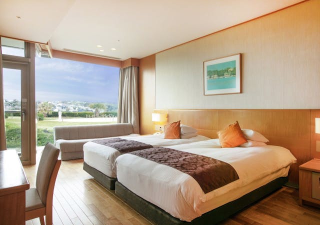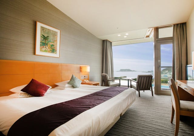 相模湾、江ノ島側が前面窓になっており海が一望できるスイートルーム。