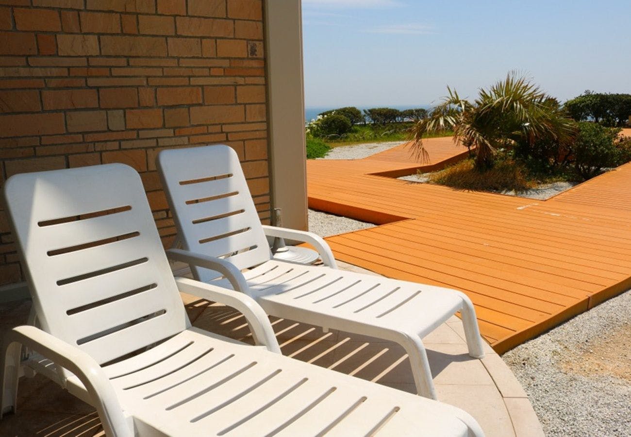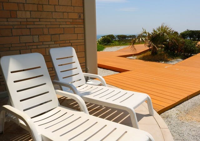 リビングからバルコニーへ出ると、屋外テラスに向いたサマーベッド(利用は8:00P.M.まで)で心地よい潮風を感じながらゆったりと湘南の景色を眺められます。