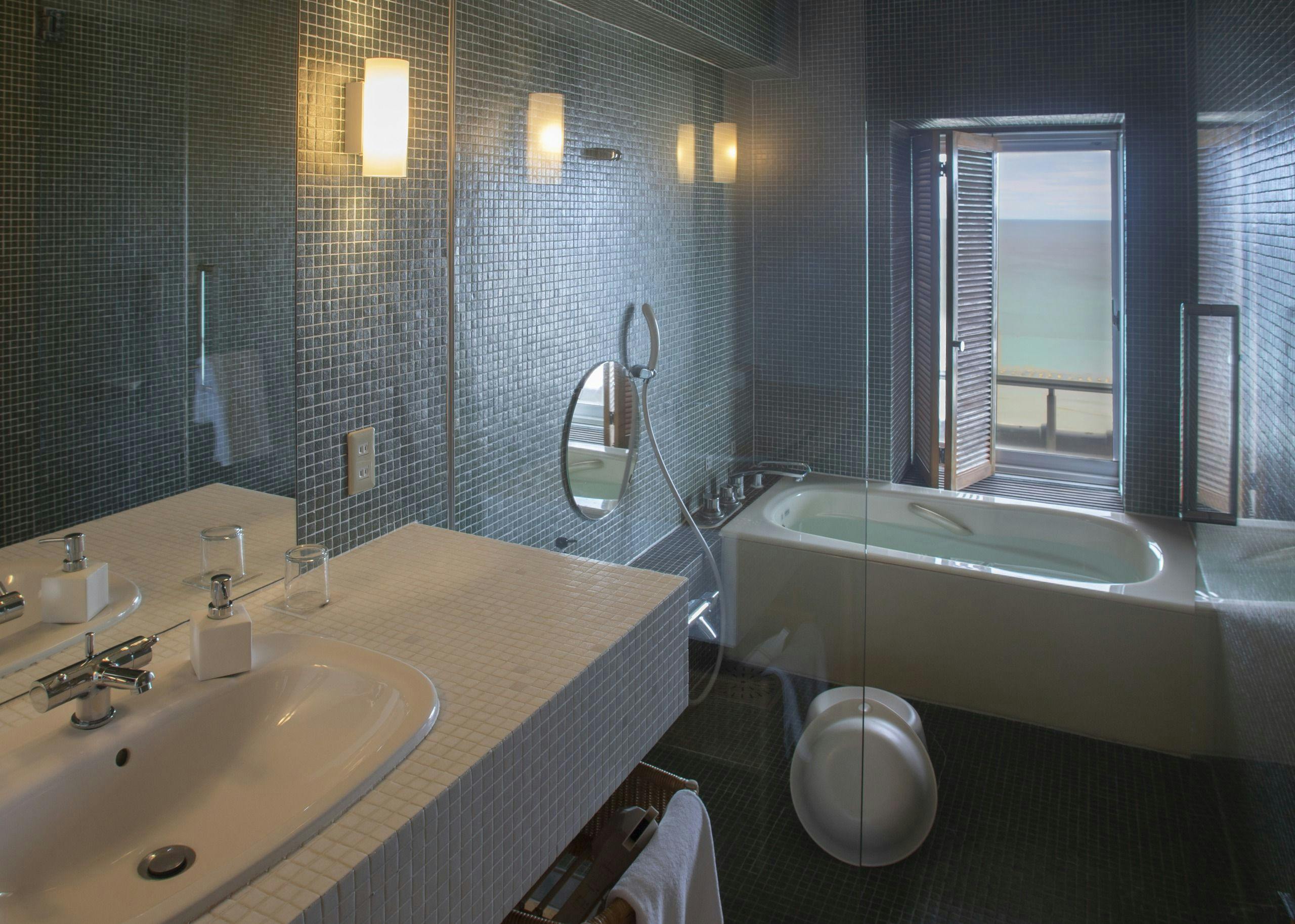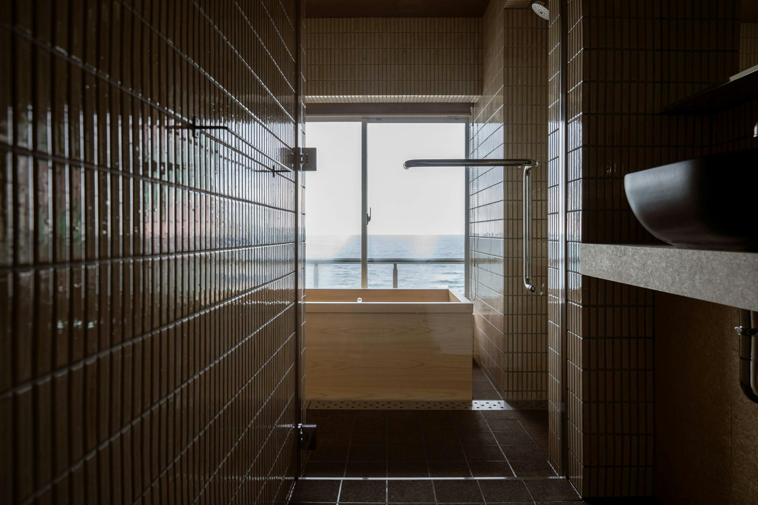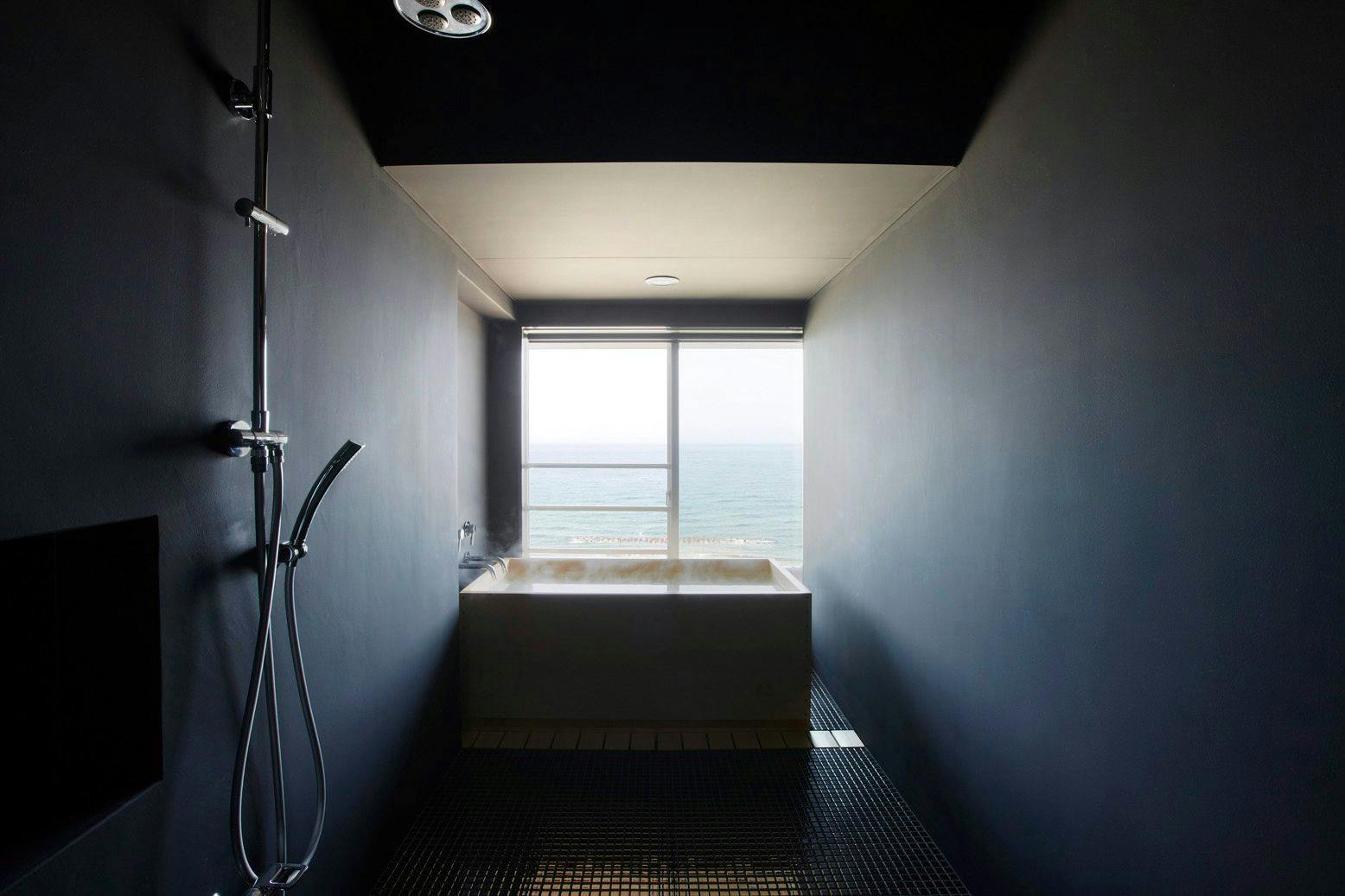 最上階特別フロア「HOURAI」の1112号室は、自邸にいるようなリラックス感とラグジュアリーな旅のひとときが味わえるお部屋。源泉が引かれた海を望む内風呂付き。