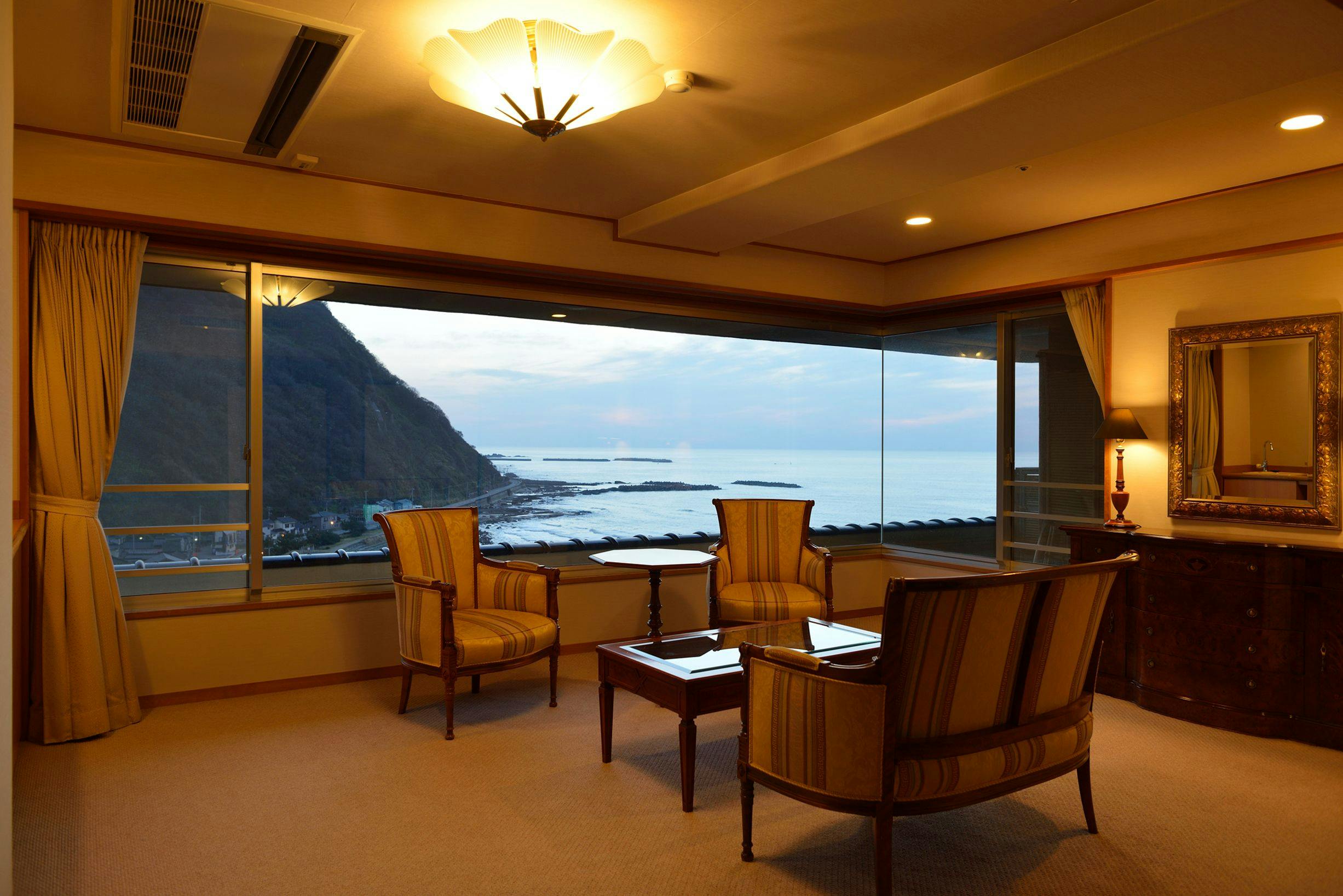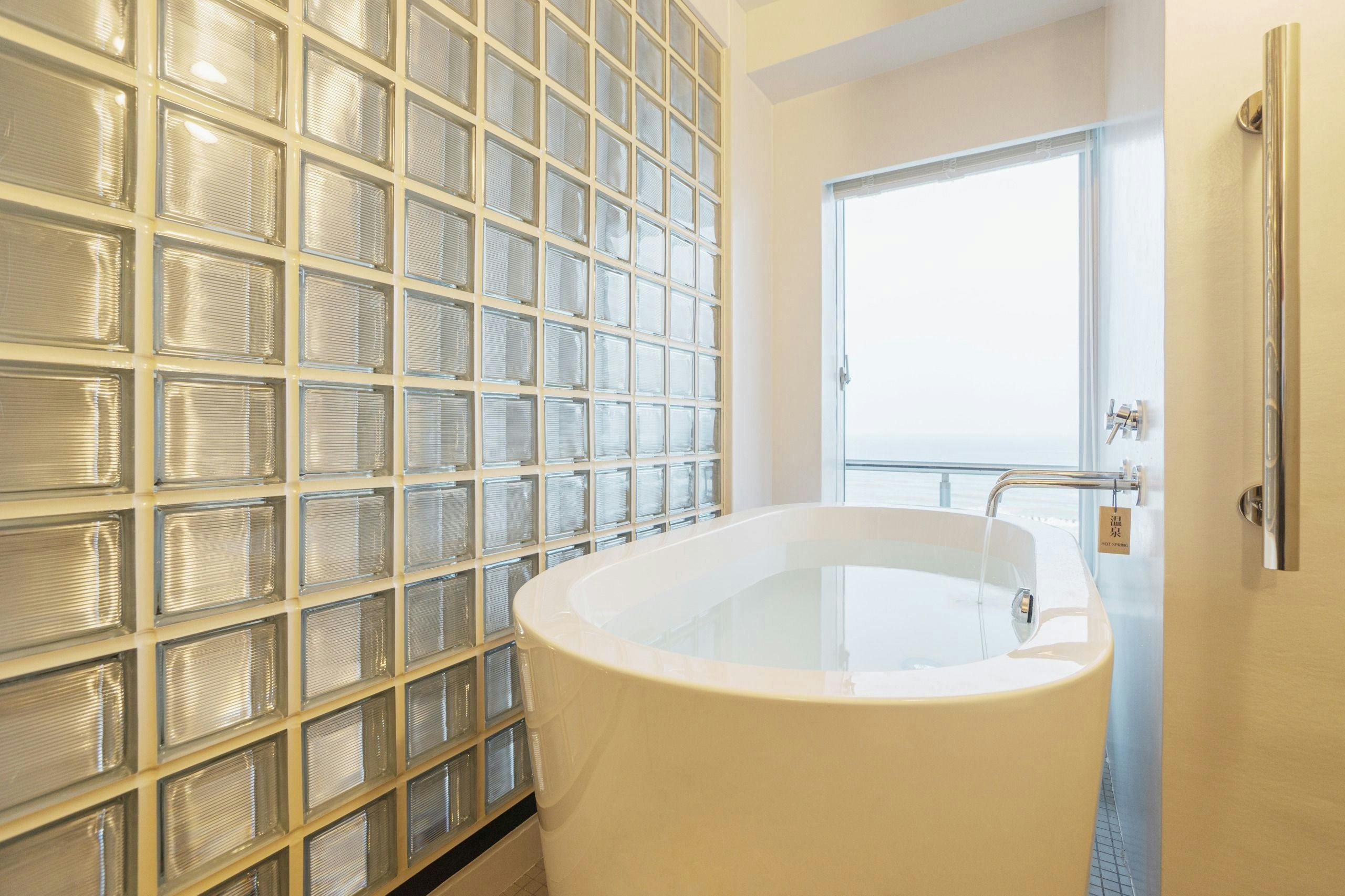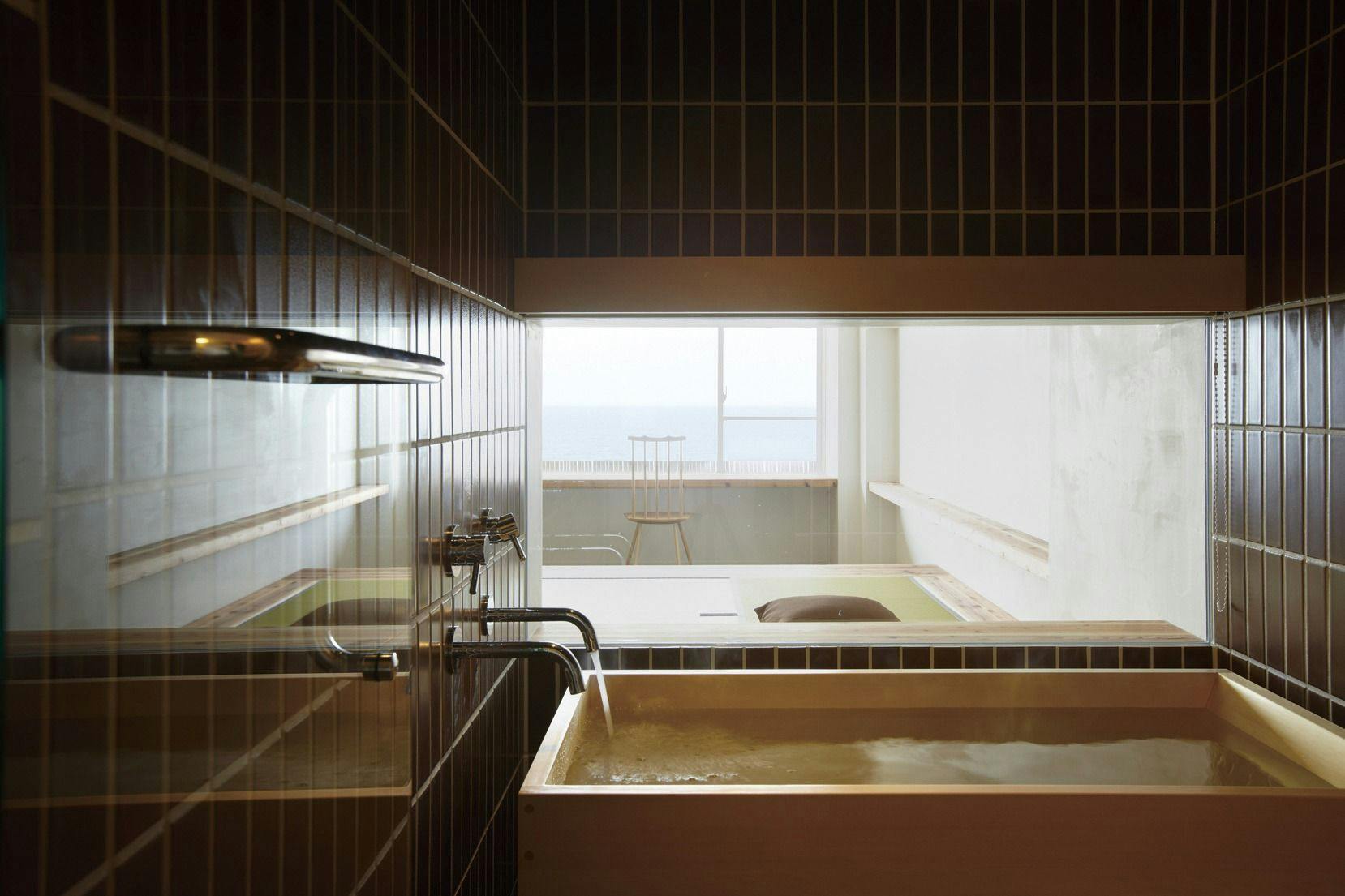 最上階特別フロア「HOURAI」の1112号室は、自邸にいるようなリラックス感とラグジュアリーな旅のひとときが味わえるお部屋。源泉が引かれた海を望む内風呂付き。