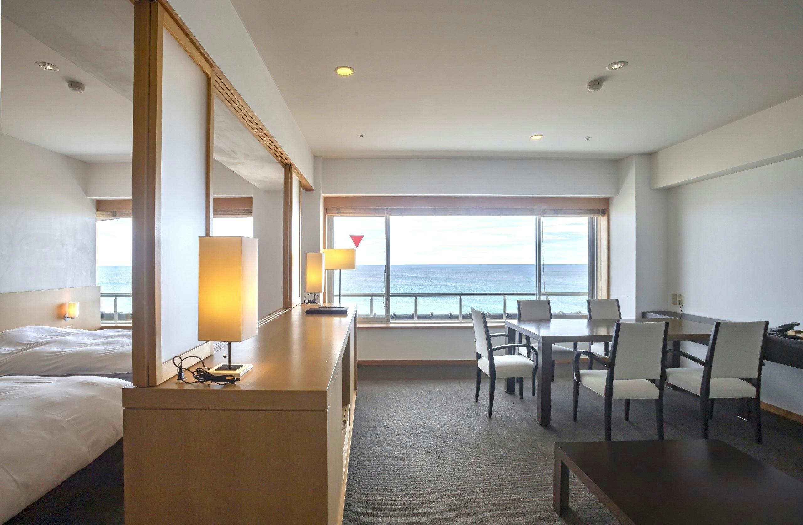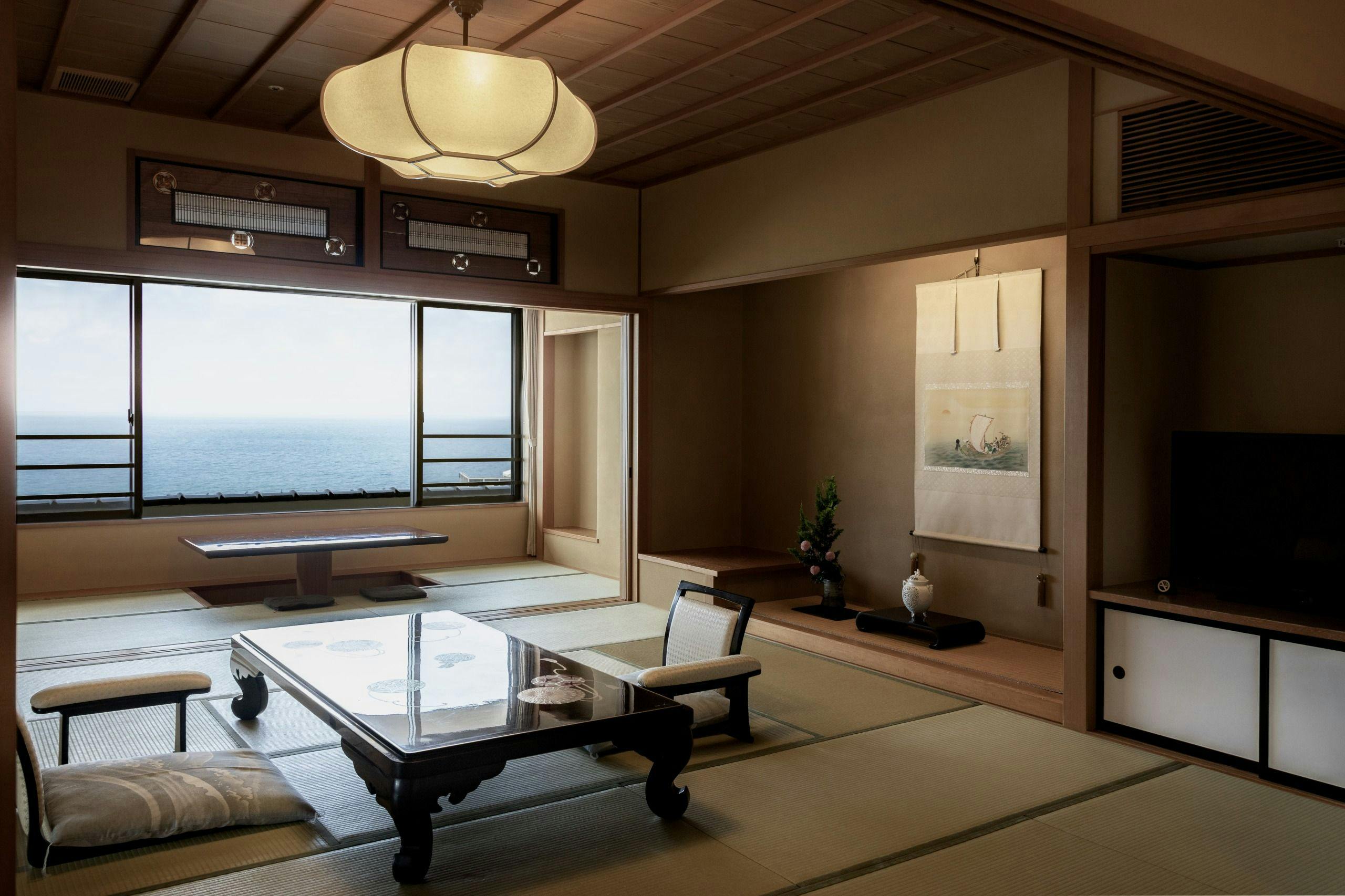 最上階特別フロア「HOURAI」の1110号室は、角部屋の空間を贅沢に使用した、端正な和室とオーセンティックな洋室を有するお部屋。亀や唯一の客室露天風呂が人気。