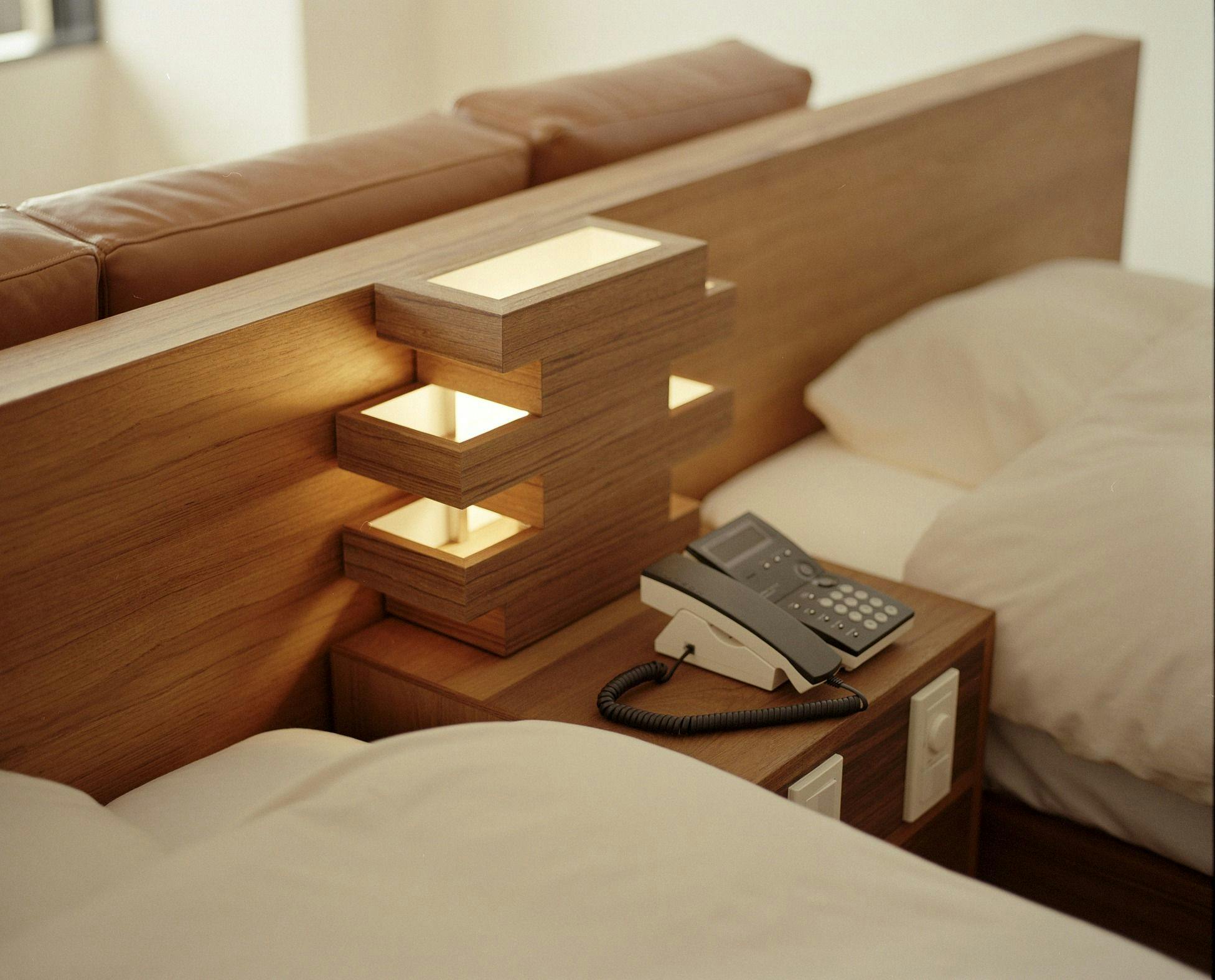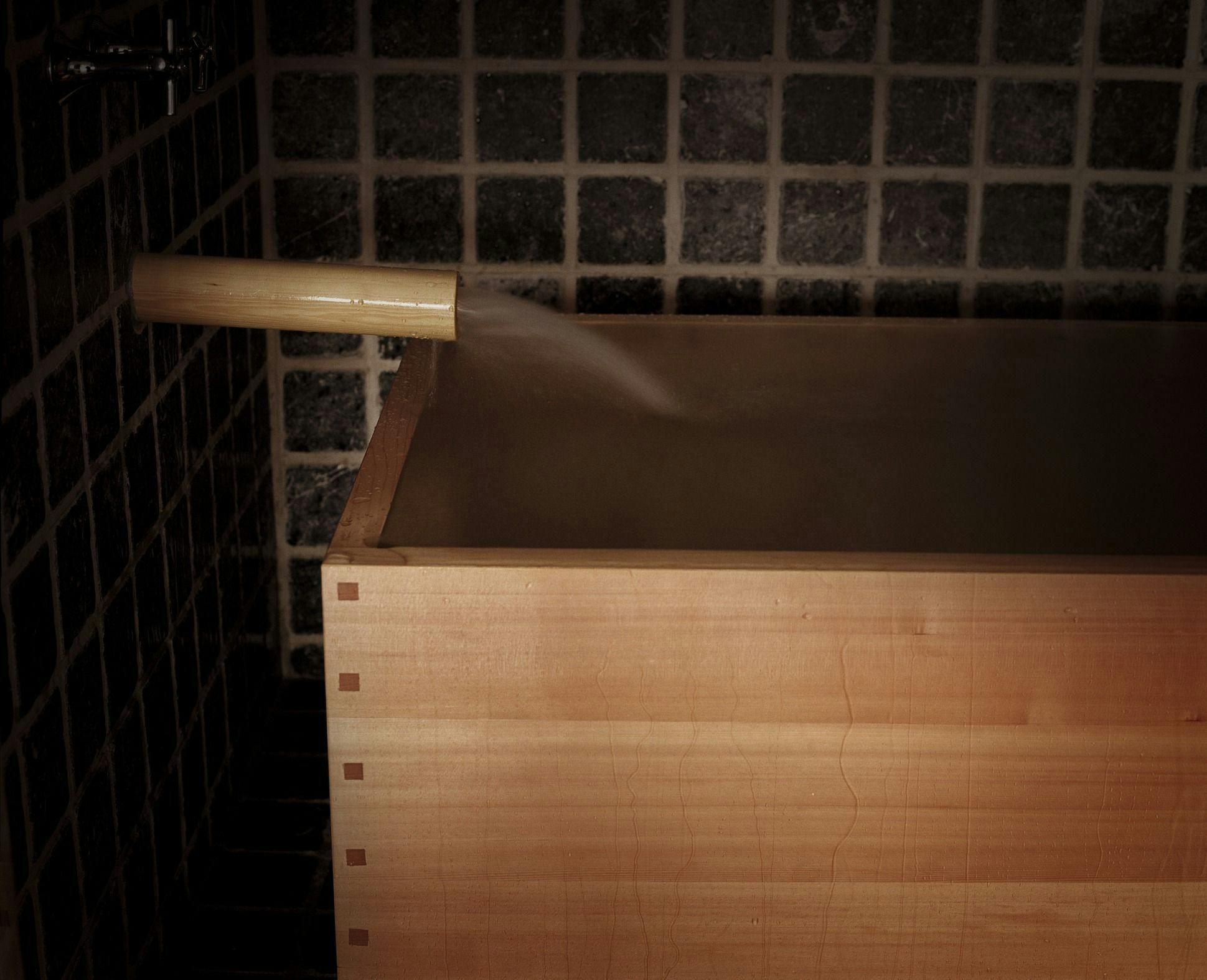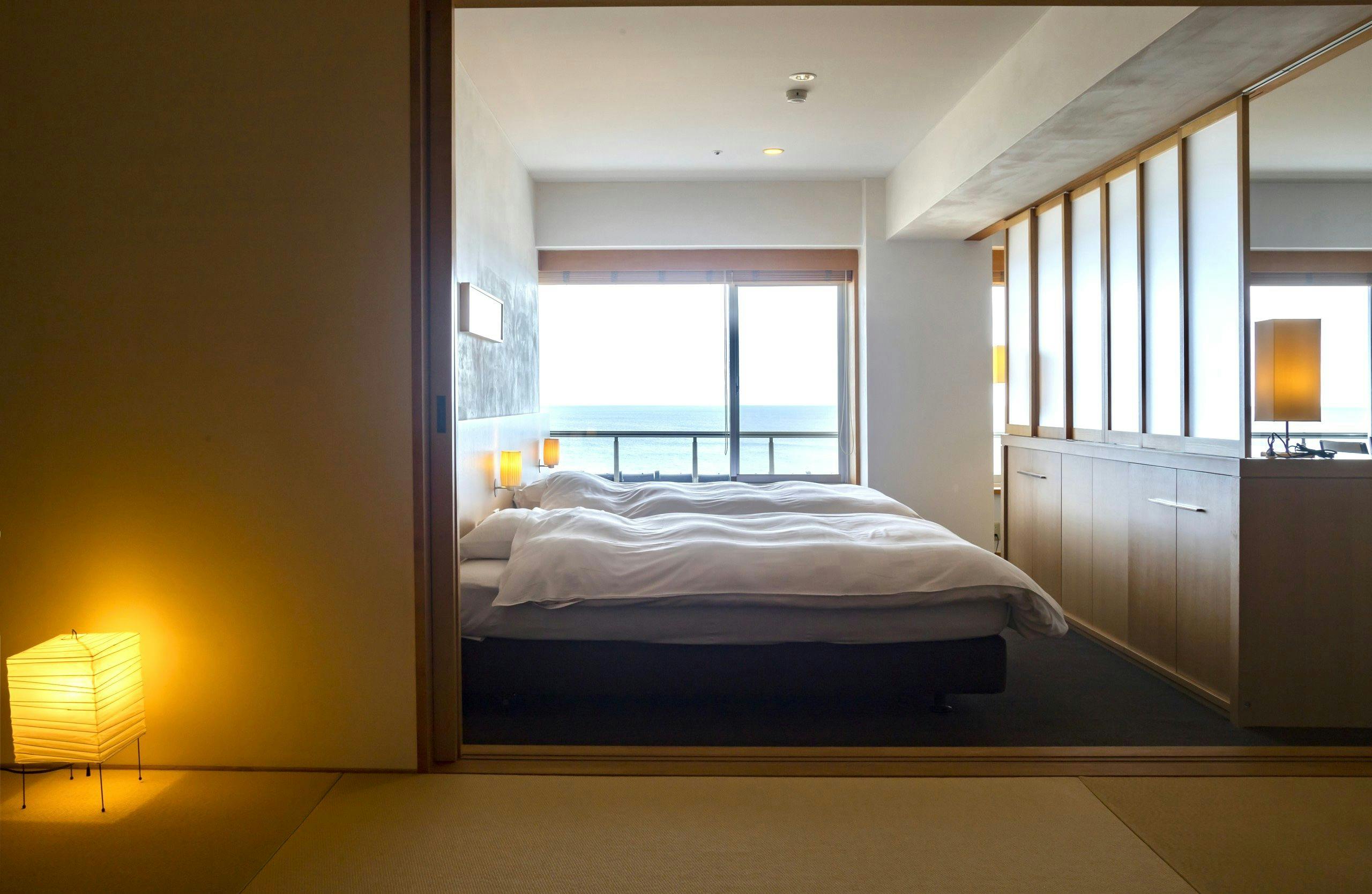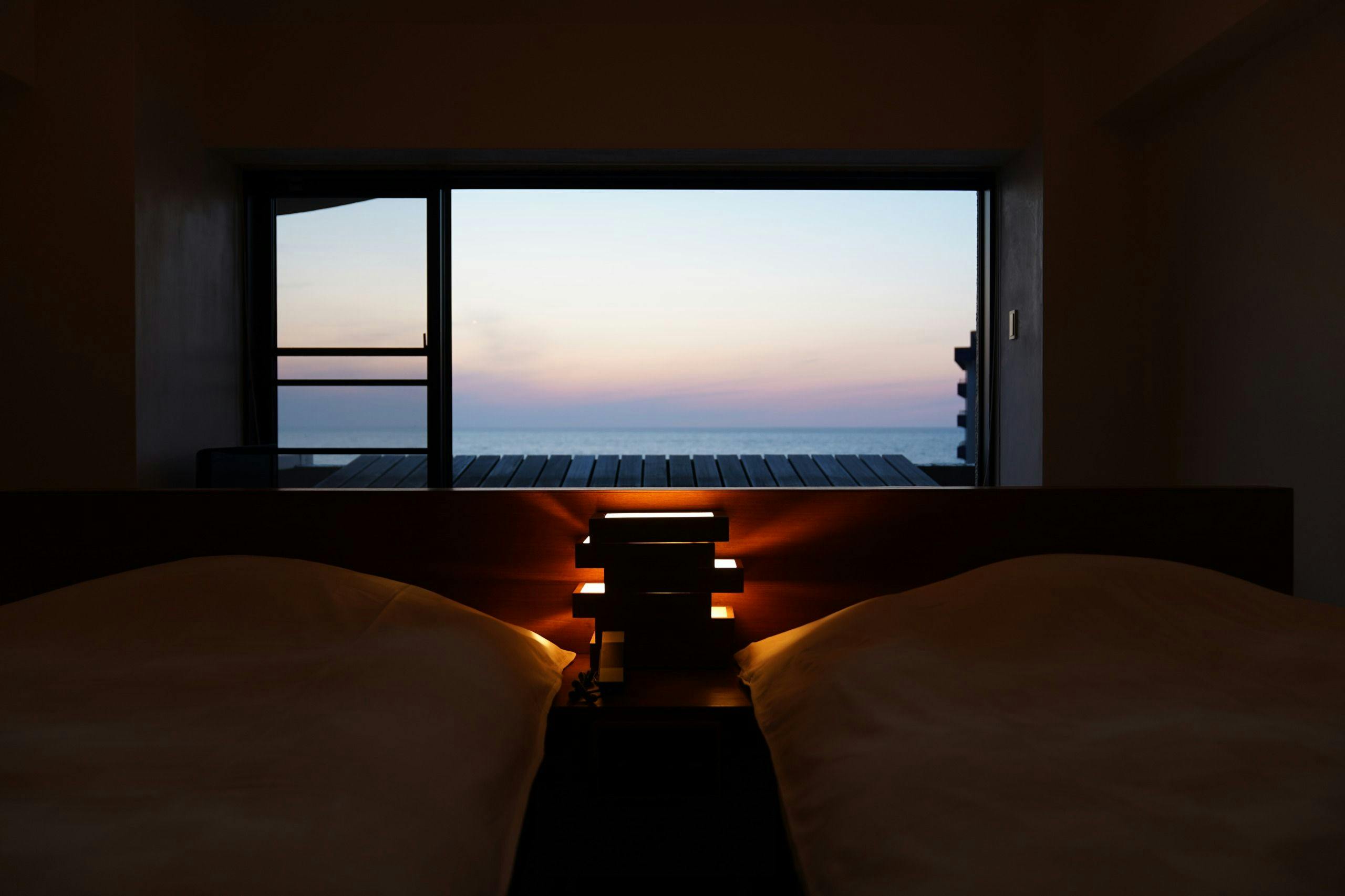源泉が引かれた浴室を始め、ツインのベッドと、海と正対するソファが機能的に配されたお部屋です。白壁と木目の壁に囲まれたシンプルなお部屋で日常を忘れるひとときを。