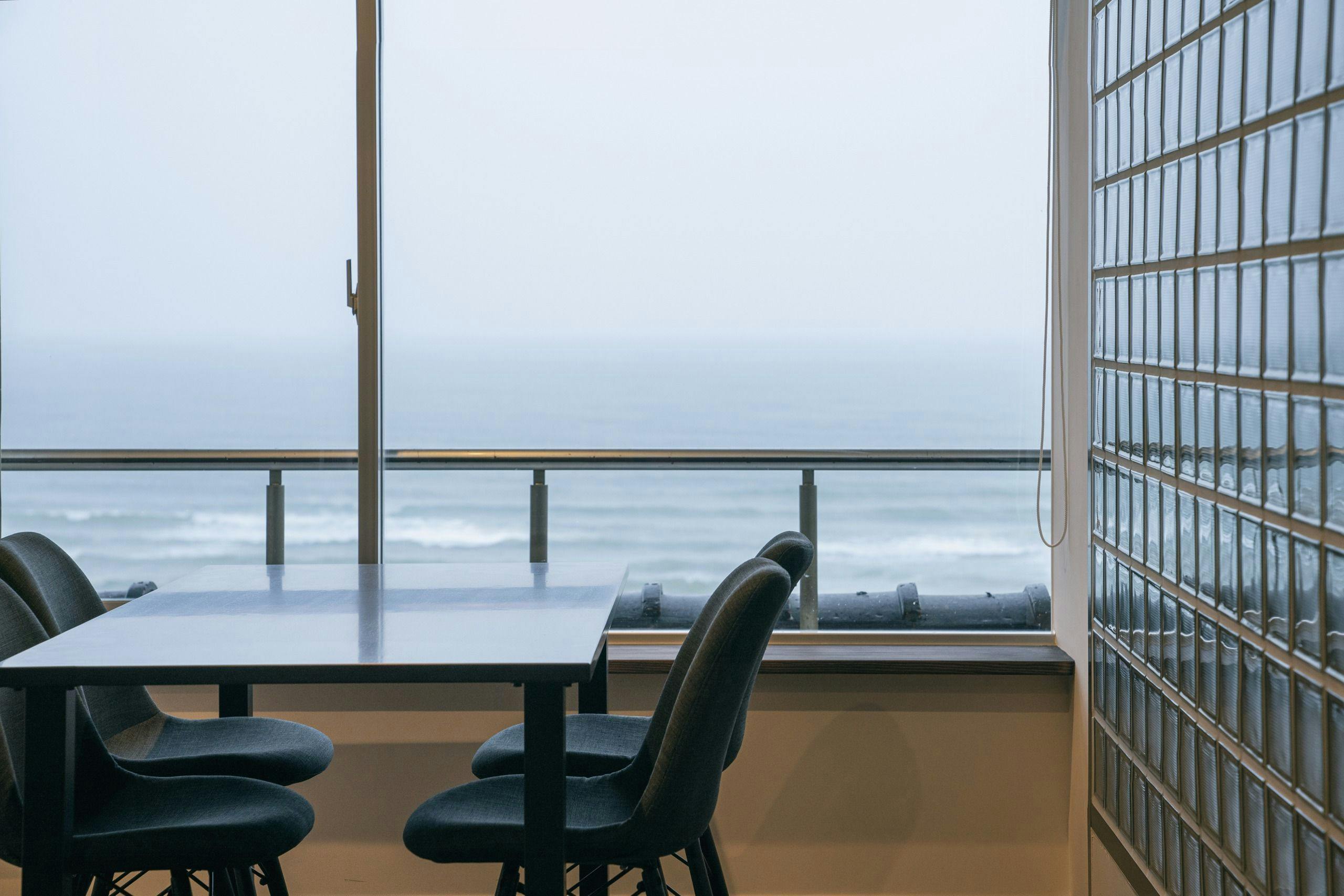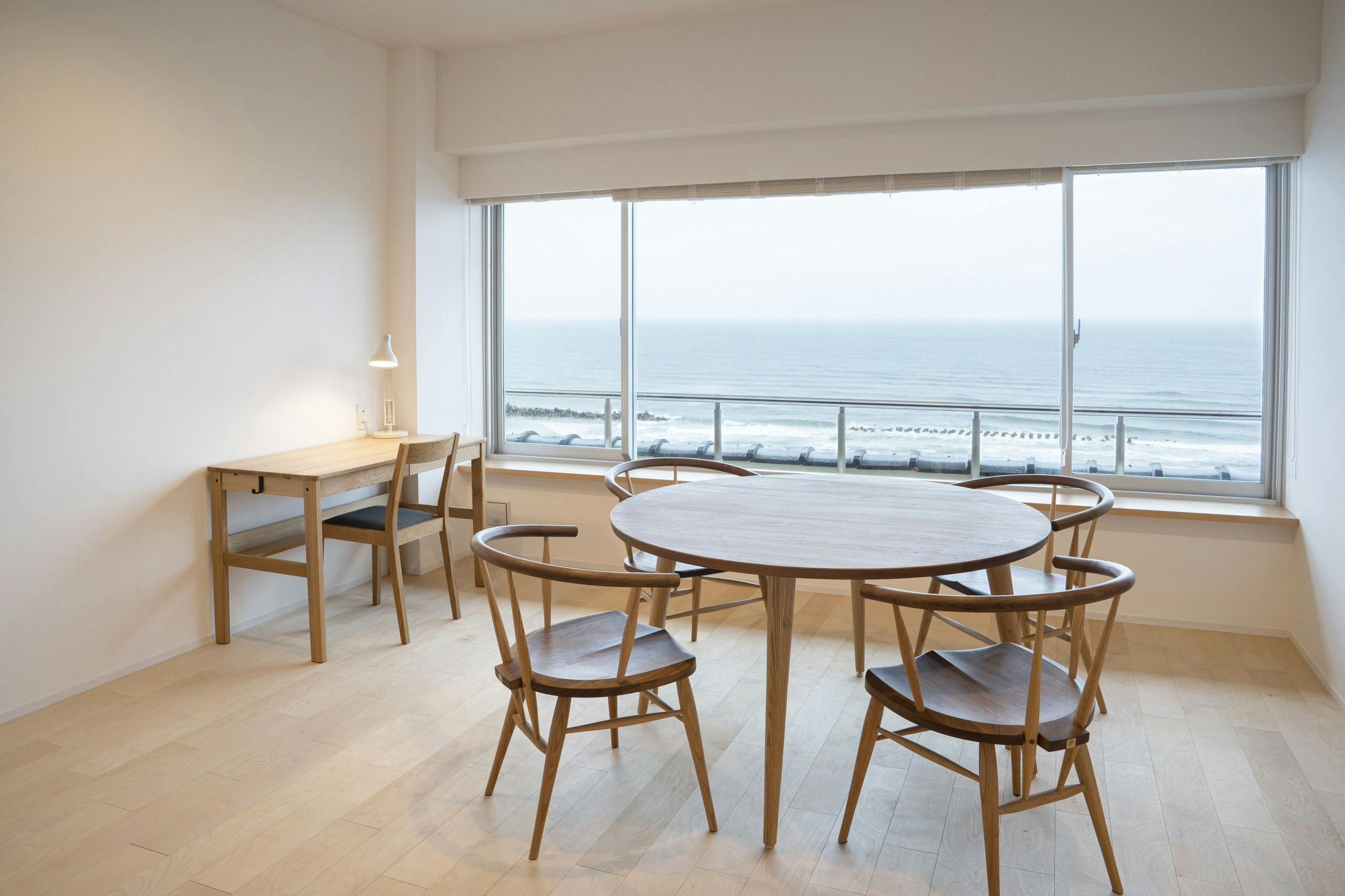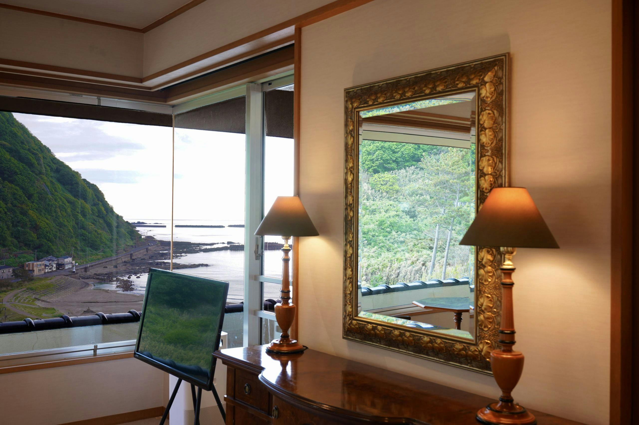 窓辺の長机で海を一望、小上がりの和風寝室。お二人専用特別ルーム。海の見える温泉内風呂付