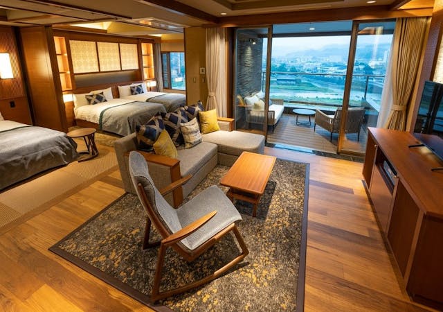 窓からは、遠く見渡す「南九州山稜」、日本百名城の歴史深い「人吉城址」、眼下に日本三急流「球磨川」を望めます。