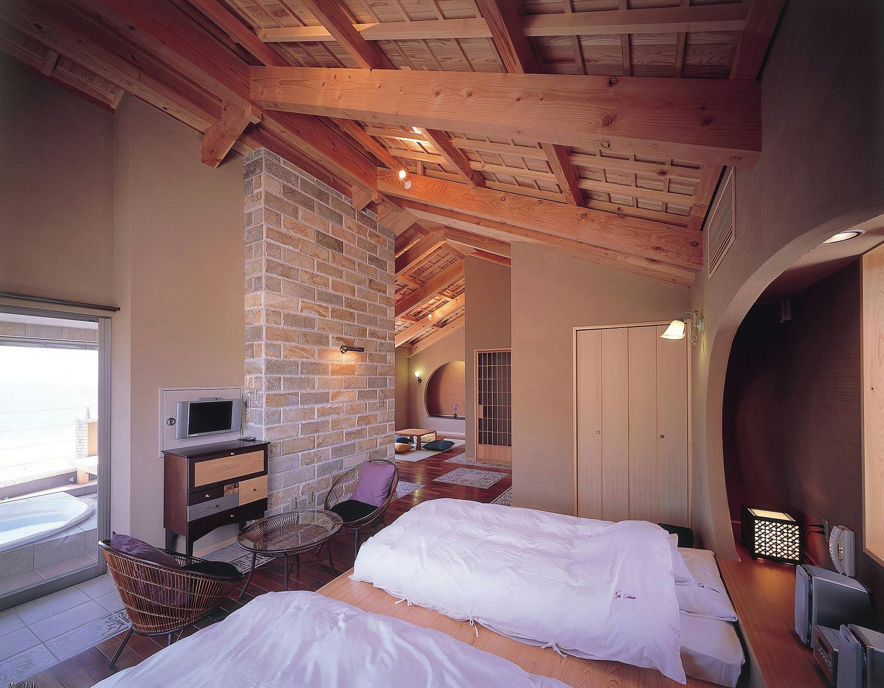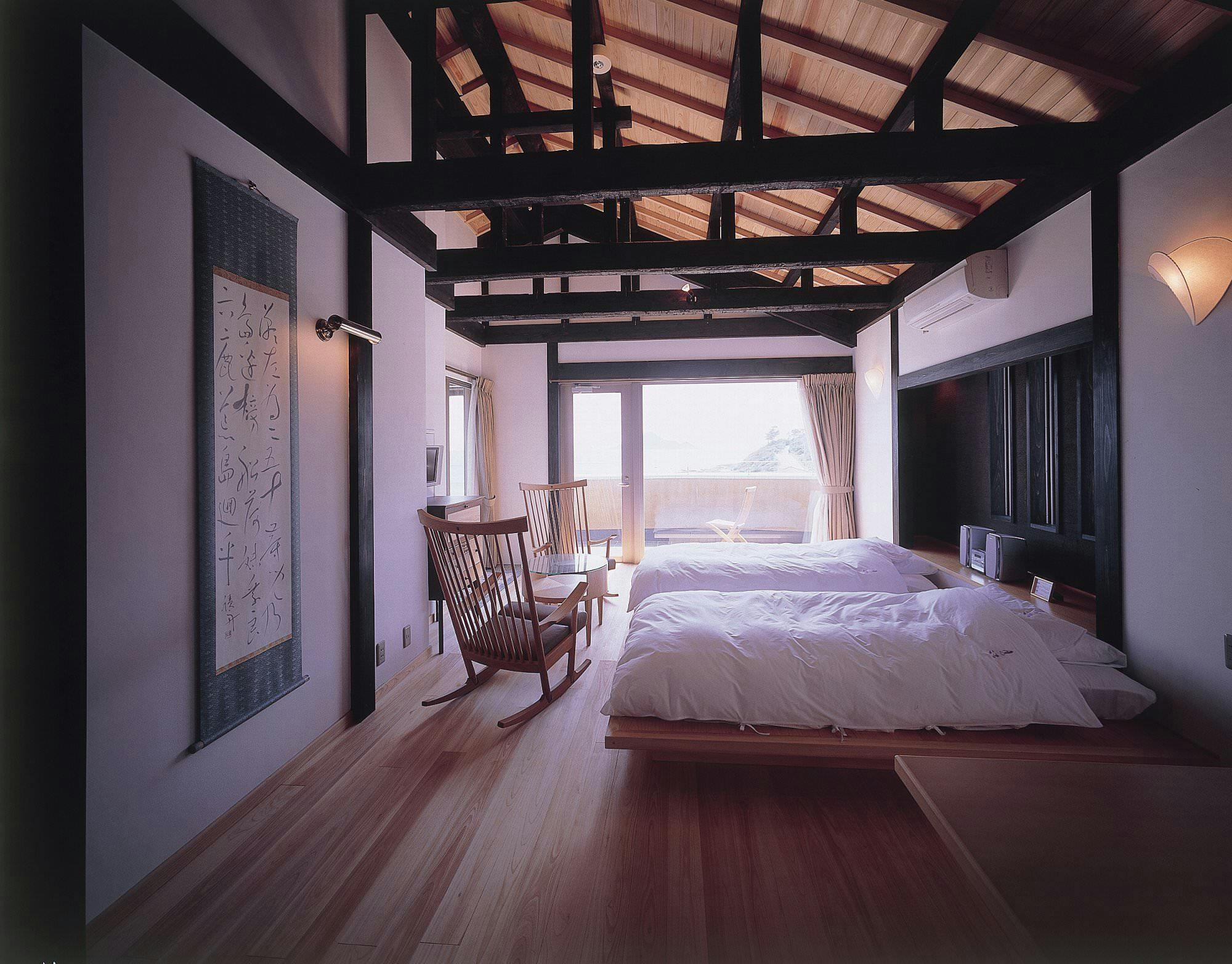 ゆったりしたスペースのベッドルームは、白と黒を基調とした和モダンな空間。 最上階の客室より眺める伊良湖の海は、まさに絶景。空と海の雄大さを実感できます。