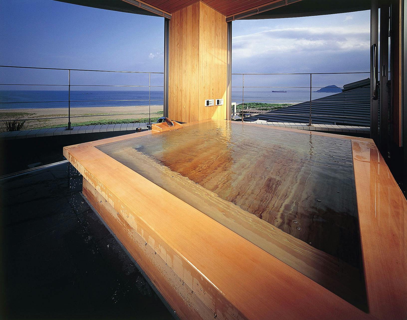 最上階のおぼろ月は、天井が高く、開放感あふれるお部屋です。お部屋の露天風呂はジャグジー付で、海を眺めながら、のんびりお入りいただけます。