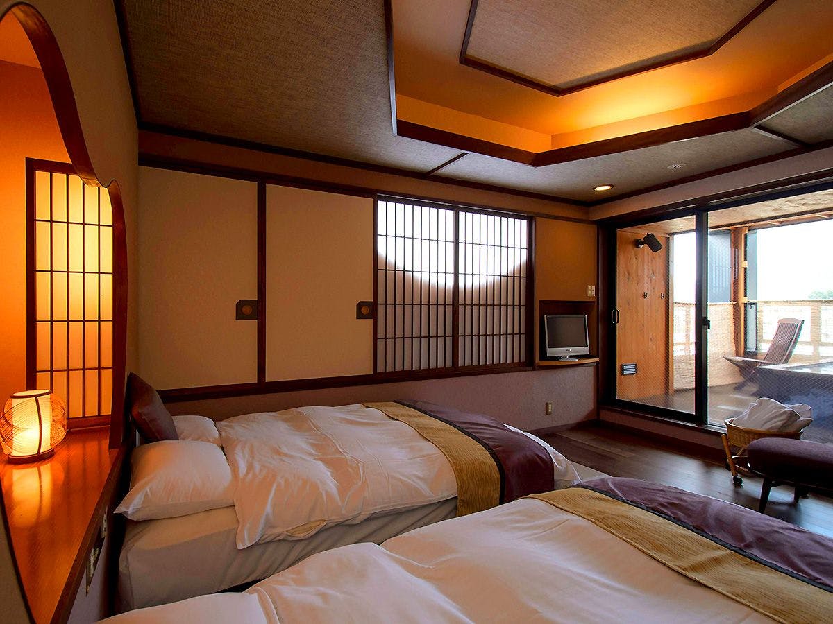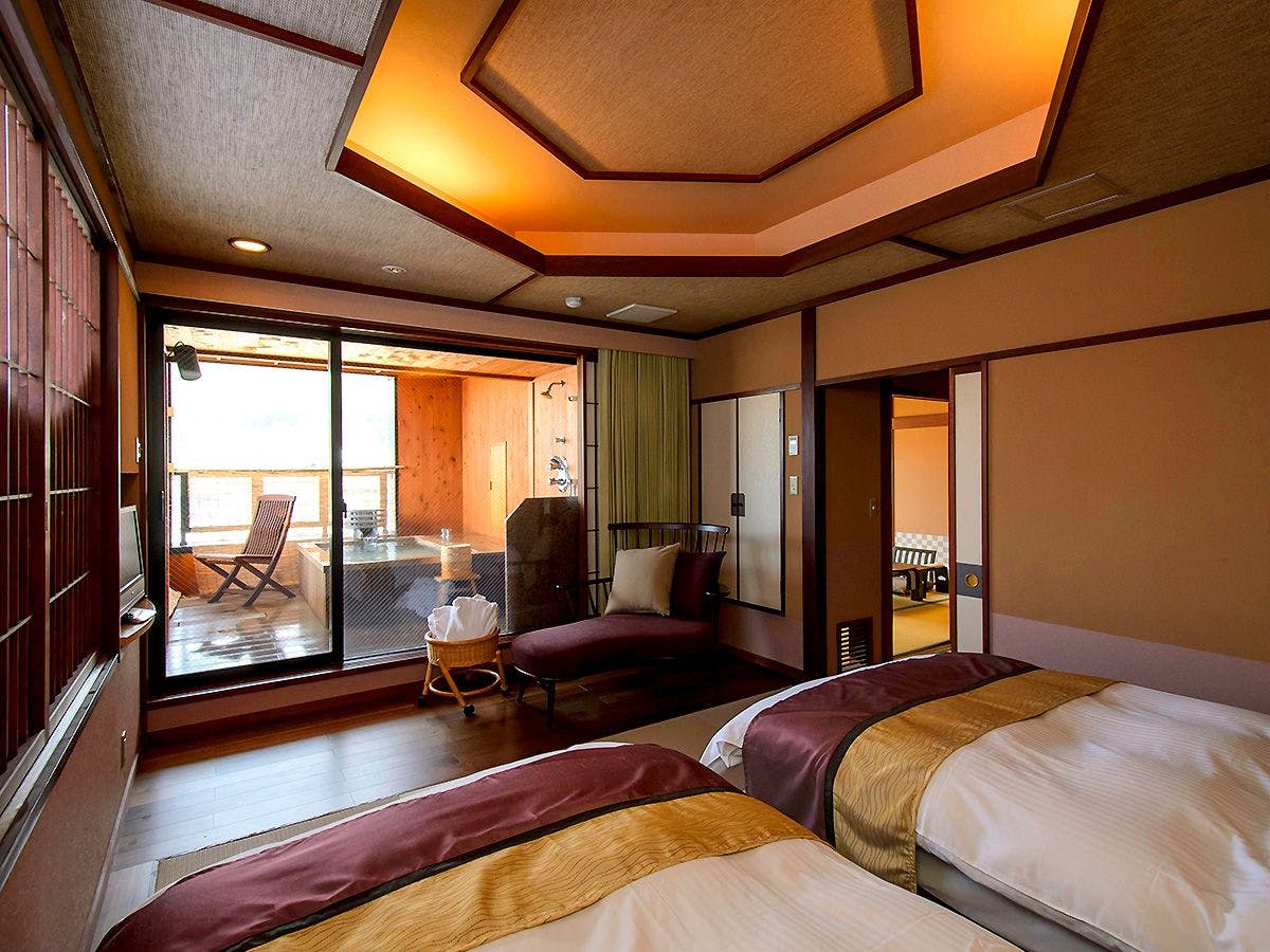■和室10畳+ローベッドツイン+露天風呂+内風呂の機能的な仕様の客室です。