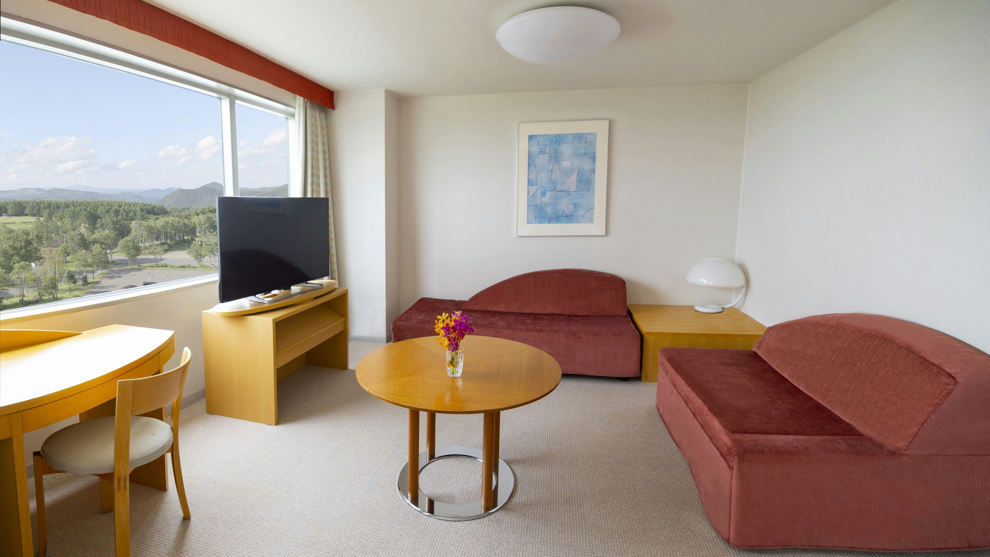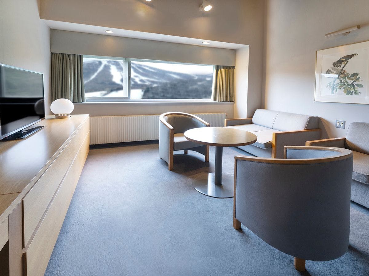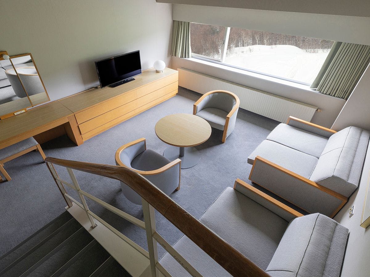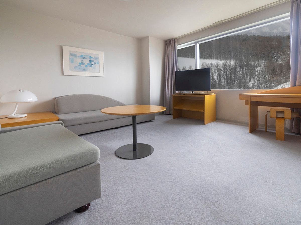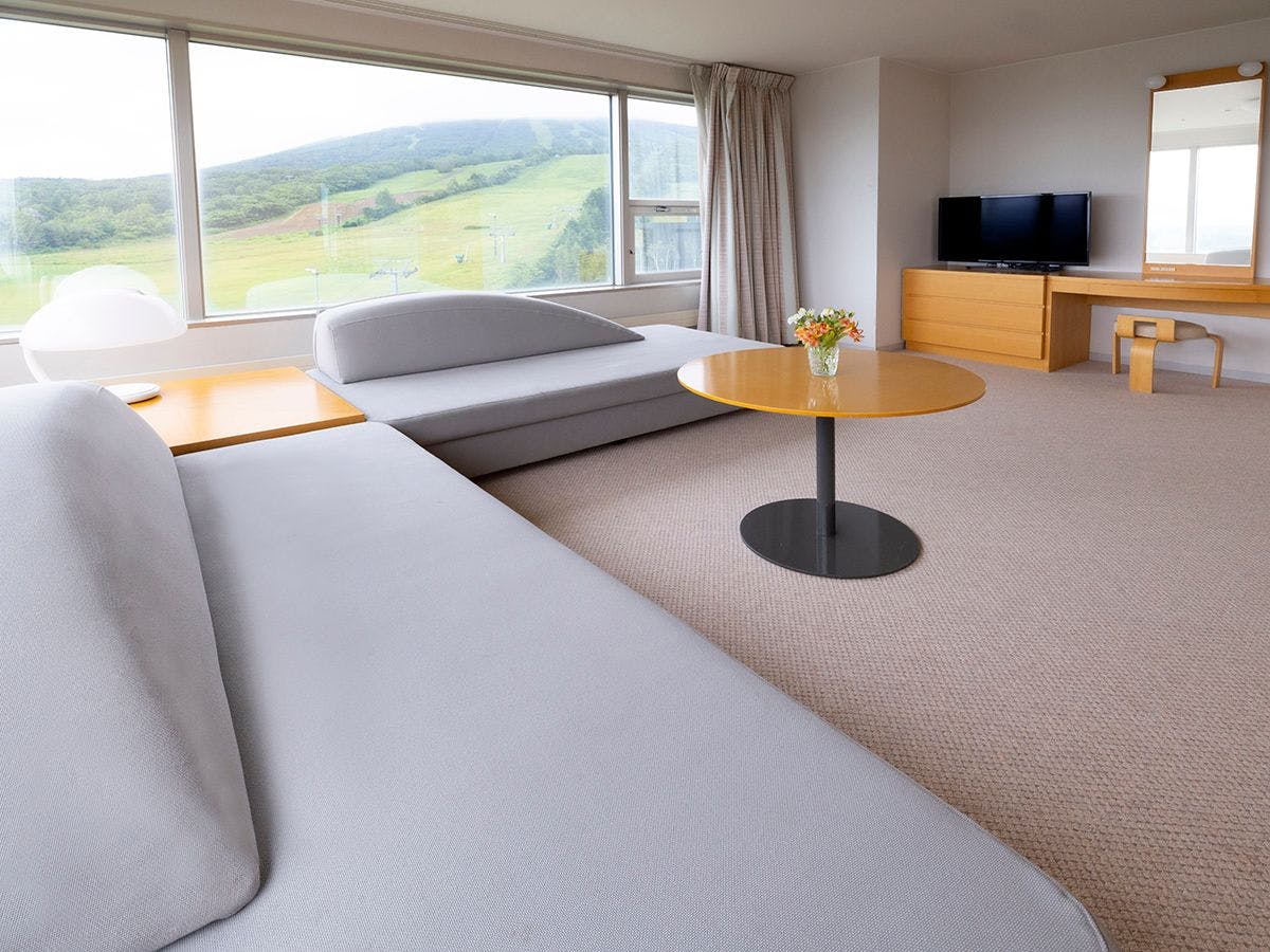 最大4名までお泊りいただける広々とした洋室窓からは冬にはゲレンデが、グリーンシーズンには季節ごとに色どりを見せる前森山の風景が目の前に広がる。