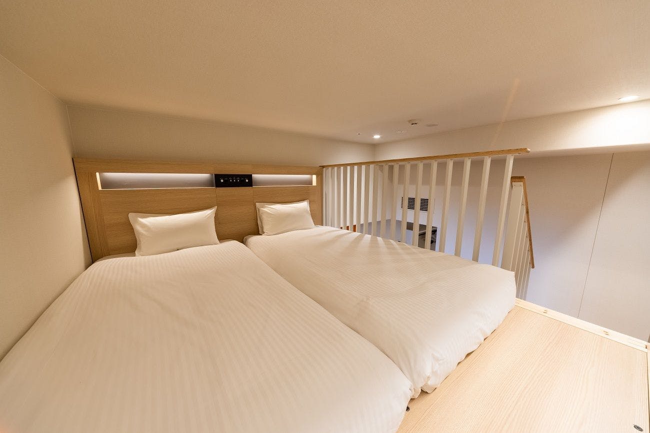 ベッド(1110×1970)×2台とお布団2組ご利用で最大4名様までご宿泊いただけます。