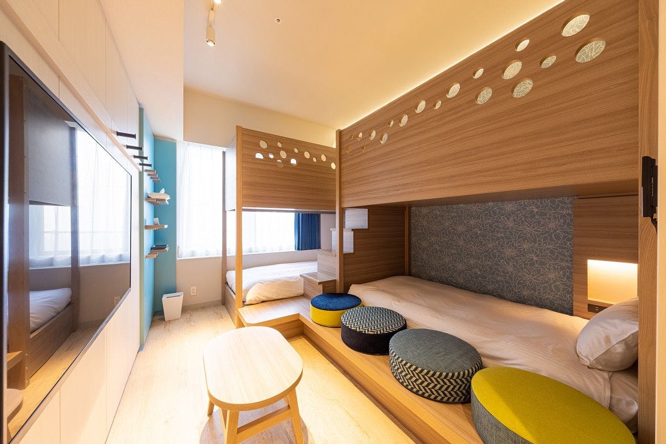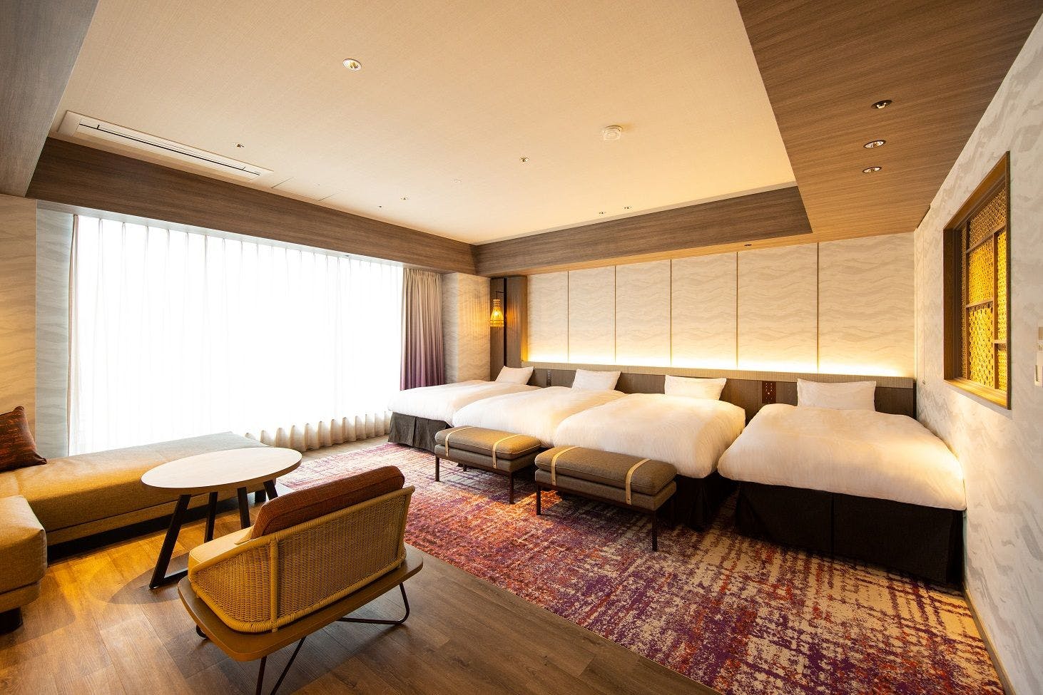 通常2名様でご案内の33平米のお部屋にベッド(1108×1968)×2台とエキストラベッド(1020×1880)×2台ご利用で最大4名様まで宿泊いただけます。
