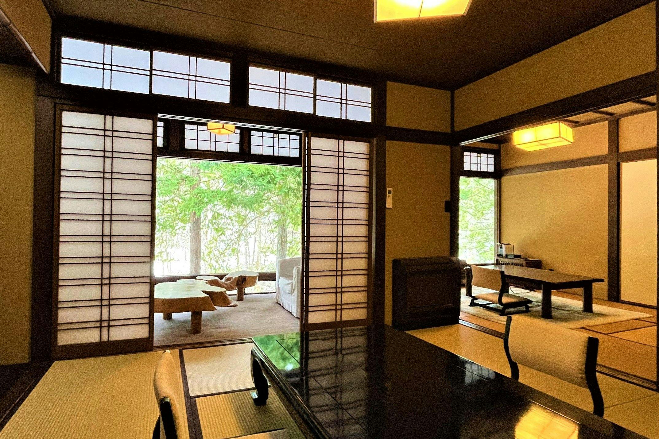 本館1階にある、本館で一番大きな三間続きのゆったりとしたお部屋です。大きな窓は一枚ガラスを使用しており、まるで一幅の絵に見立てたような、飛騨の四季折々の美しい景色がご覧になれます。窓のすぐ下は一級河川宮川を望むことができ、客室にいながら川のせせらぎを聞くことができます。
