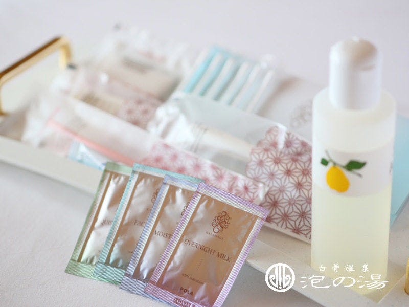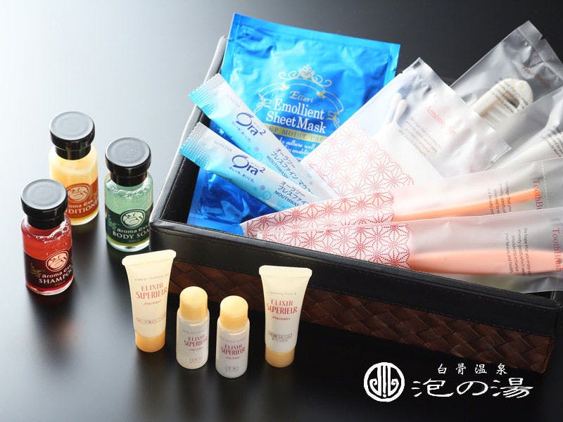タオル/バスタオル(2種類)/浴衣(2枚)/巾着袋/歯ブラシ/ヘアブラシ/カミソリ/コットン/綿棒/マウスウォッシュ/フェイスマスク/男性用ローション/女性用シャンプーセット30ml(POLA)/